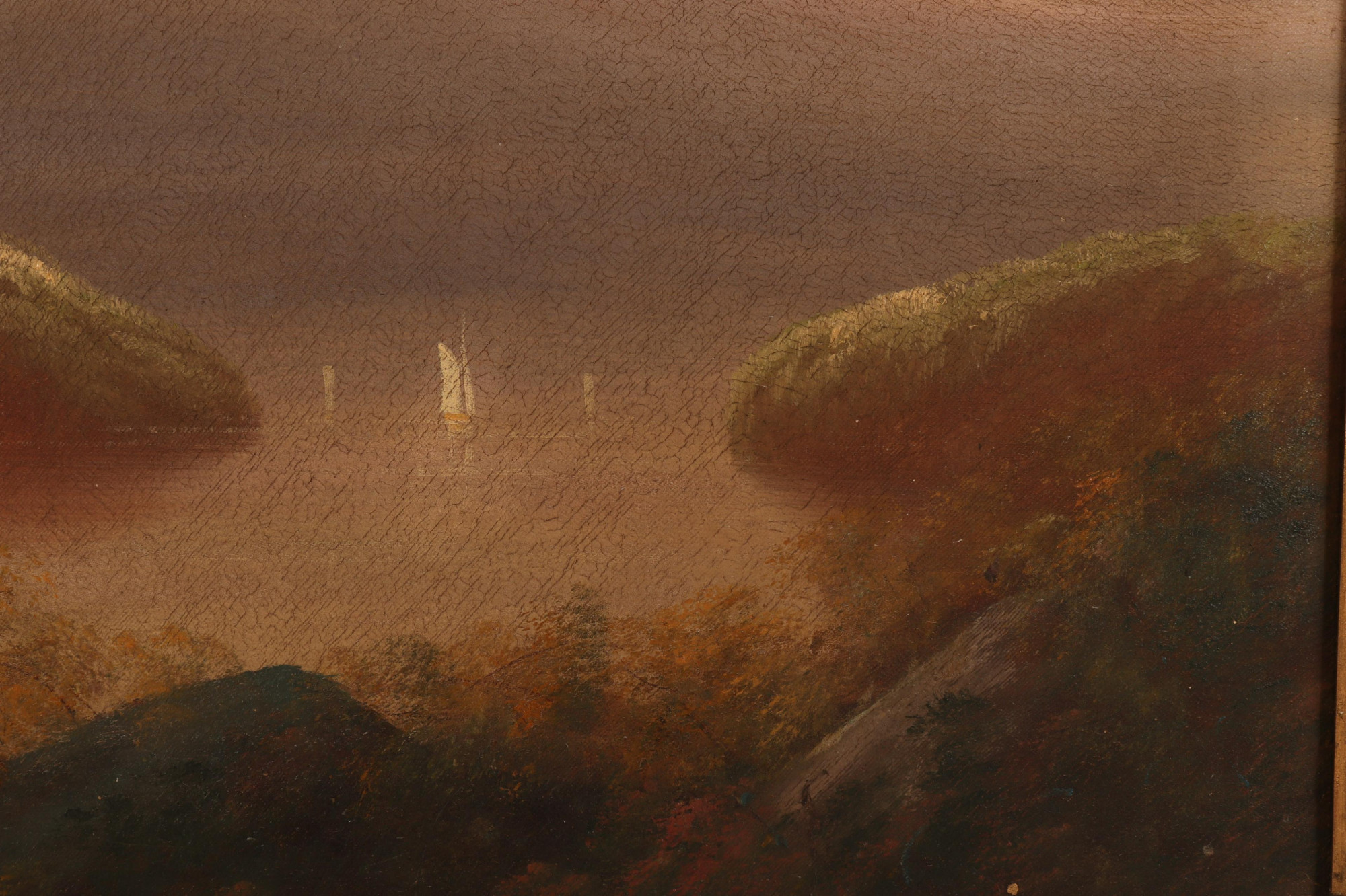 Single peaked mountain, sailboats. Not signed. Deep wood moulding gilt painted frame. Dimensions: Sight 21.25"H x 35 framed 27.5 x 41.5 (BSTA6137)(JP)