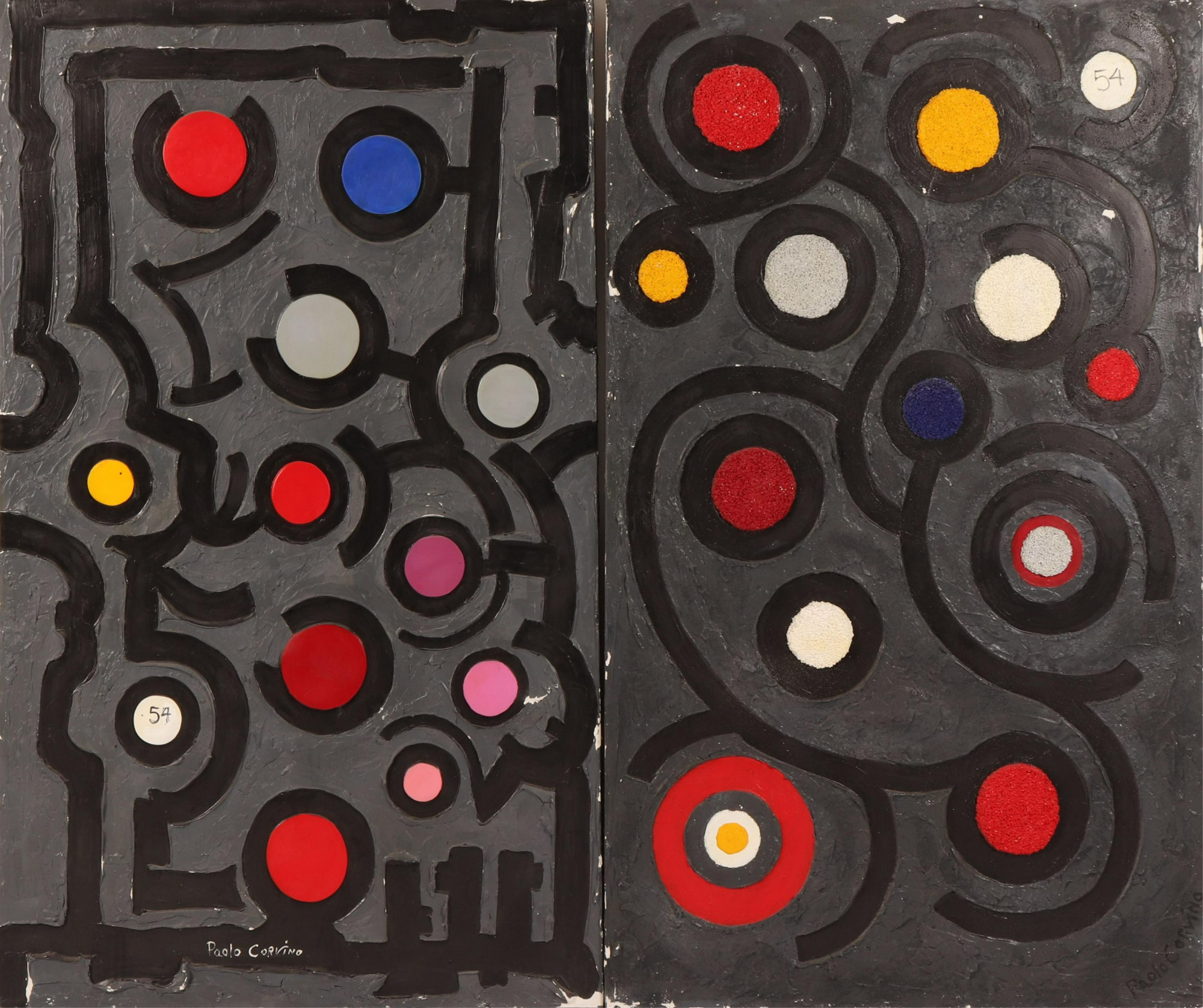 Paolo Corvino (American, 1930-2015) Fresco style mixed media in charcoal gray coloring. On stretchers. Heavily textured, paint, sand texture, painted discs. "54" on painting. Signed. Dimensions: 60"H x 36 1.5" thick stretchers (PCOR6471/2)(JP)See More