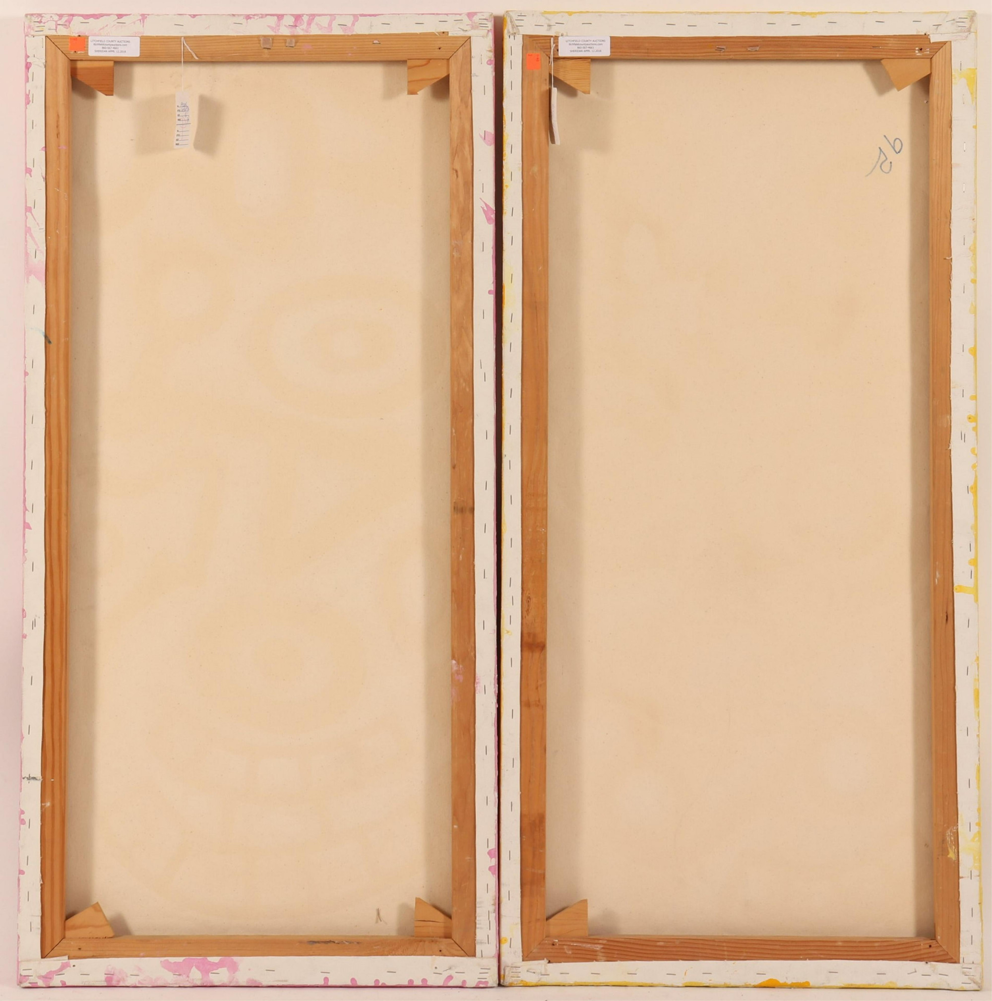 Paolo Corvino (American, 1930-2015) Fresco style painting with discs of textured material, painted in surface sand. On stretchers. One in a yellow and one in a dusty pink. Signed and "54" on each.