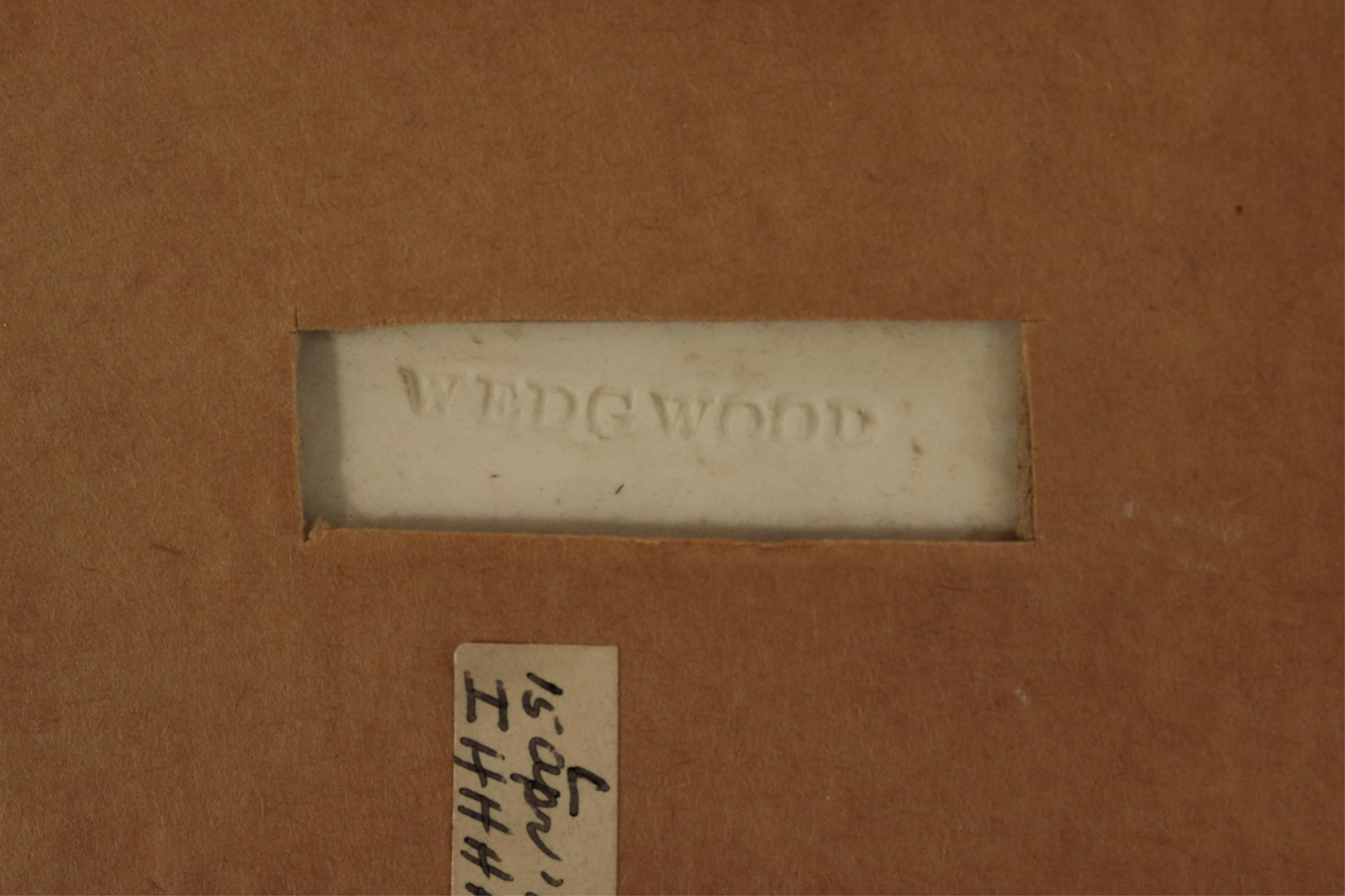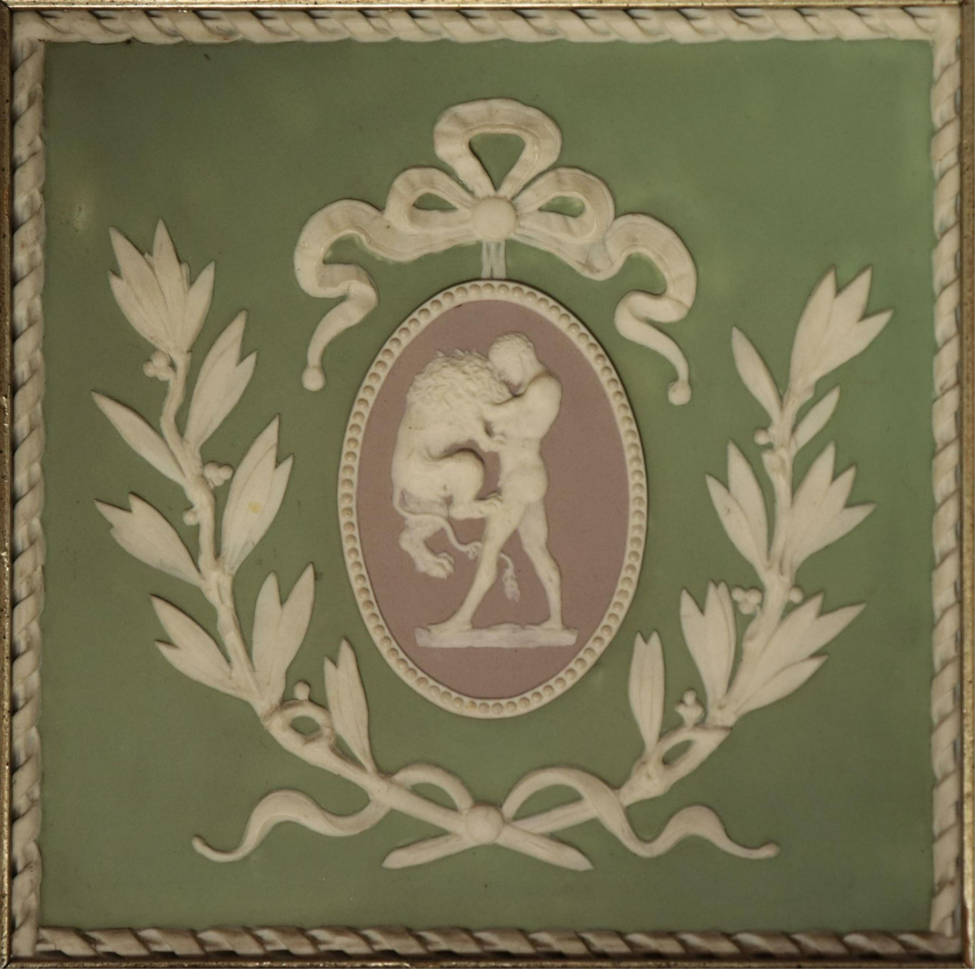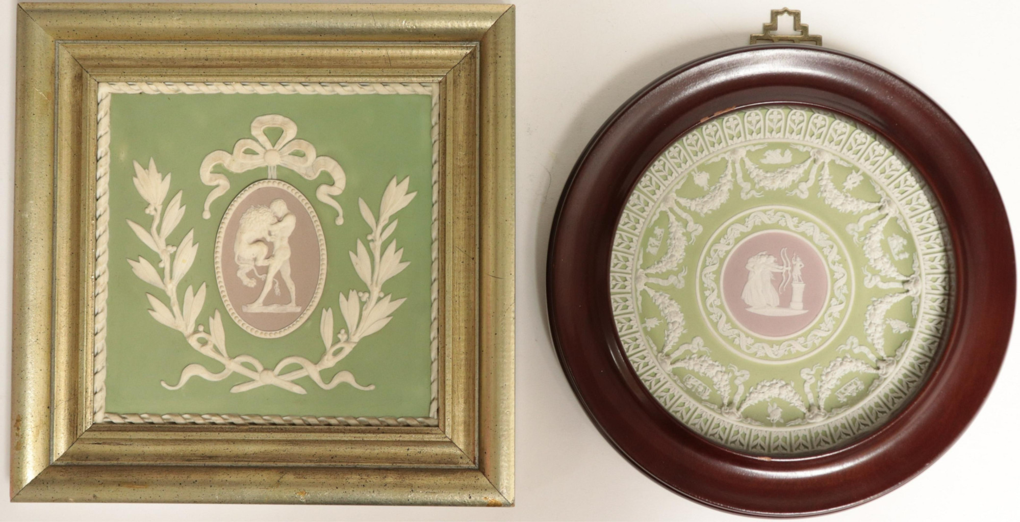 2 Wedgwood Tri-color Plaque/Plates, green, lavender and white, 'Hercules and the Lion' with large impressed mark and 'Huntress' with impressed mark (2 pc.) Part II from a major collection of Wedgwood, Long Island, NY Dimensions: 7" square, frame 10" square, and 7" dia., frame 9 1/4" dia. (ZWED4683/2)(WT)See More