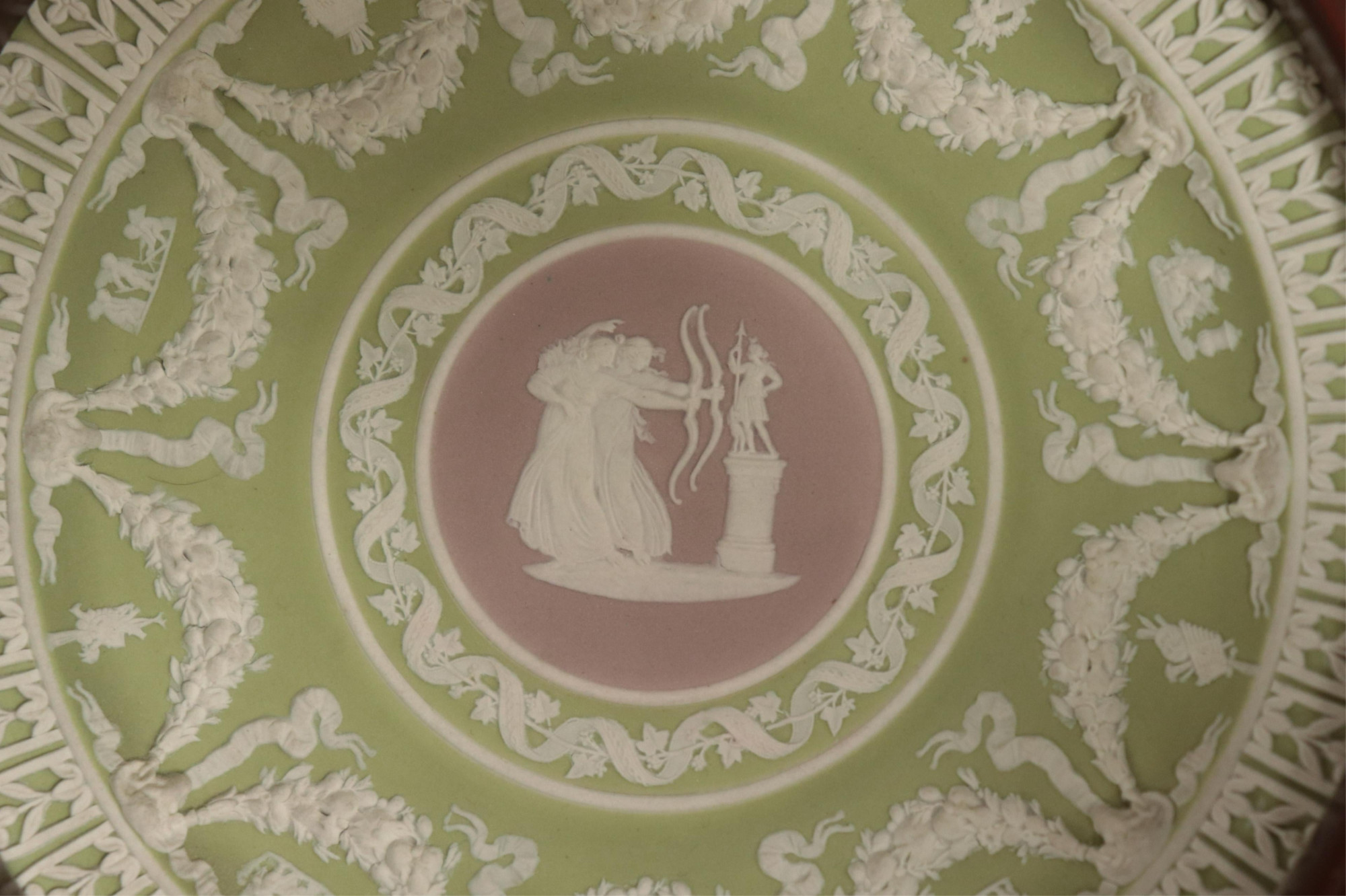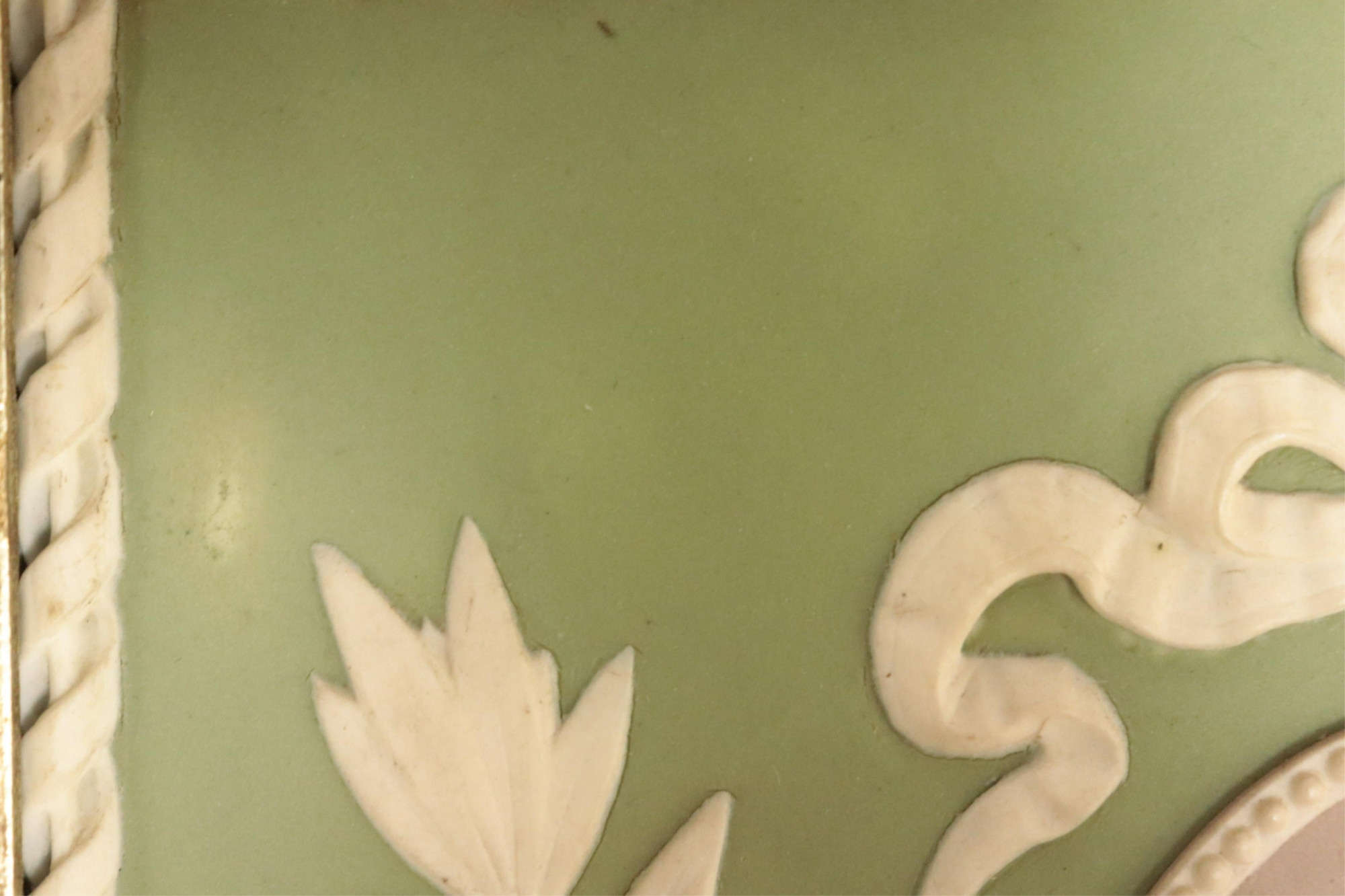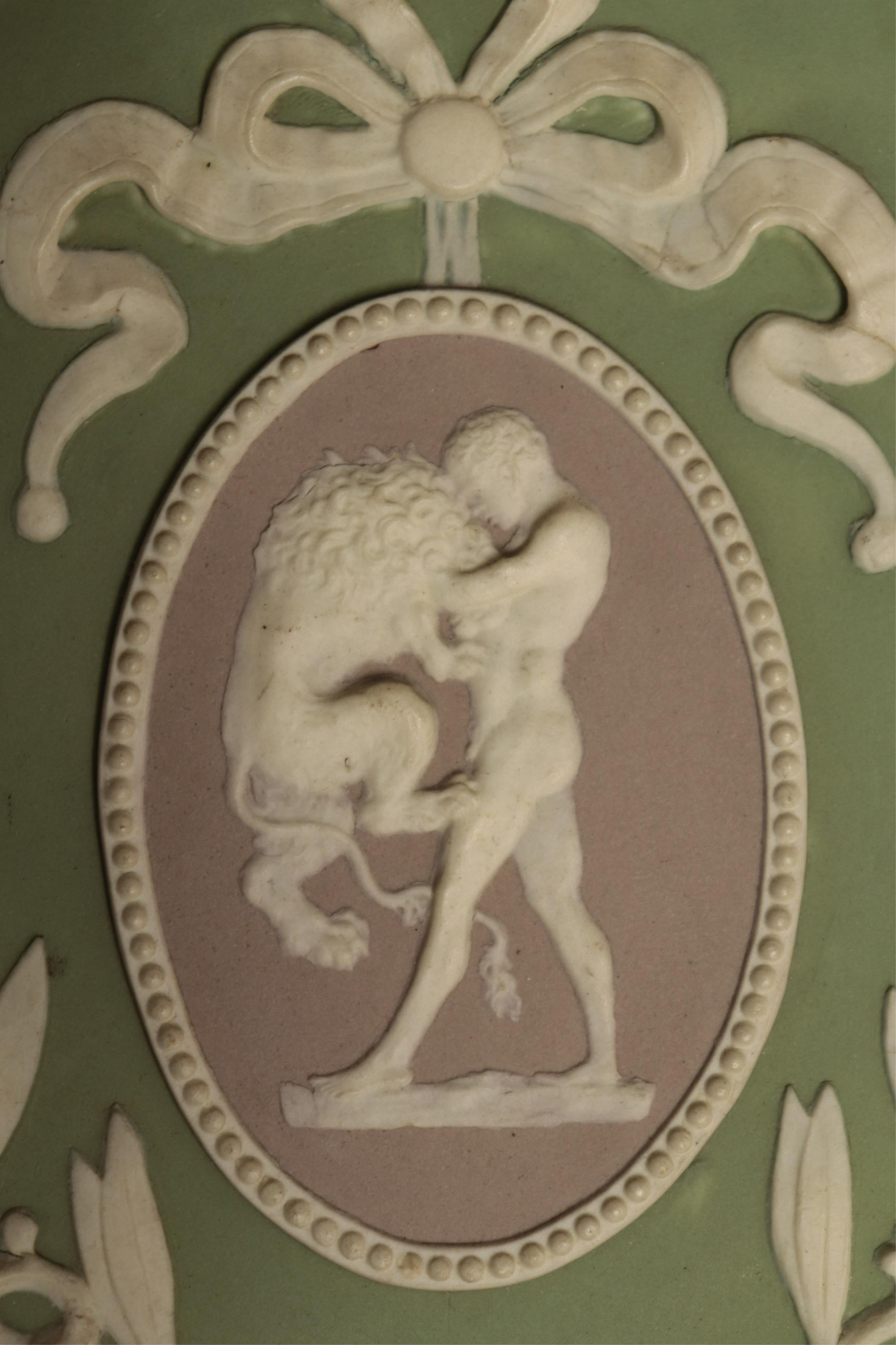 2 Wedgwood Tri-color Plaque/Plates, green, lavender and white, 'Hercules and the Lion' with large impressed mark and 'Huntress' with impressed mark (2 pc.) Part II from a major collection of Wedgwood, Long Island, NY Dimensions: 7" square, frame 10" square, and 7" dia., frame 9 1/4" dia. (ZWED4683/2)(WT)See More