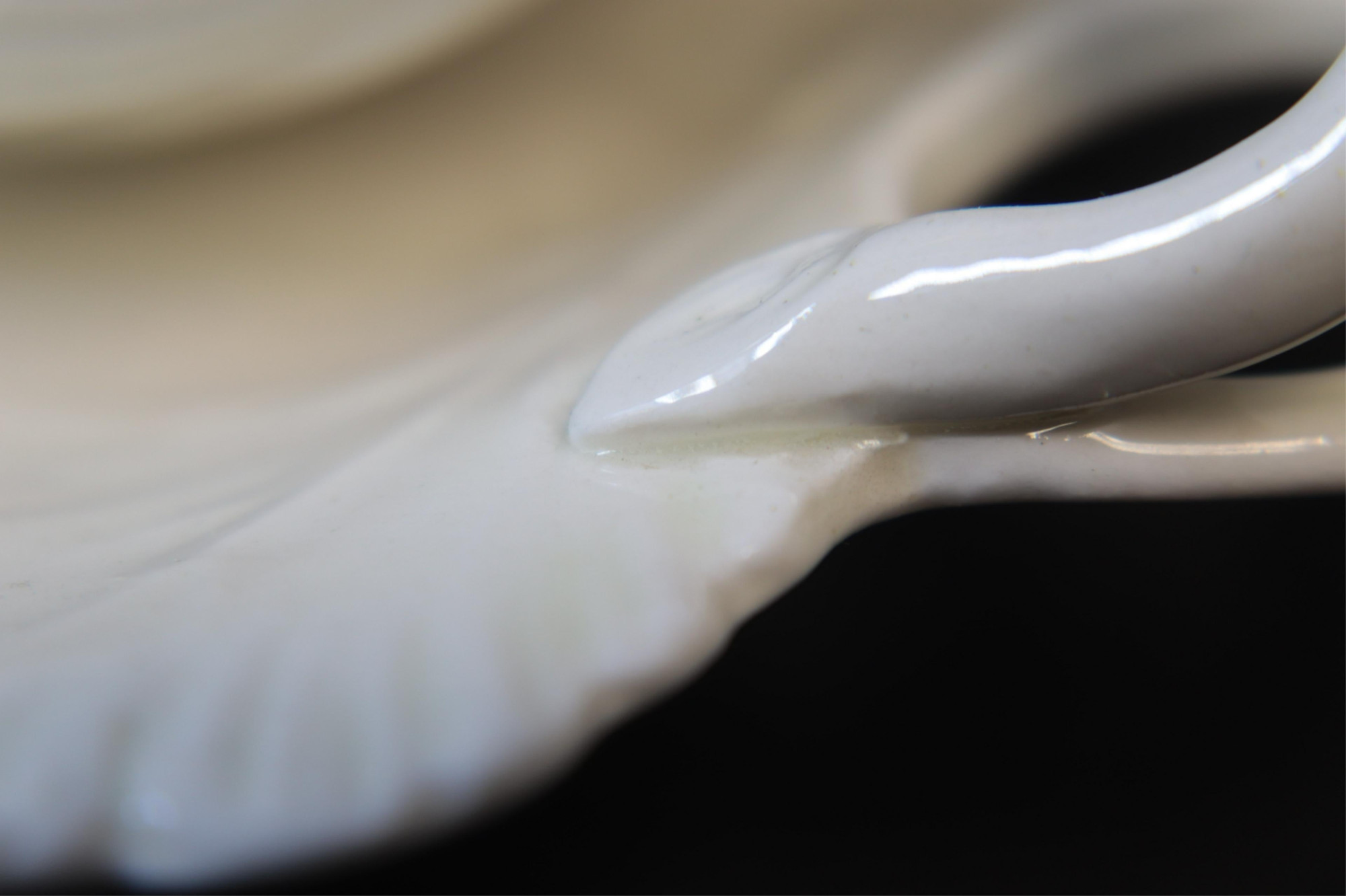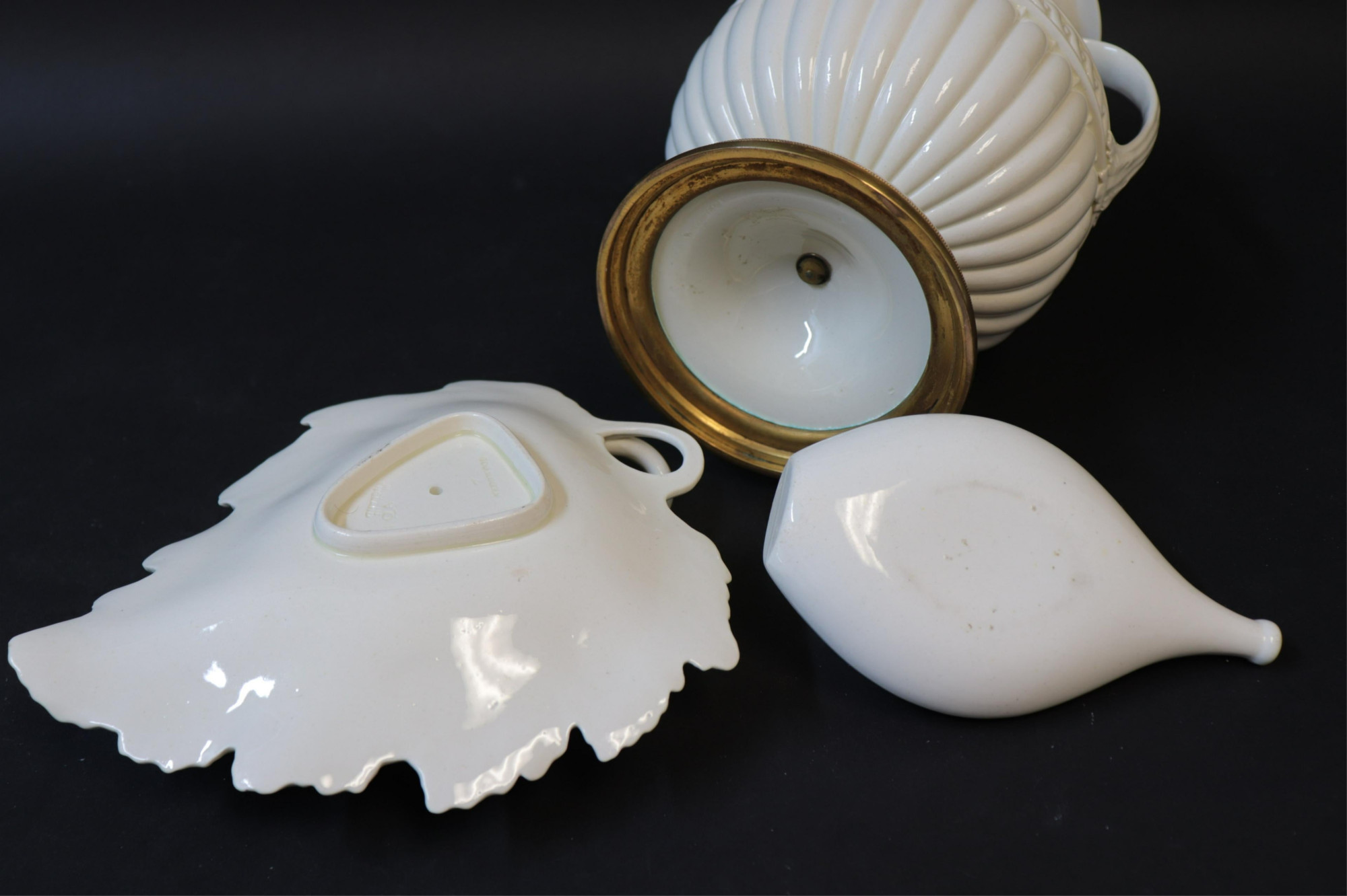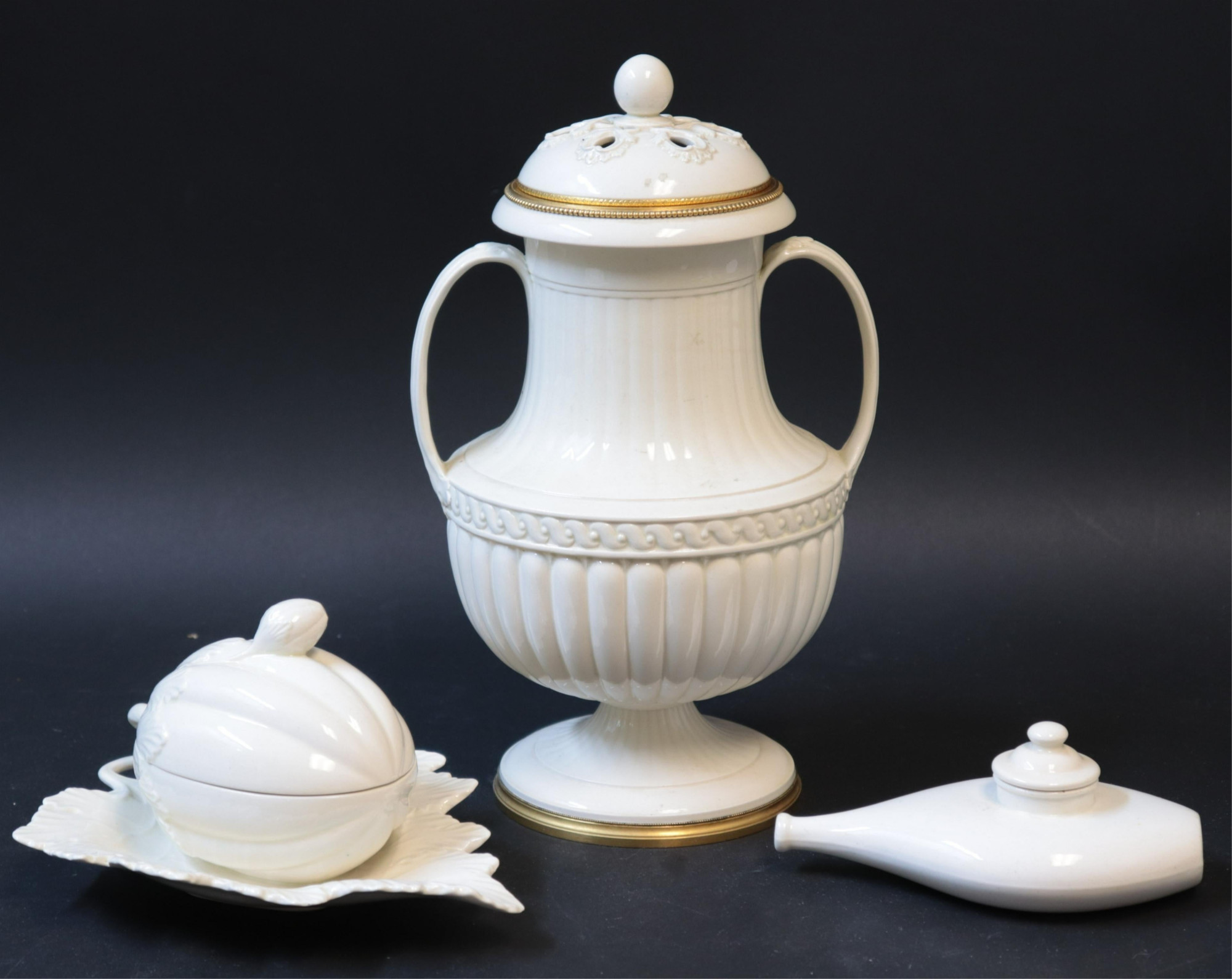 3 Wedgwood Creamware/Porcelain Vessels, gilt bronze mounted covered urn with impressed mark, covered melon/leaf dish with impressed mark & Made in England, pap boat with impressed mark (3 pc.) Part II from a major collection of Wedgwood, Long Island, NY Dimensions: Urn 12" H x 7" W, pap 6" L (ZWED4489/3)(WT)