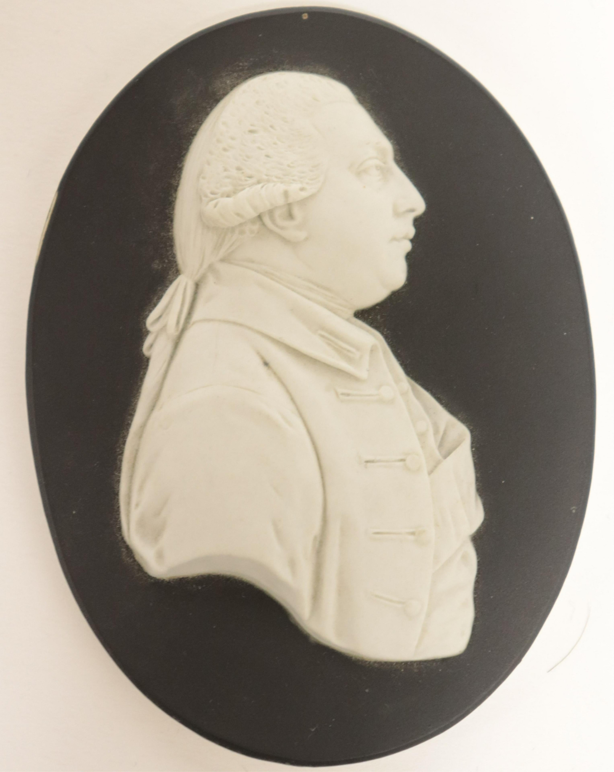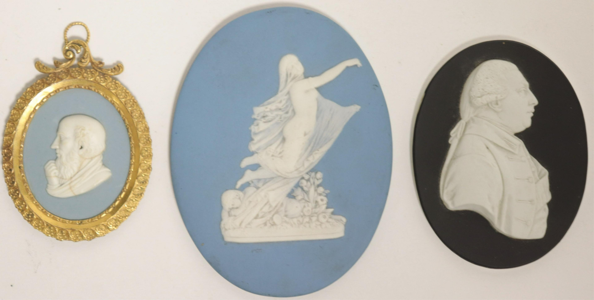 3 Wedgwood Small Cameos/Medallions, blue jasperware "Chrysippus" impressed lower case Wedgwood & Bentley & #45; "Sleep of Sorrow", impressed mark; and black jasper dip profile portrait bust, impressed mark (3 pc.)
