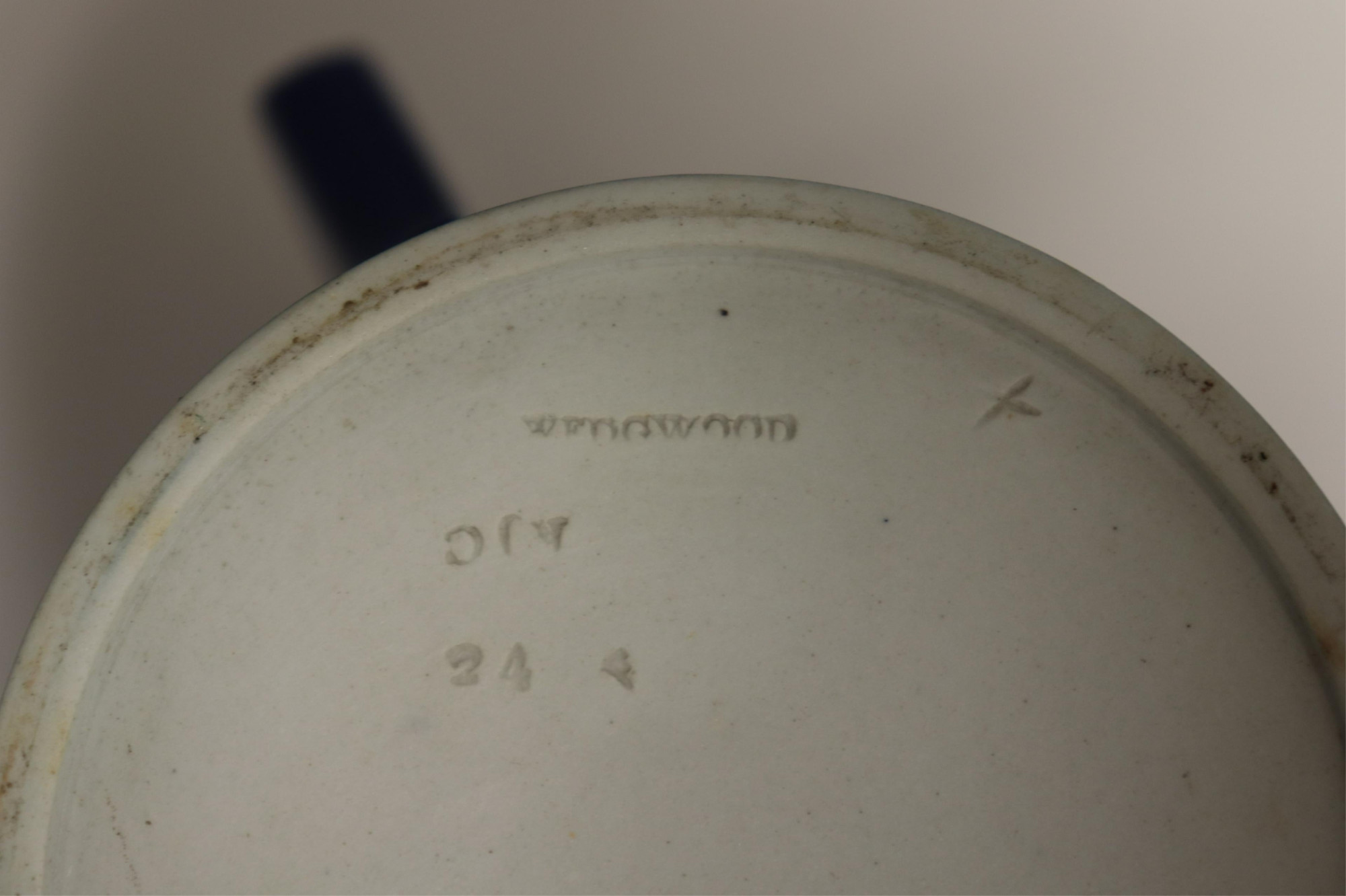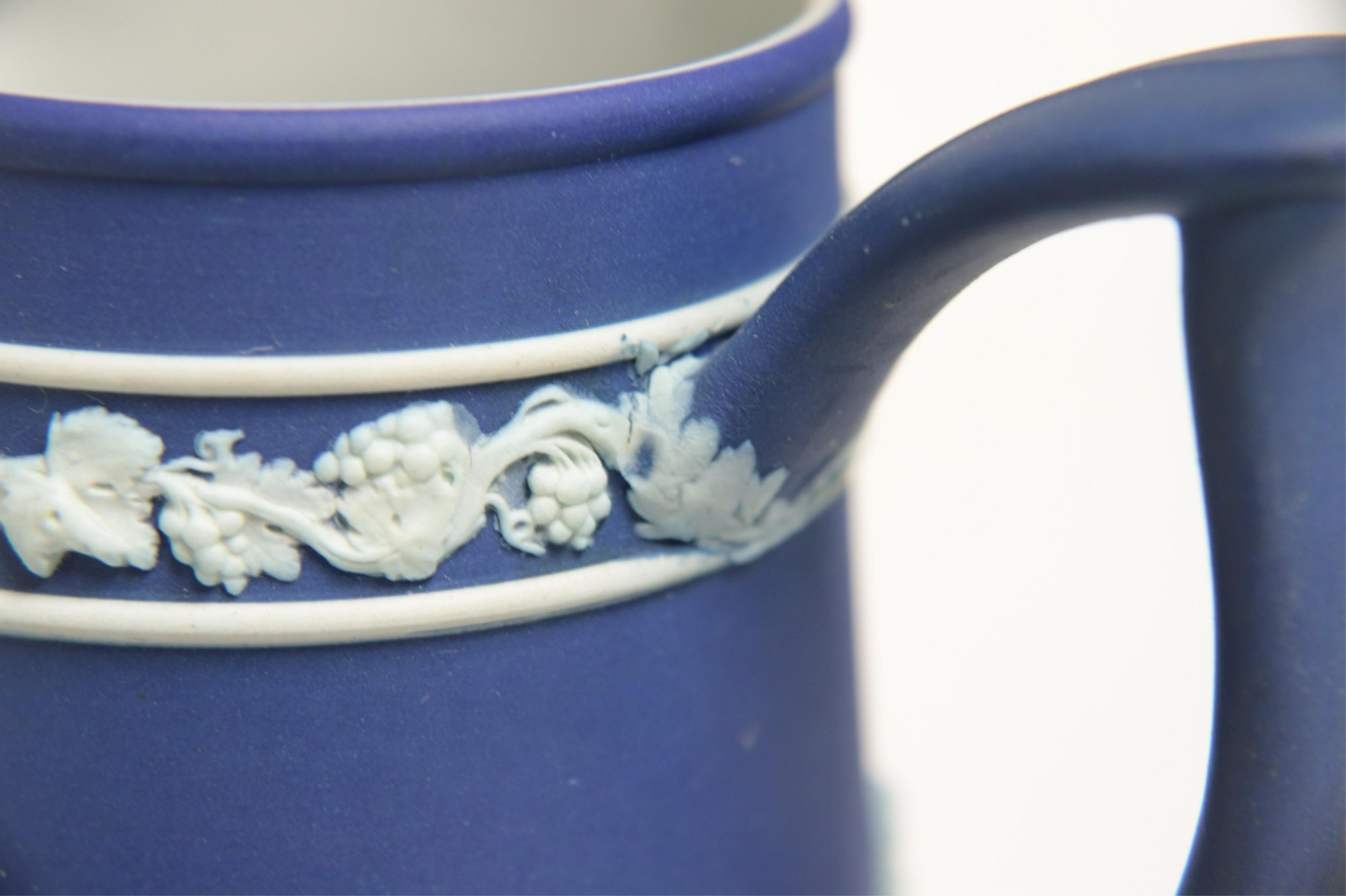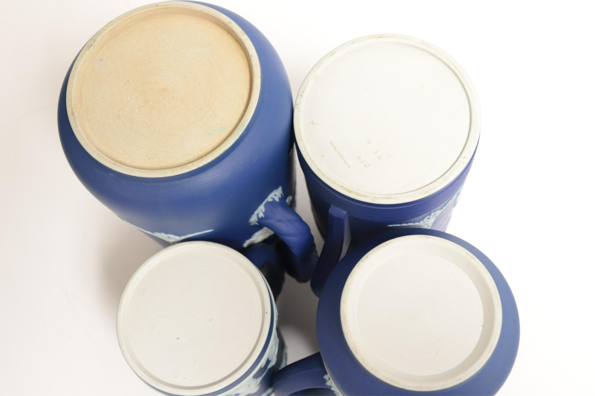 4 Wedgwood Dark Blue Jasper Dip Pitchers, 3 with impressed marks and impressed mark & England, 'Blind Man's Bluff' (4 pc.) Part II from a major collection of Wedgwood, Long Island, NY Dimensions: Bluff 7" H, shortest 5 1/2" (ZWES4658/4)(WT)