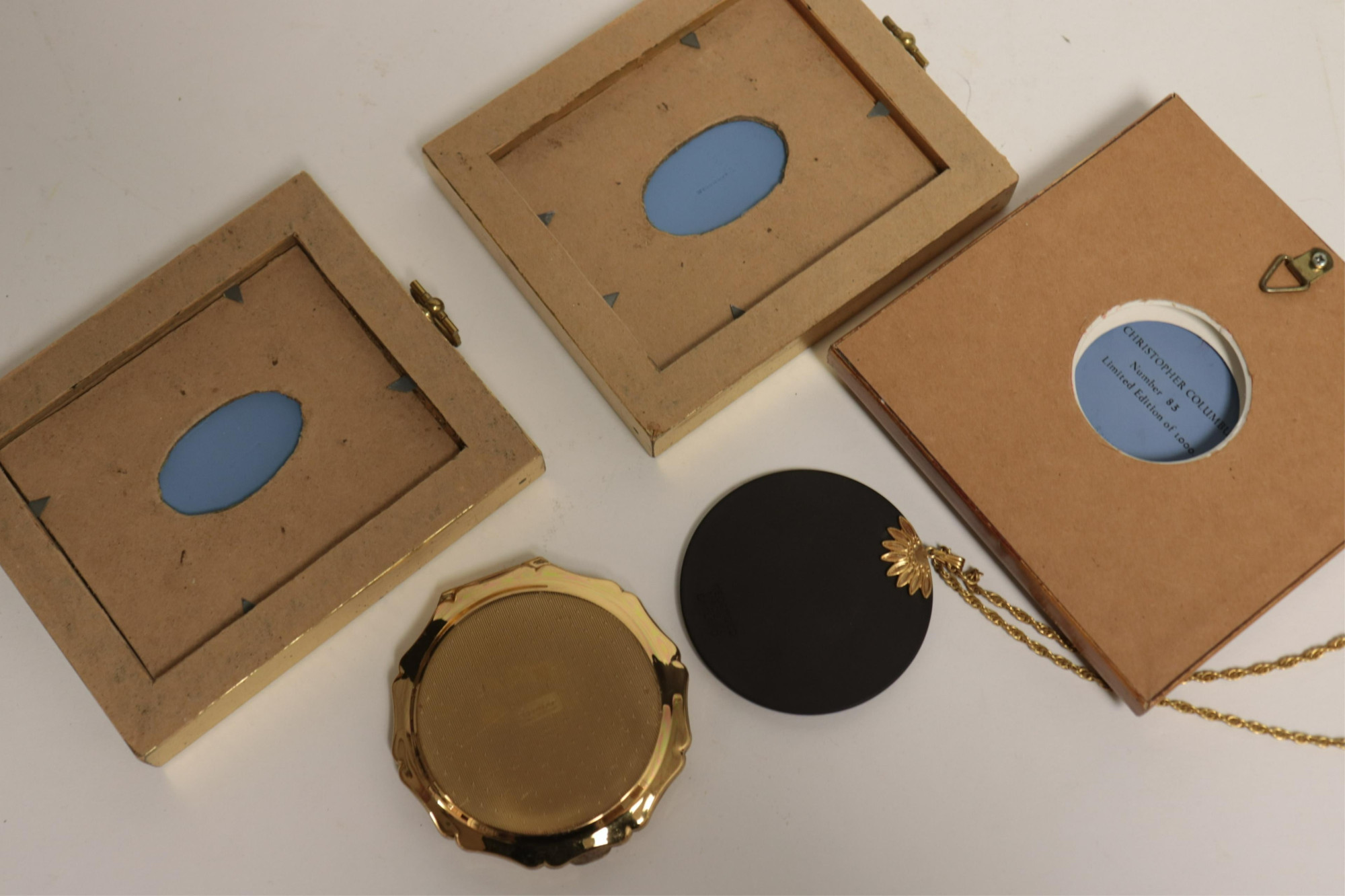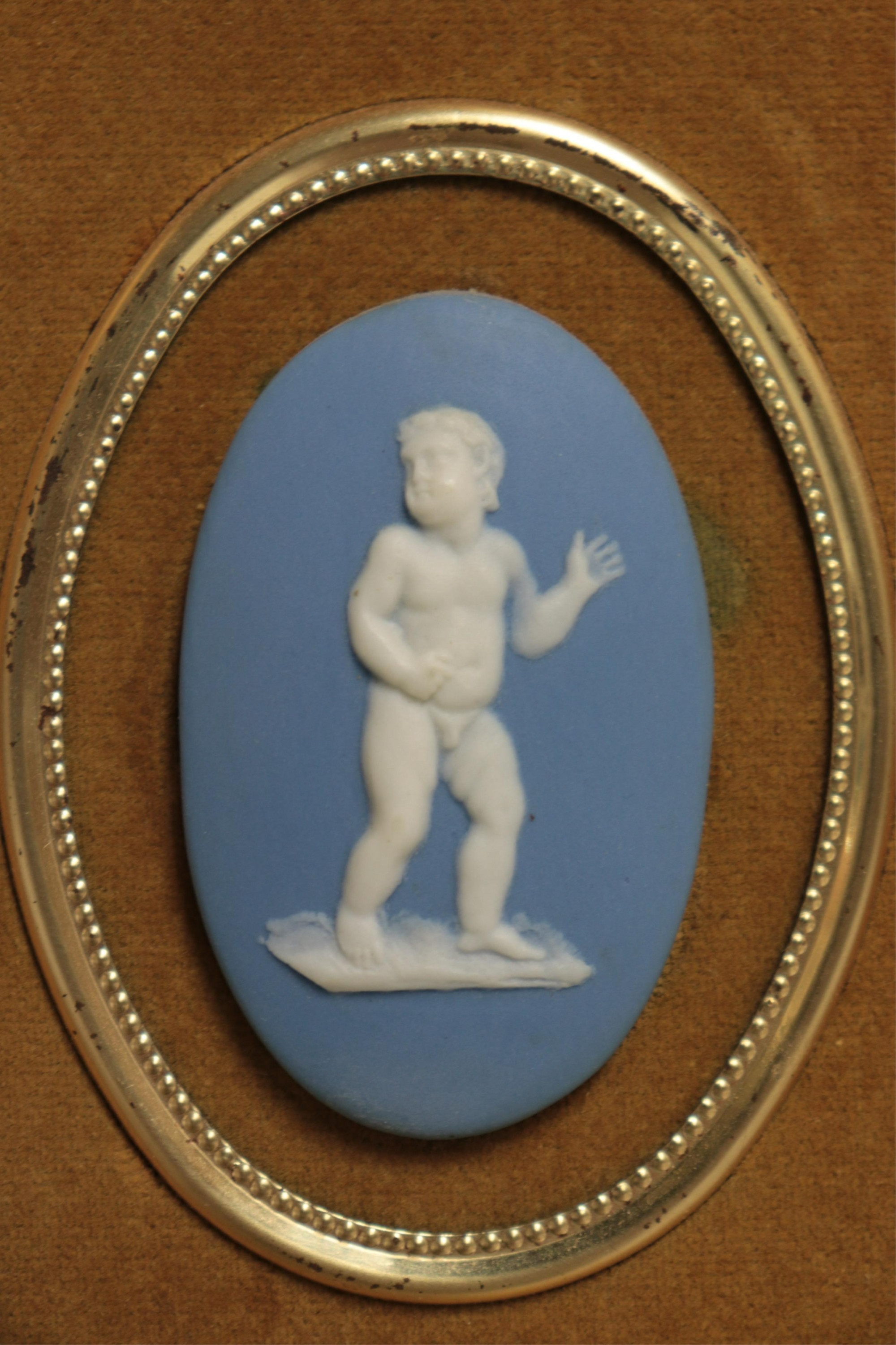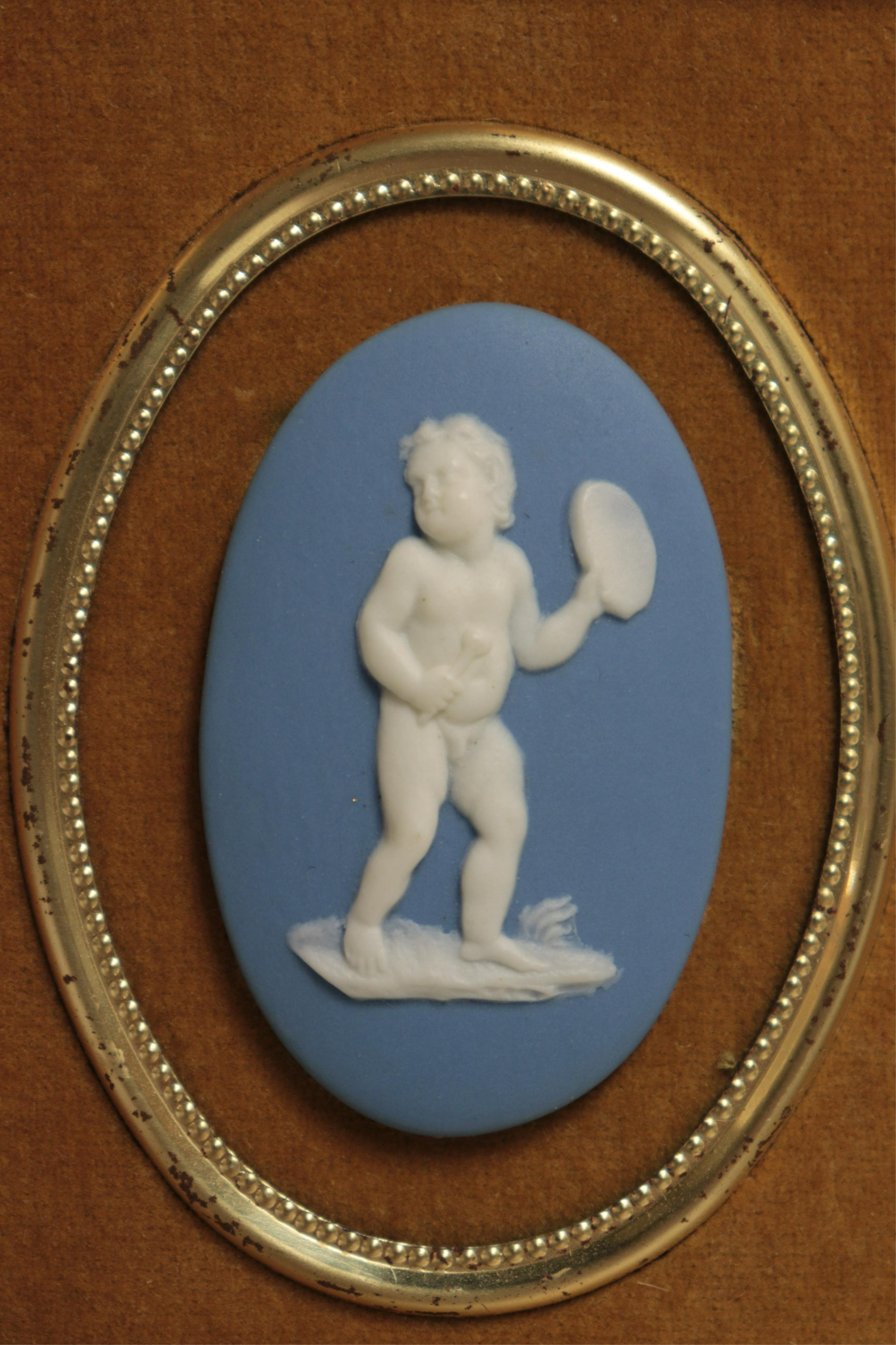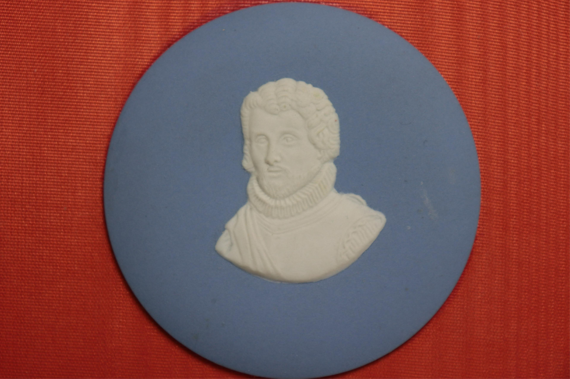 6 Small Wedgwood Cameos/Medallions, 5 blue jasperware, 2 with impressed marks, Christopher Columbus #83/1000 impressed mark & Made in England, 2 marks not visible, and black basalt Egyptian Queen Nefertiti in raised gold impressed mark & Made in England (6 pc.) Part II from a major collection of Wedgwood, Long Island, NY Dimensions: Queen 2 3/4" dia. (ZWED4685/6)(WT)See More