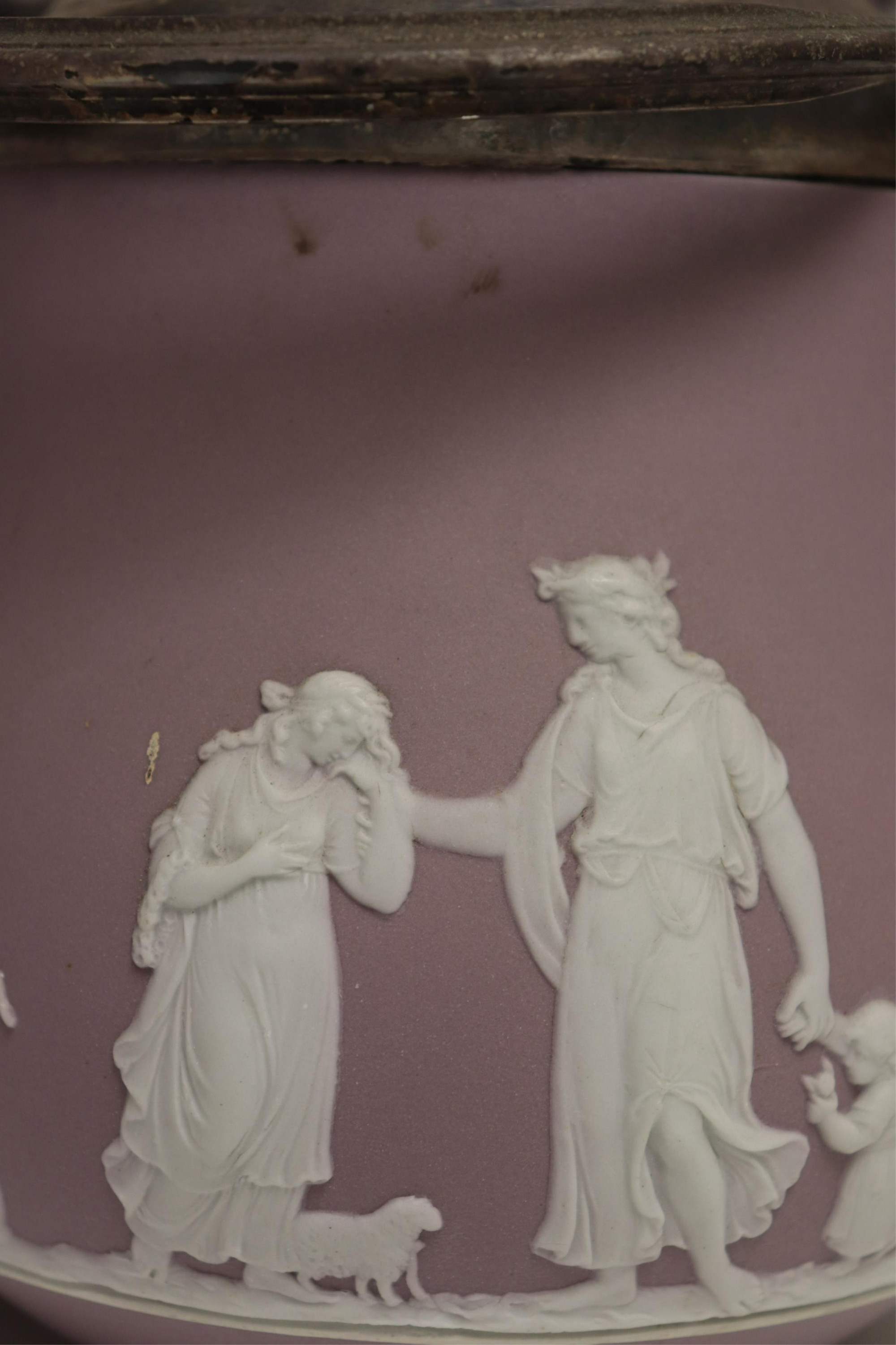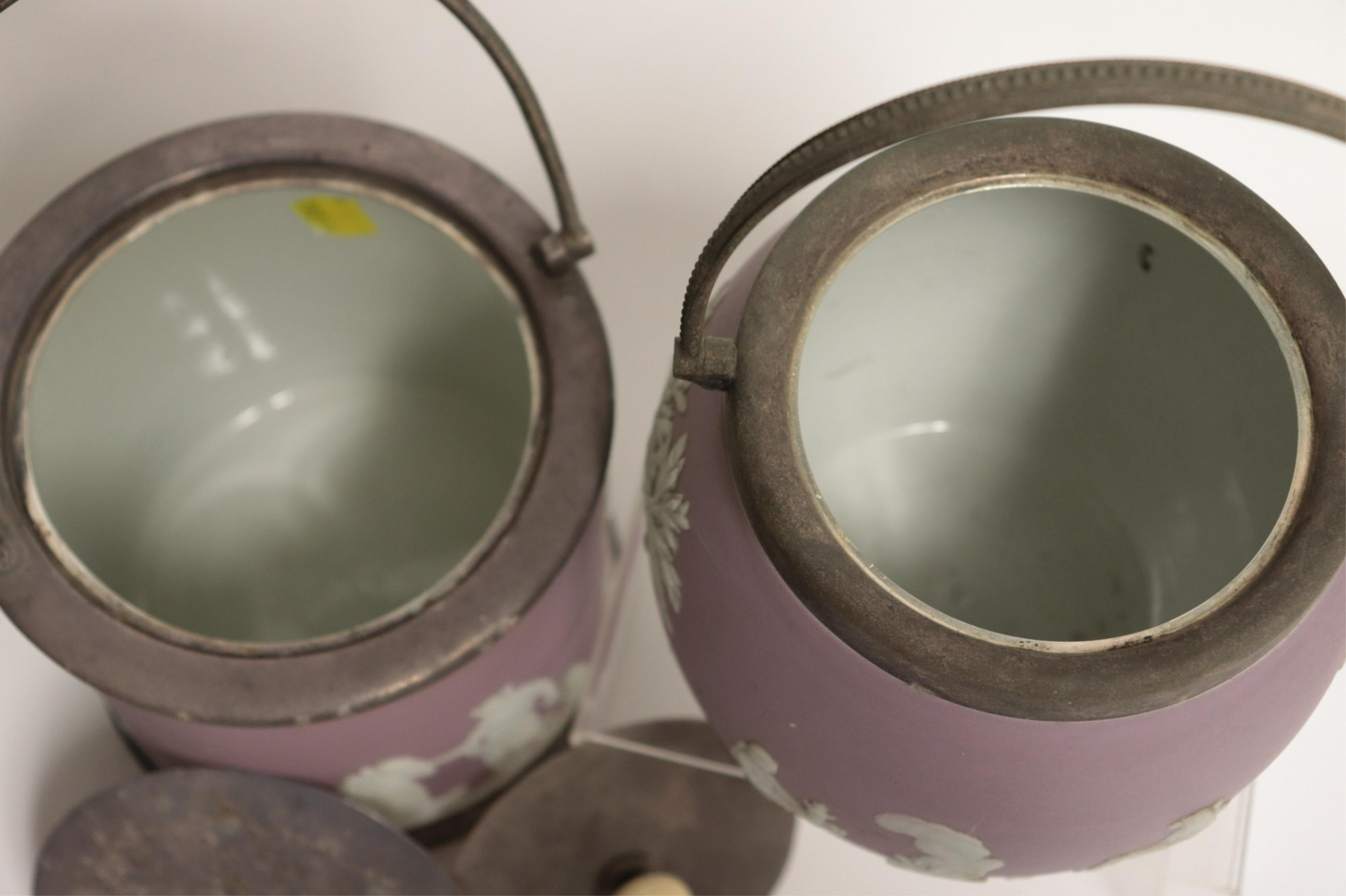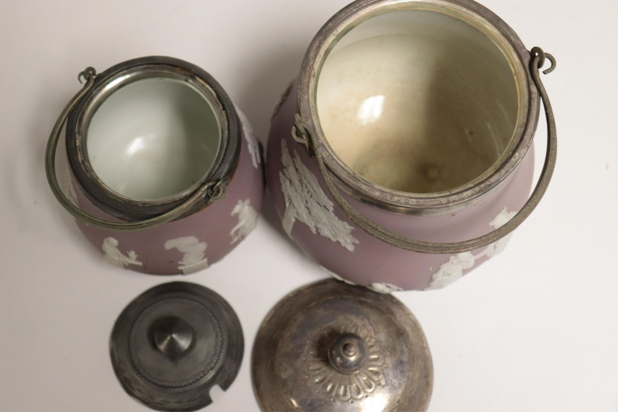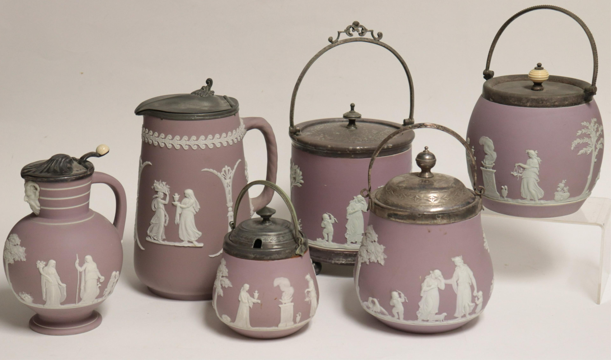 6 Silverplate/Pewter Covered Wedgwood Lavender Jasper Dip Containers, 3 biscuit jars, one jam pot and 2 ewers, impressed mark or WEDGWOOD ENGLAND (6 pc.)