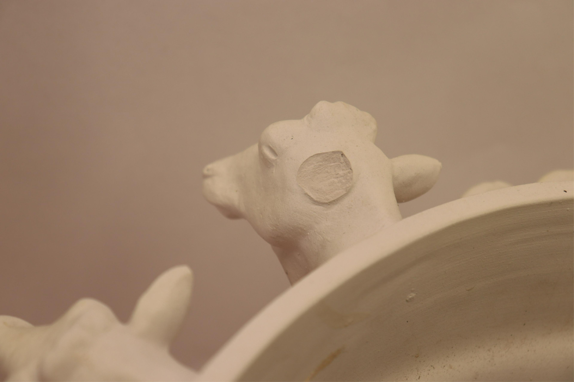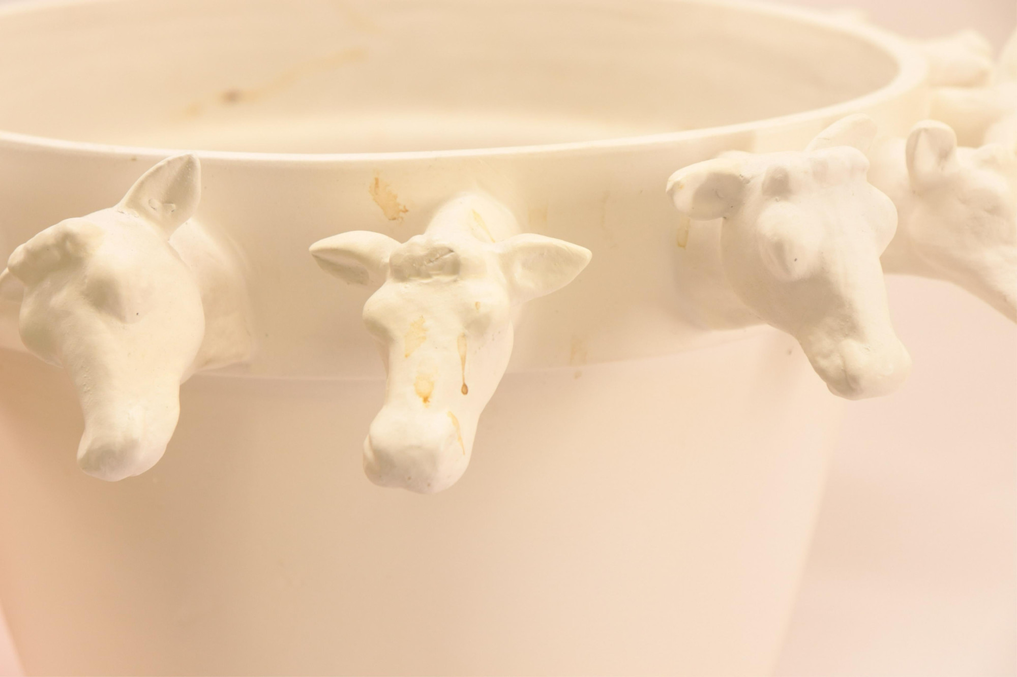 7 Red or Yellow Pottery Jardinieres, Planters, Cache Pots with cacti in the rim and one cow head planter in white Dimensions: 9 1/2" H x 6" Dia to 8" H x 9" Dia. (EBAZ5172/8)(WT)