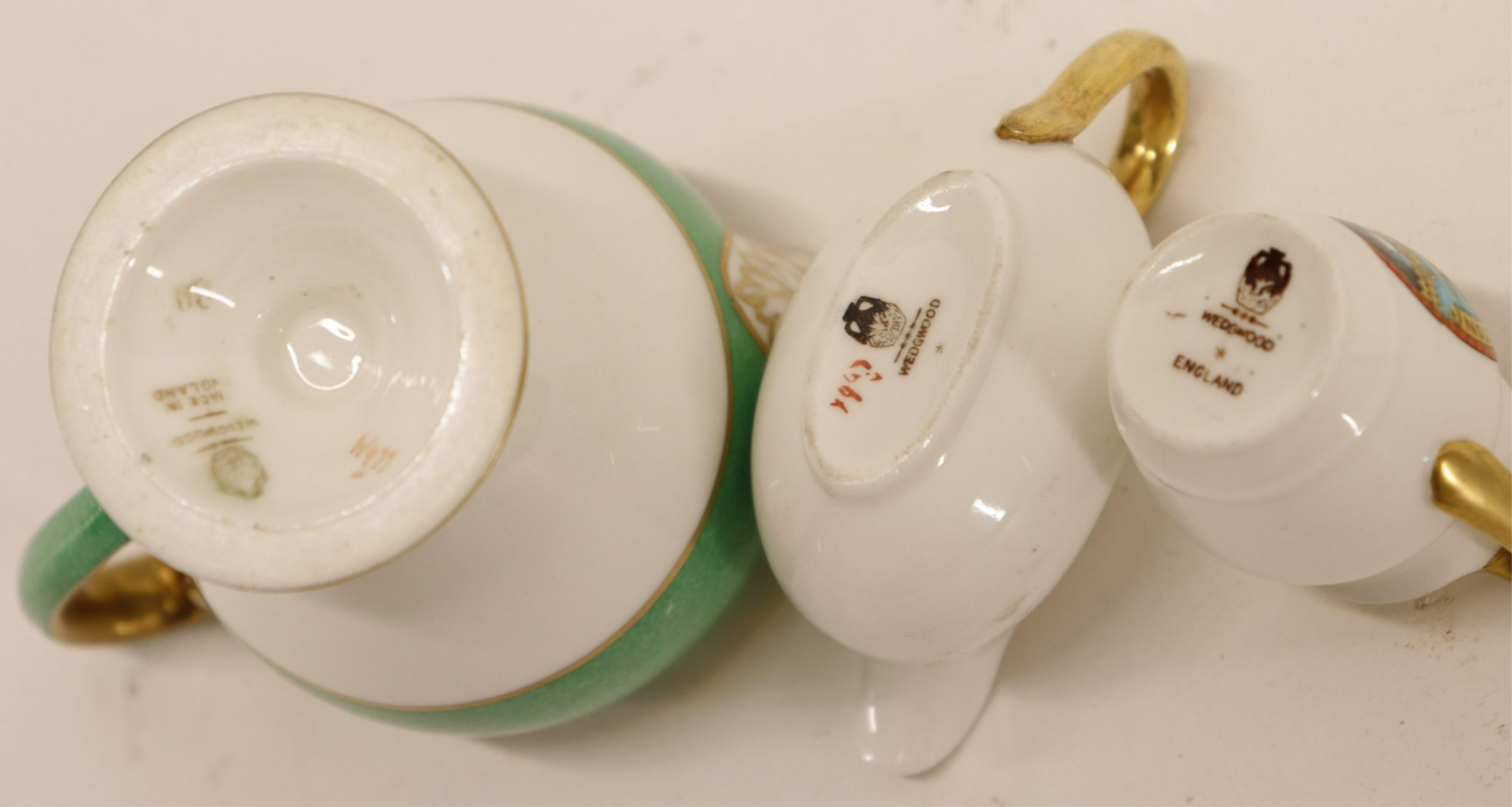 9 Assorted Wedgwood Pitchers, some lustre, various printed, impressed marks and Made in England marks (9 pc.) Part II from a major collection of Wedgwood, Long Island, NY Dimensions: Smallest 1 3/4" H, largest 7 1/2" H x 8" W (ZWED4472/9)(WT)