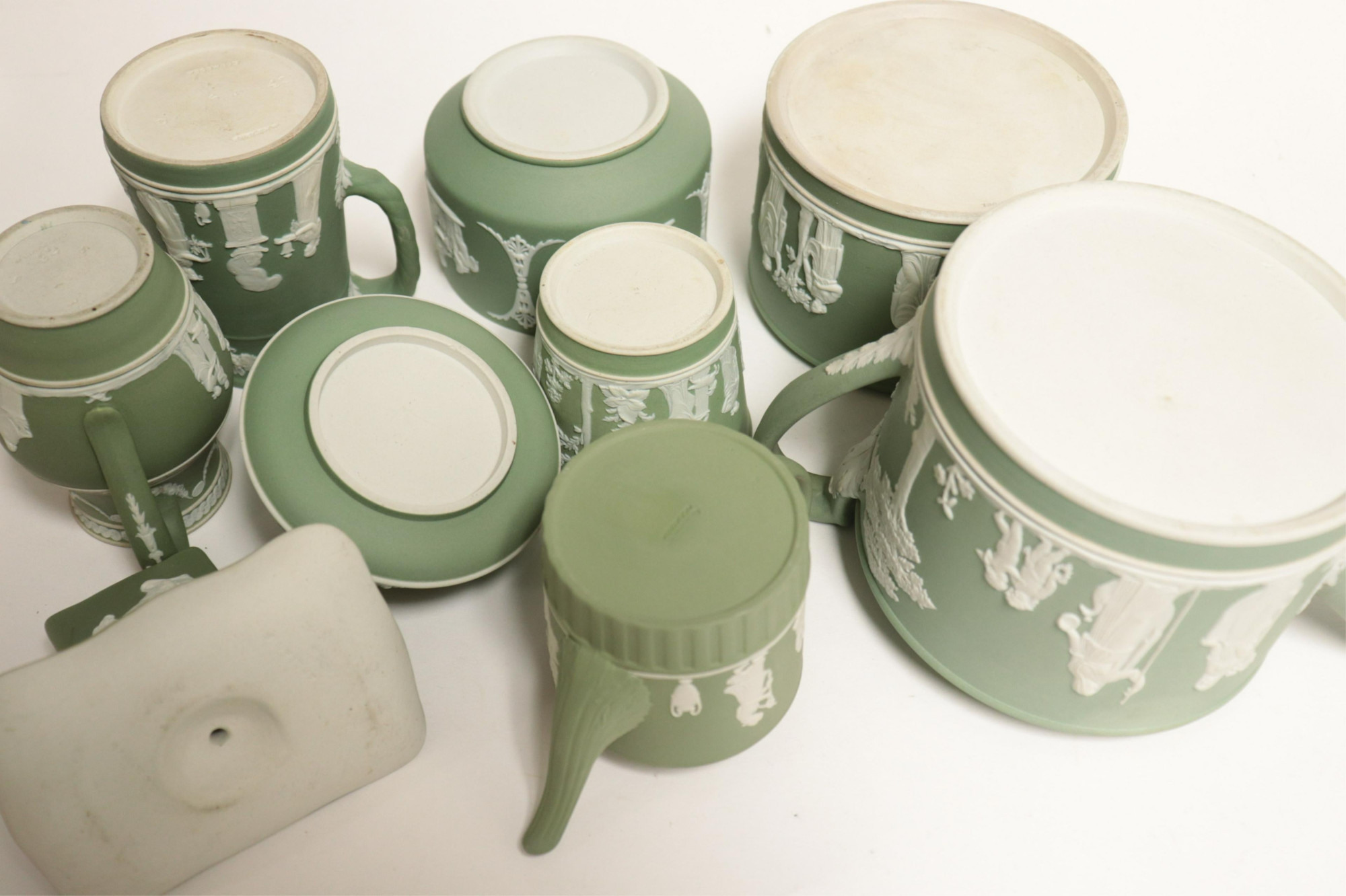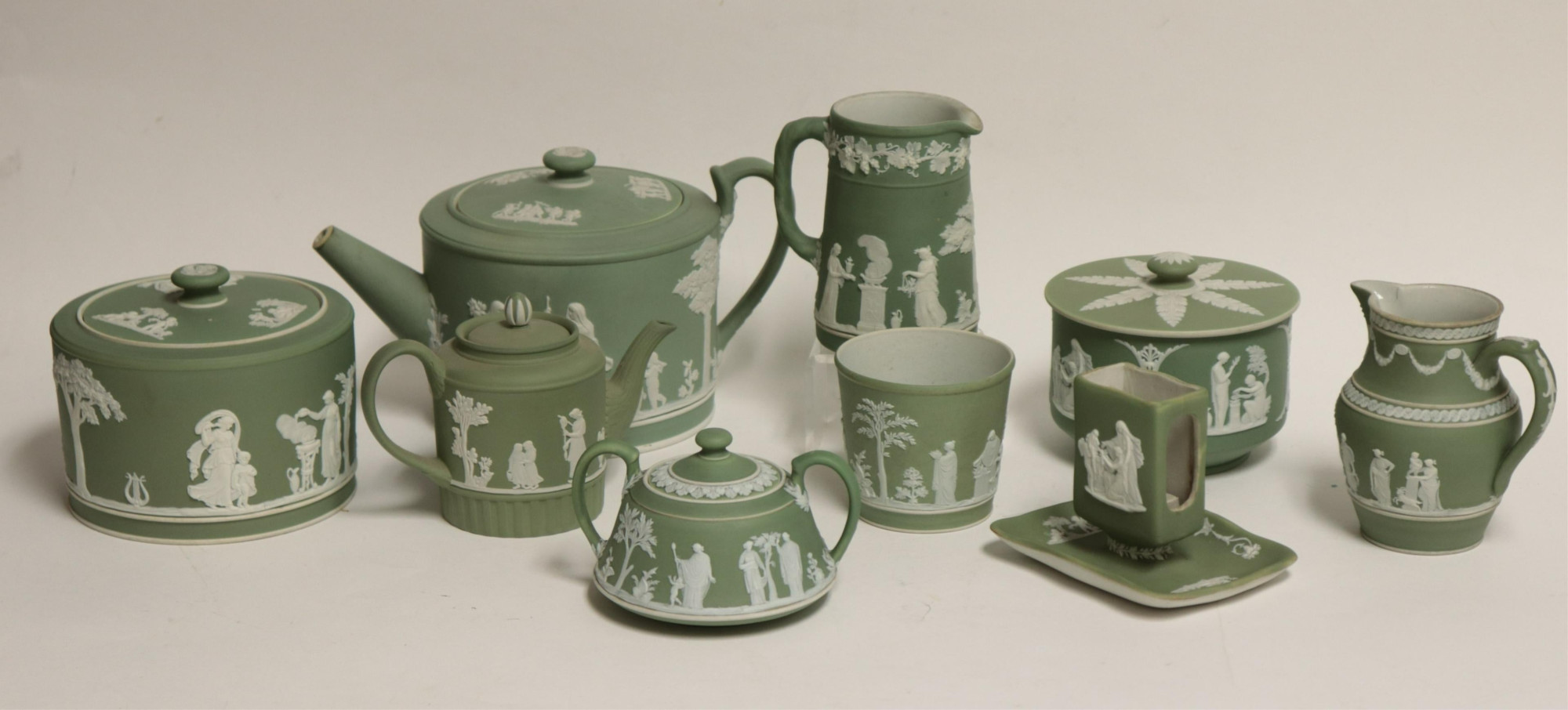 9 Wedgwood Green Jasper Dip Tea Wares, larger pot with impressed mark, smaller with impressed mark & Made in England, all others with impressed marks & England (9 pc.)