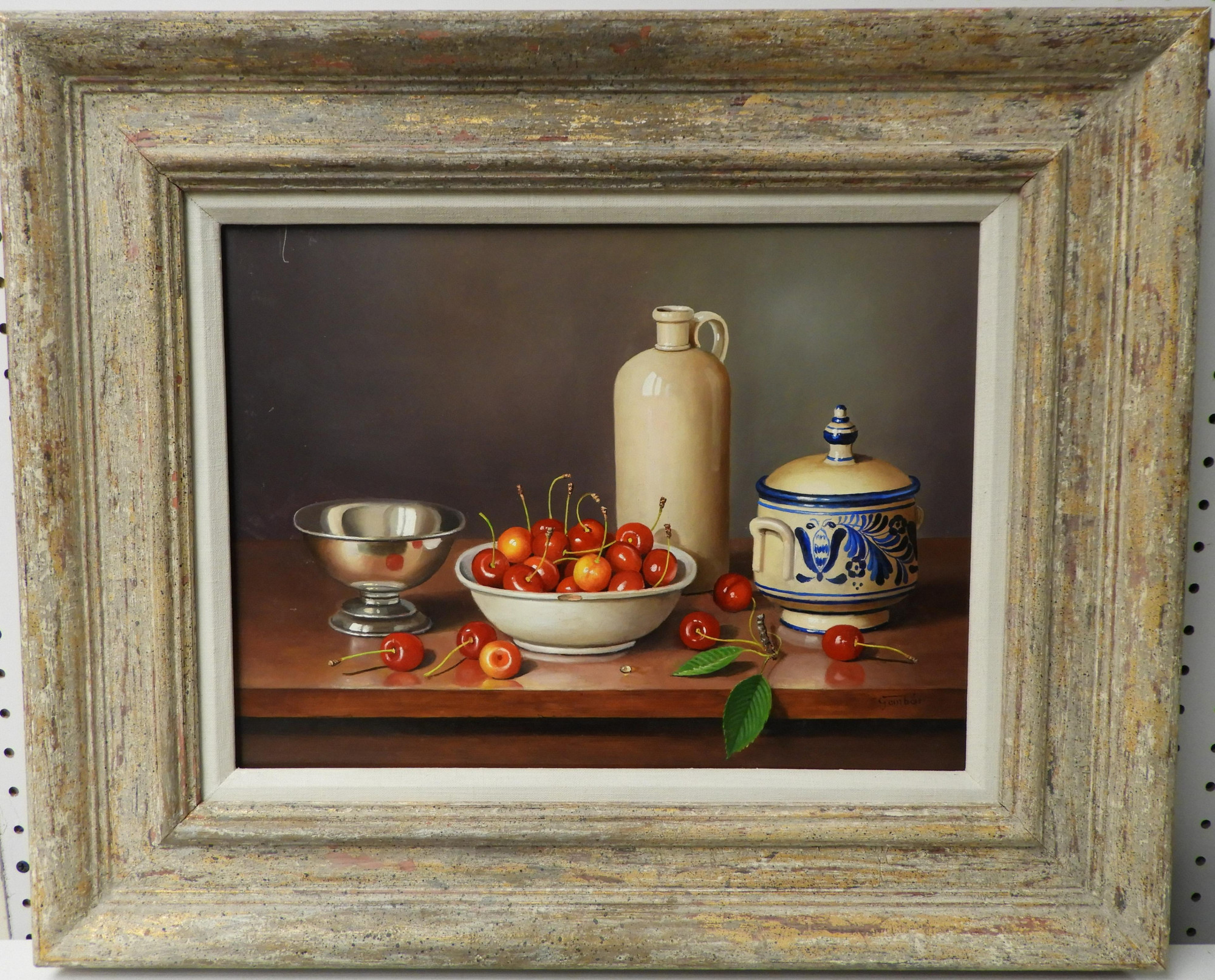 András Gombár (Hungarian, b. 1946). Oil on board of still life with cherries. Signed lower right. In Time White Brushed Frame. Property from a fourth generation gallery, NYC Dimensions: 12 x 16" framed: 20 x 24" (HEAR23)(EL)