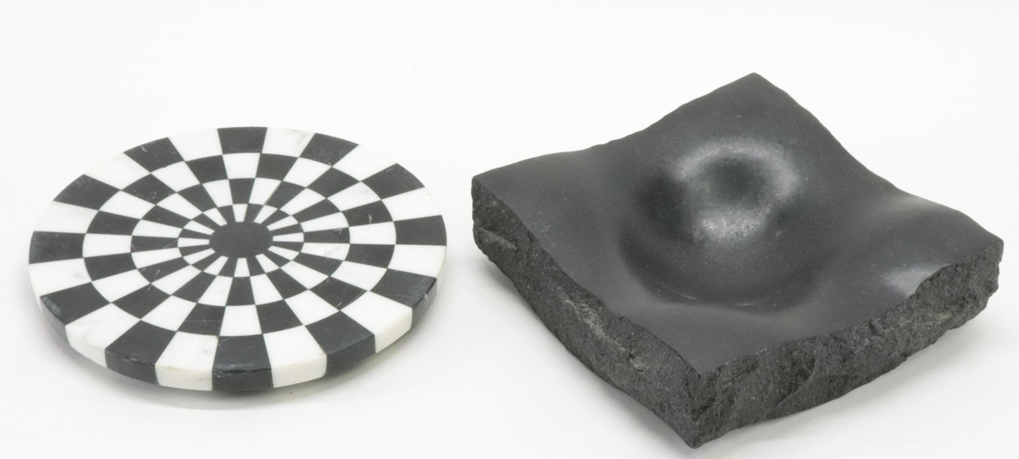 Black Granite Sculptural Dish in the style of Masayuki Nagare, and black & white marble stand in Fornasetti style Dimensions: 3" H x 10" W x 9 1/2" D, and 10 1/2" dia. Stand (EBAZ5184/2)(WT)