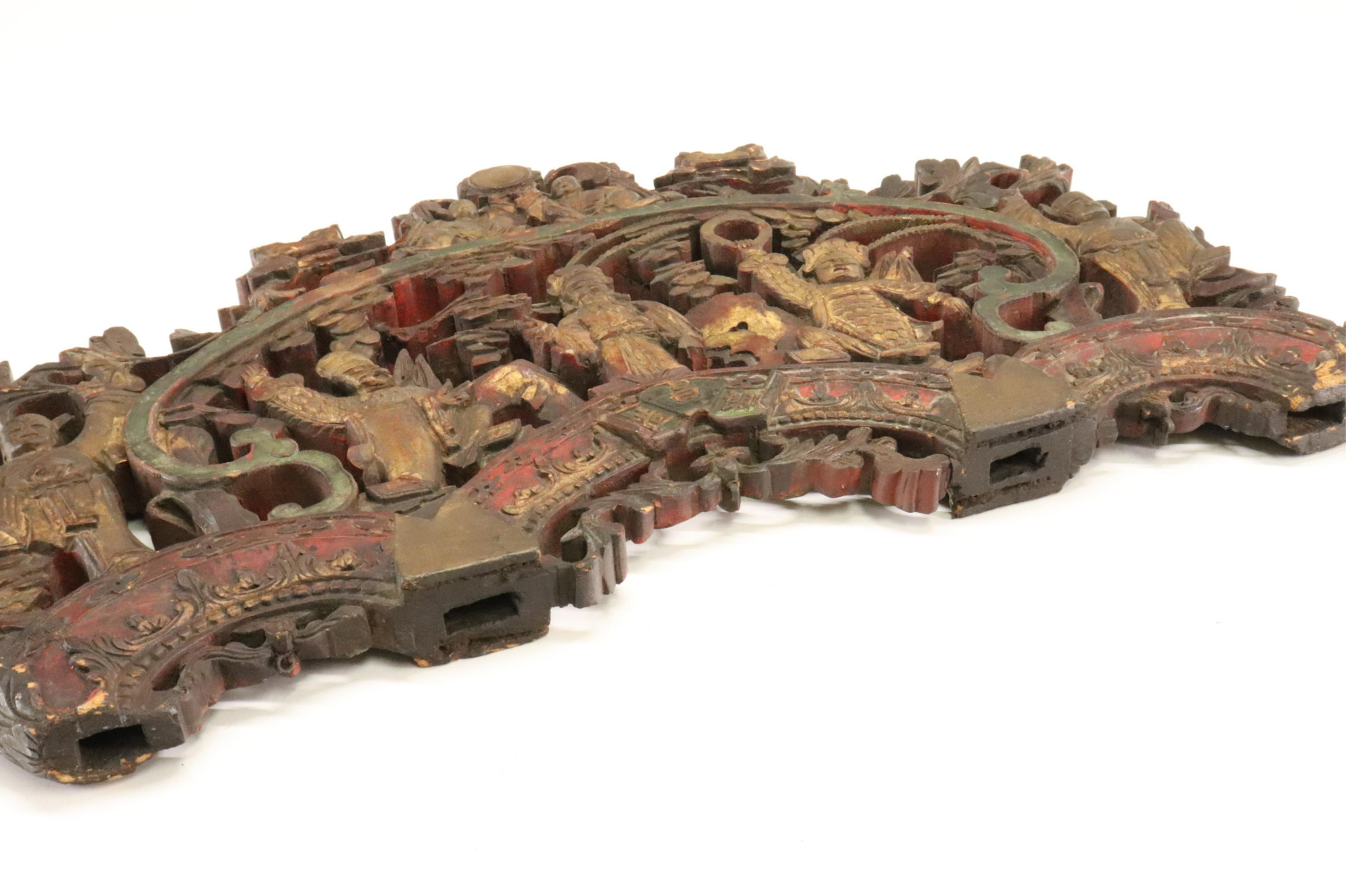 Thick wood panel, heavily carved with the three home gods and additional figures. Carved on both sides and mortis holes on bottom that indicate original fitting. Dimensions: 18" x 29" x 2" (BSTA587)(PR)See More