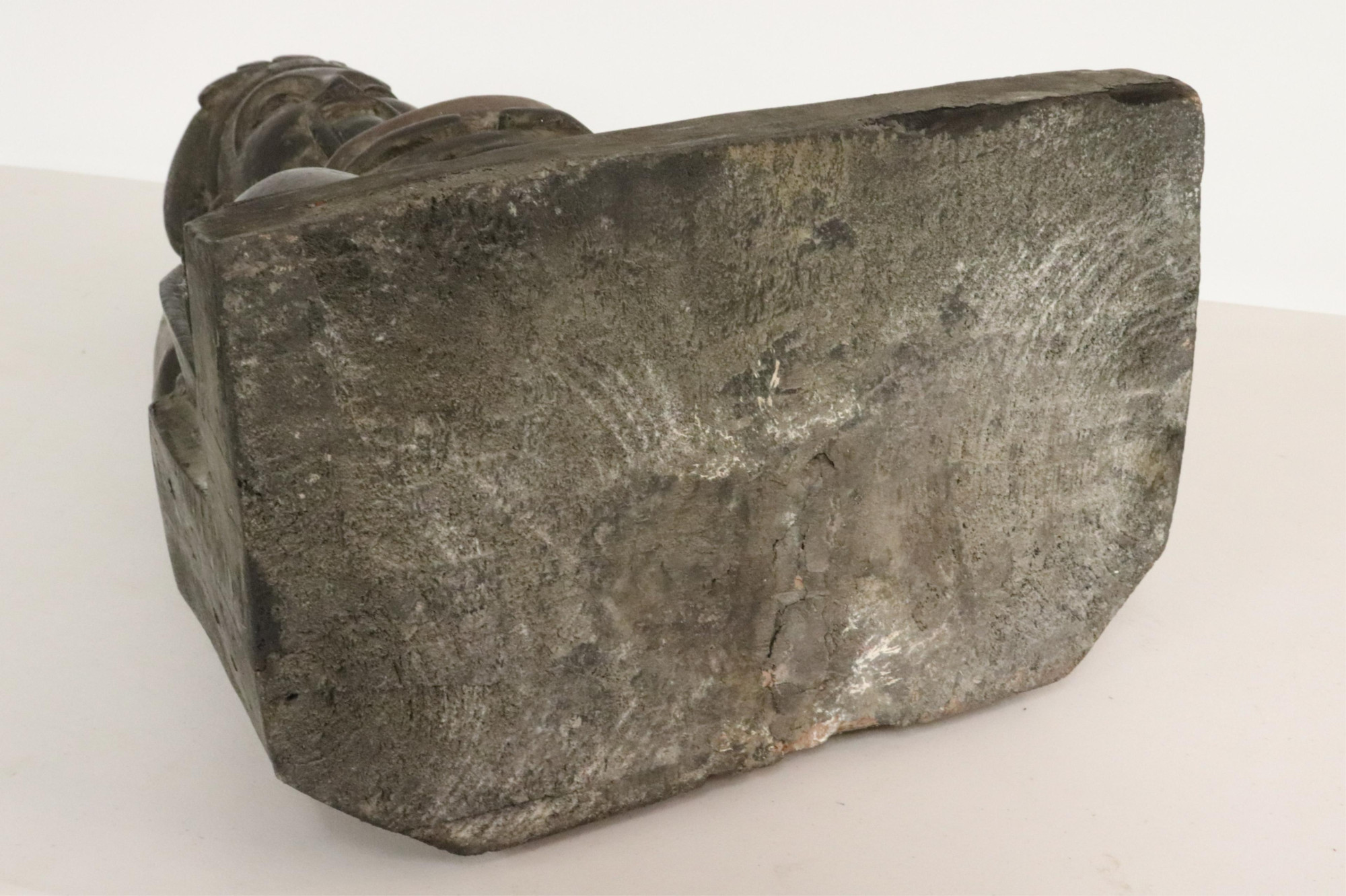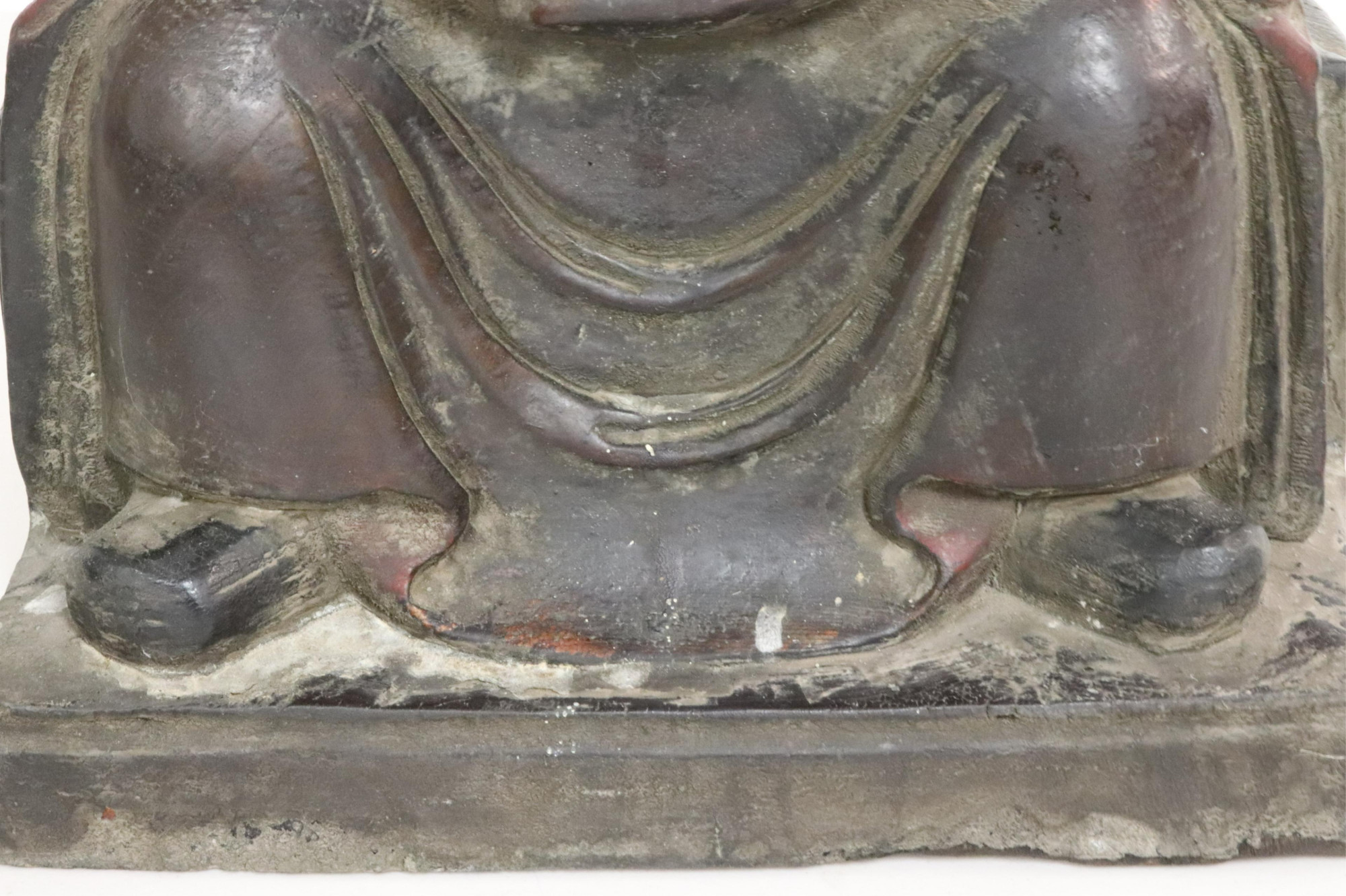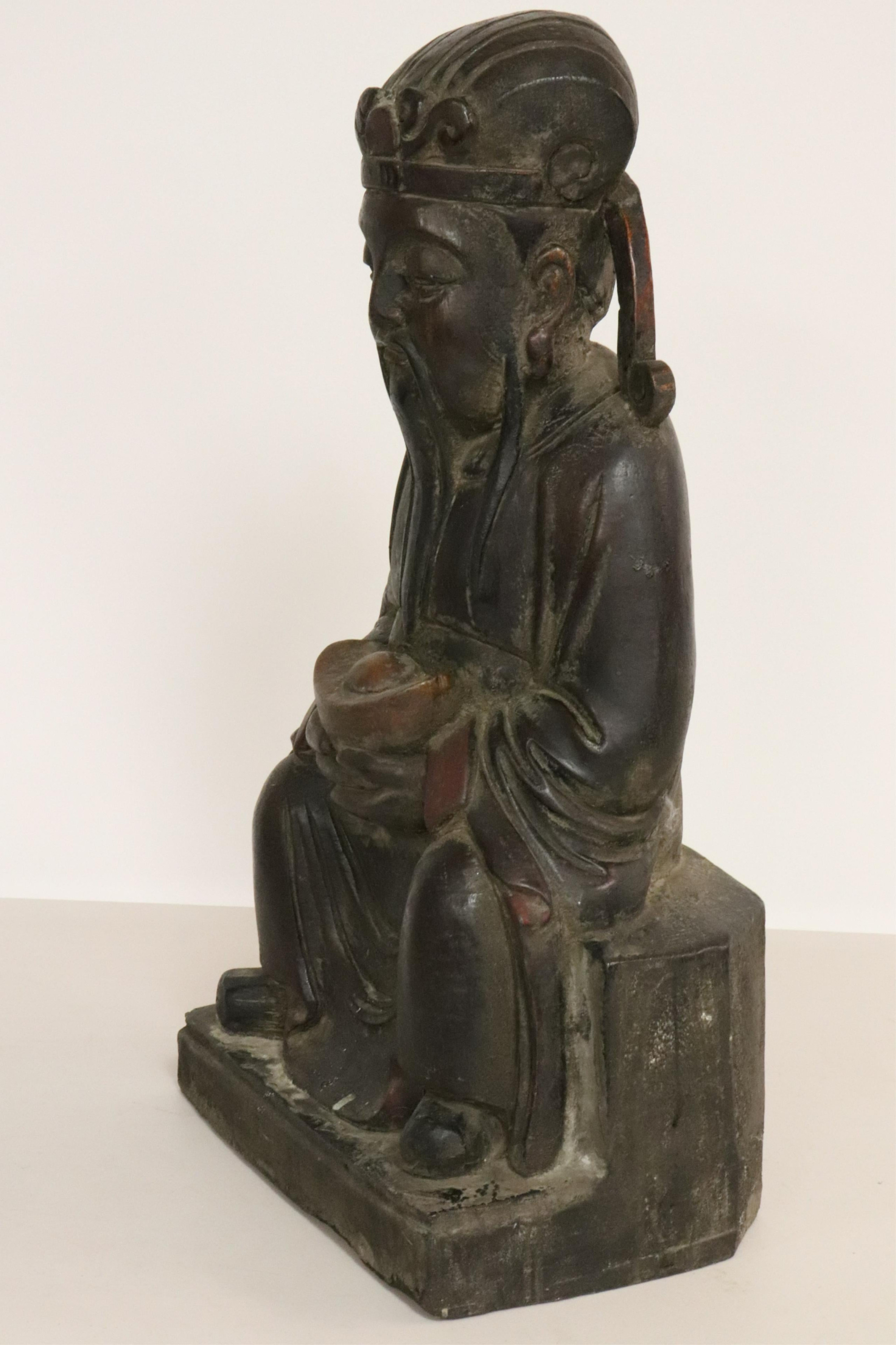 Large, heavily carved seated official holding gold ingot. Traces of paint. Dimensions: 26" high (BSTA588)(PR)
