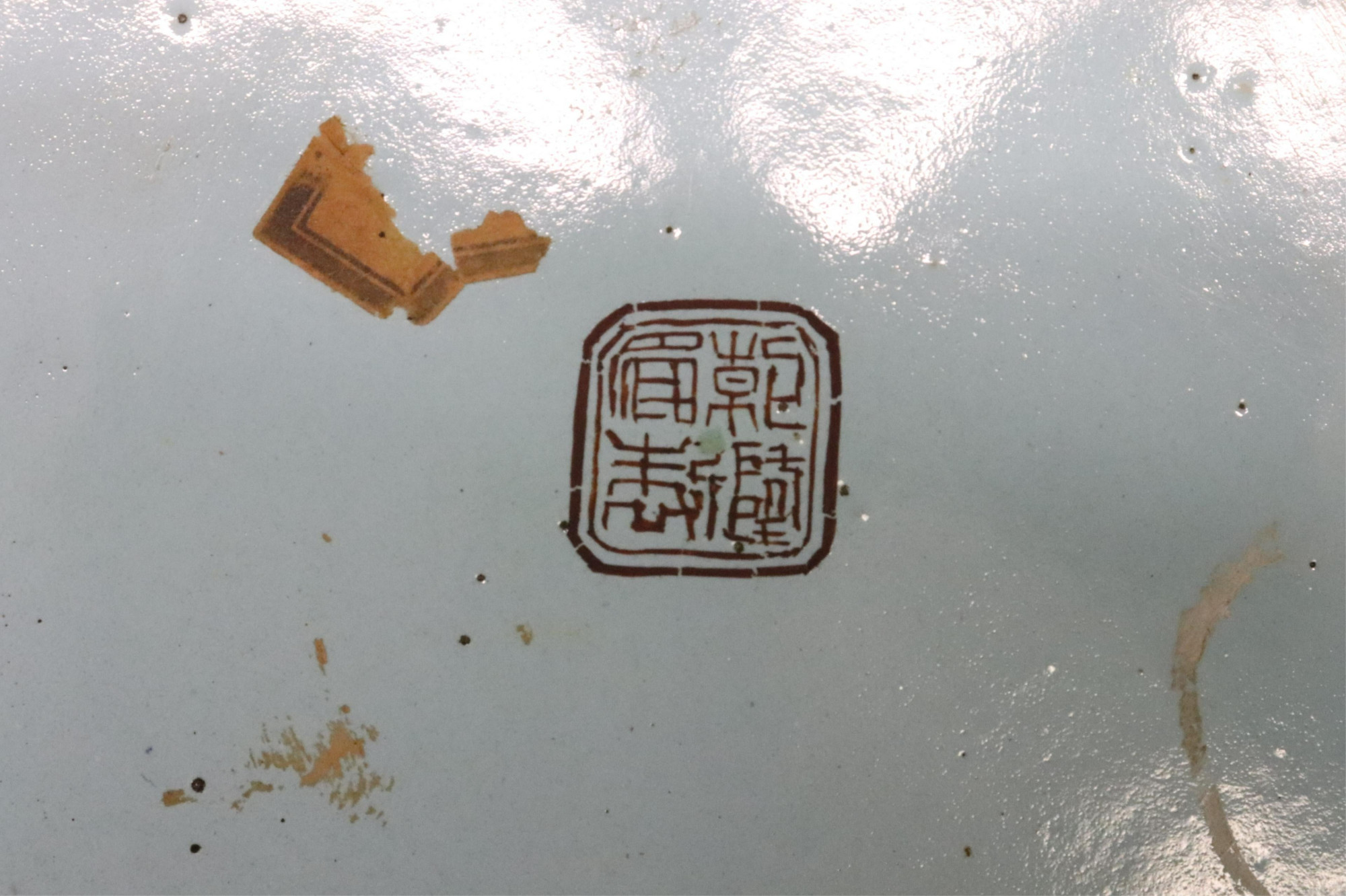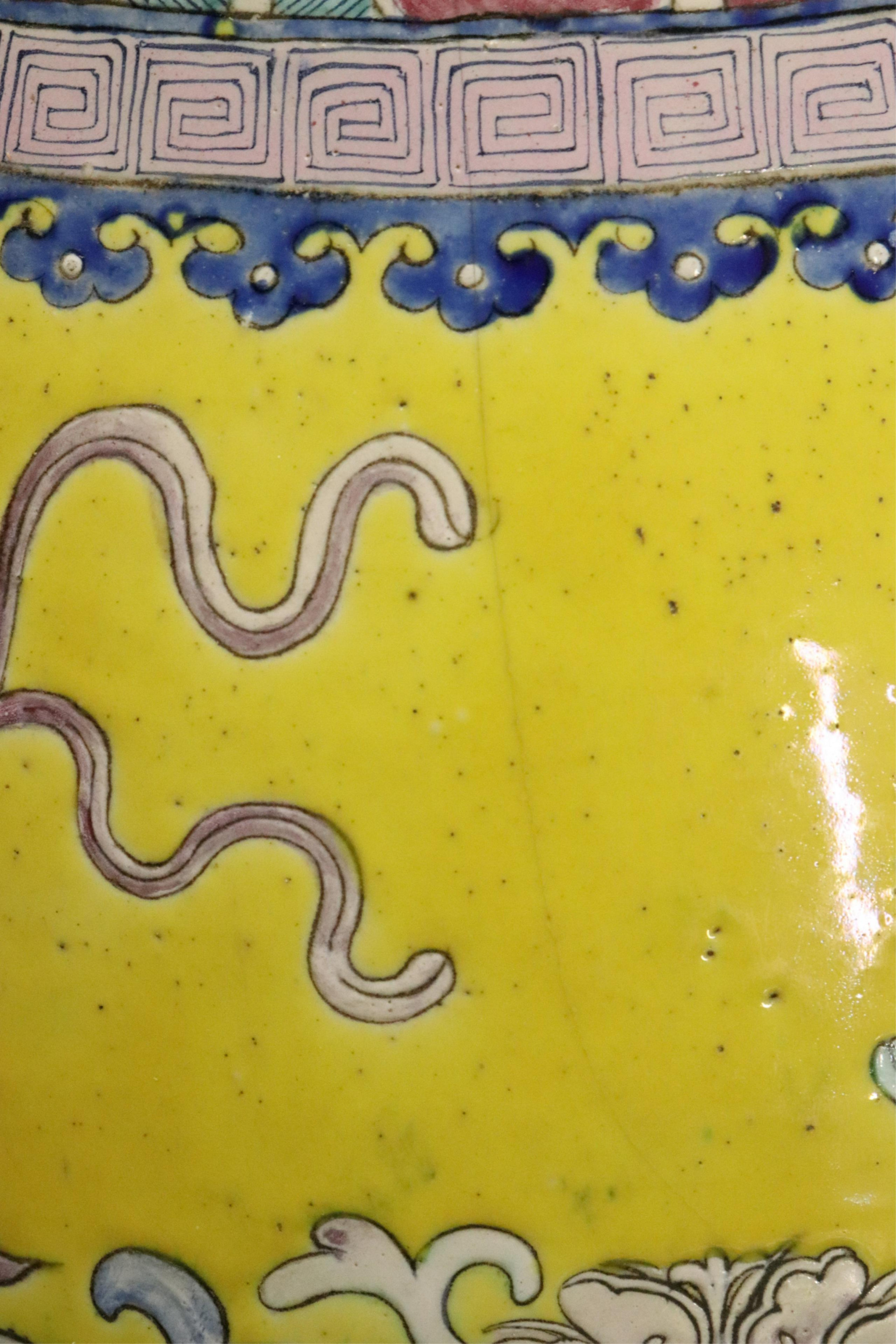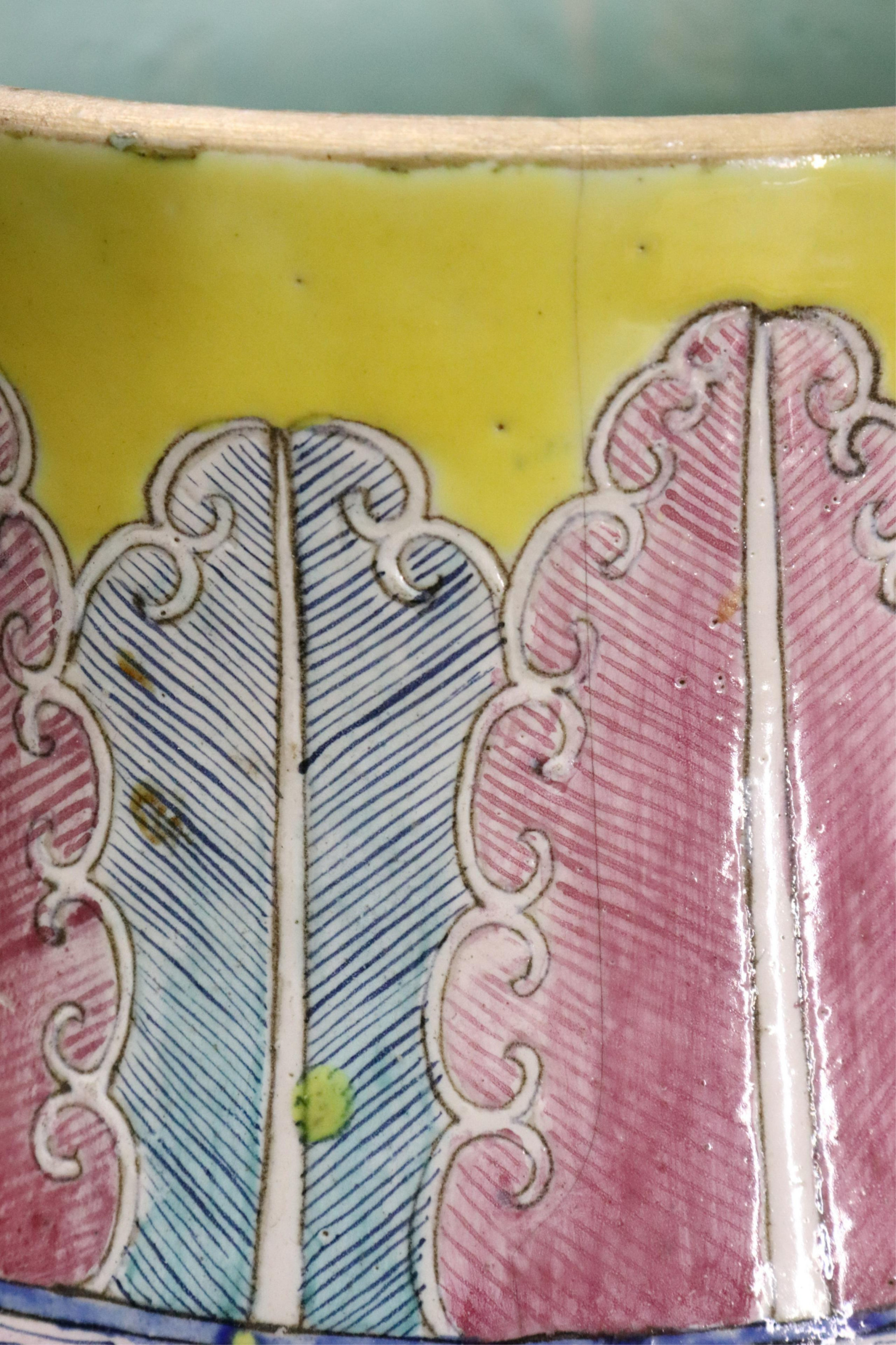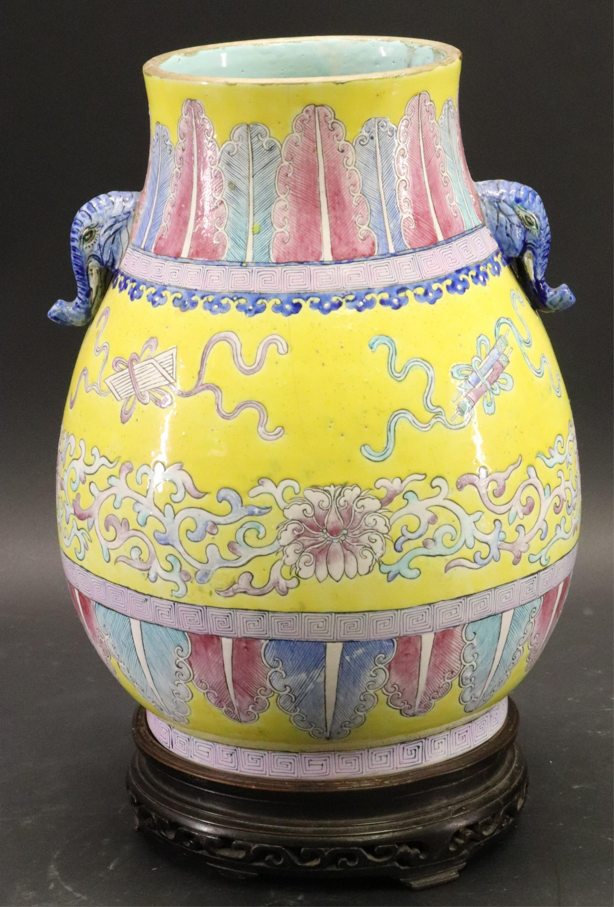 based marked, yellow ground with pale blue and pink palmette and floral motif, elephant head handles From a Pawling New York Home Dimensions: 12 1/2 x 10 (USPR6399/2)(MM)