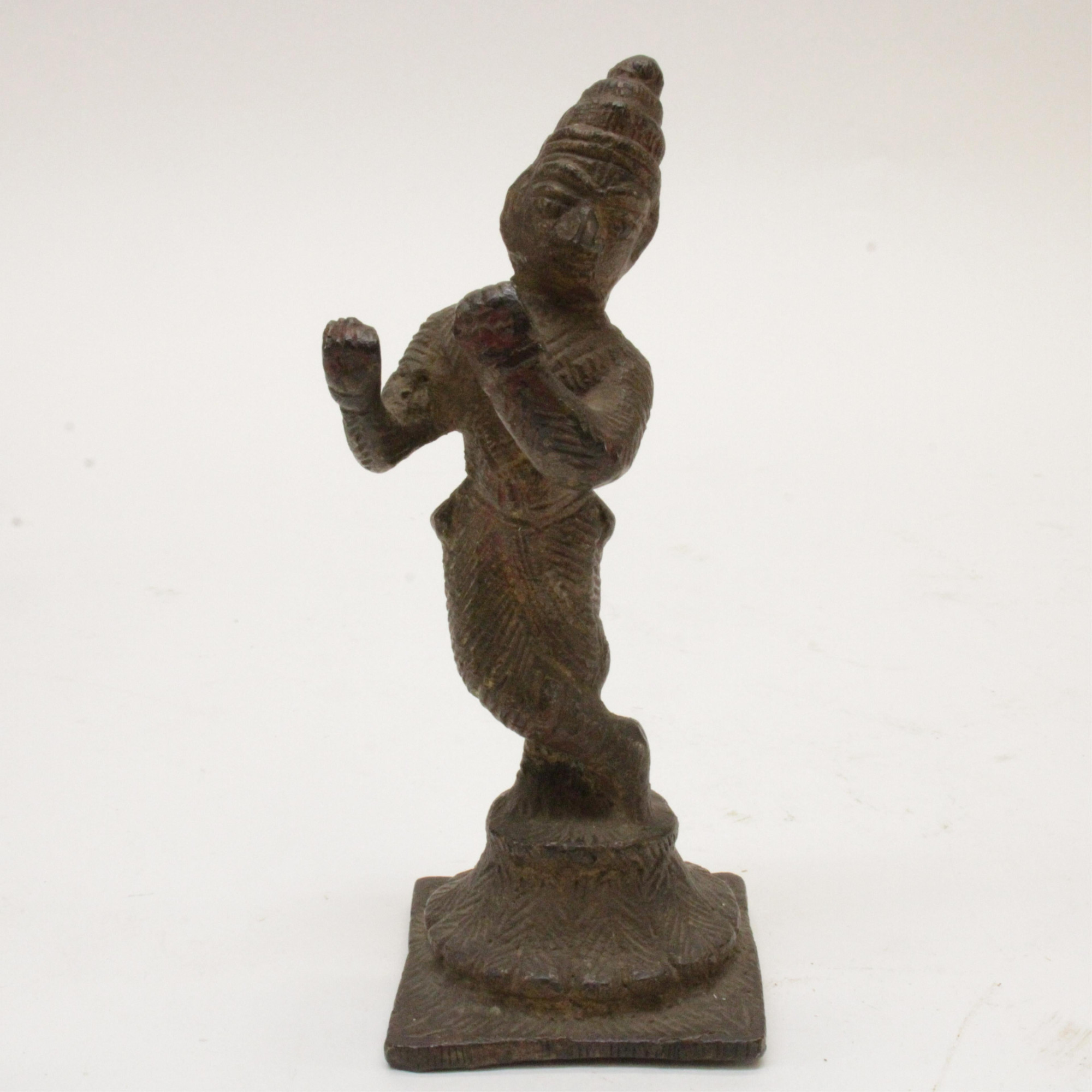 Copper Alloy Tibetan Dorje Ax with Iron Blades, 19th/20th century Highly detained cast and engraved ritual Phurba/Dorje dagger-ax of copper alloy. Incorporated three-sided dagger blade and ax blade are of iron, likely traditional meteoric iron. Inset turquoise and coral stone. Offered along with small bronze Indian statue of a dancer or musician. Dimensions::dorje 12" long Property from a private Manhattan collection
