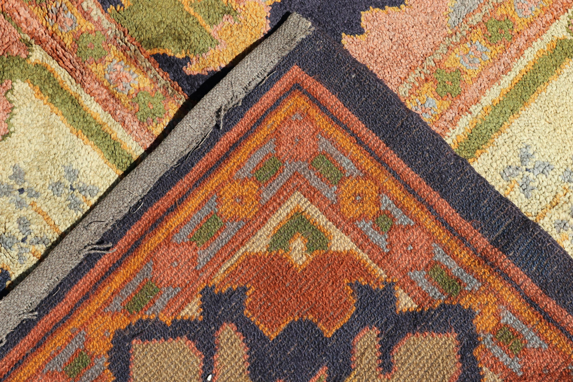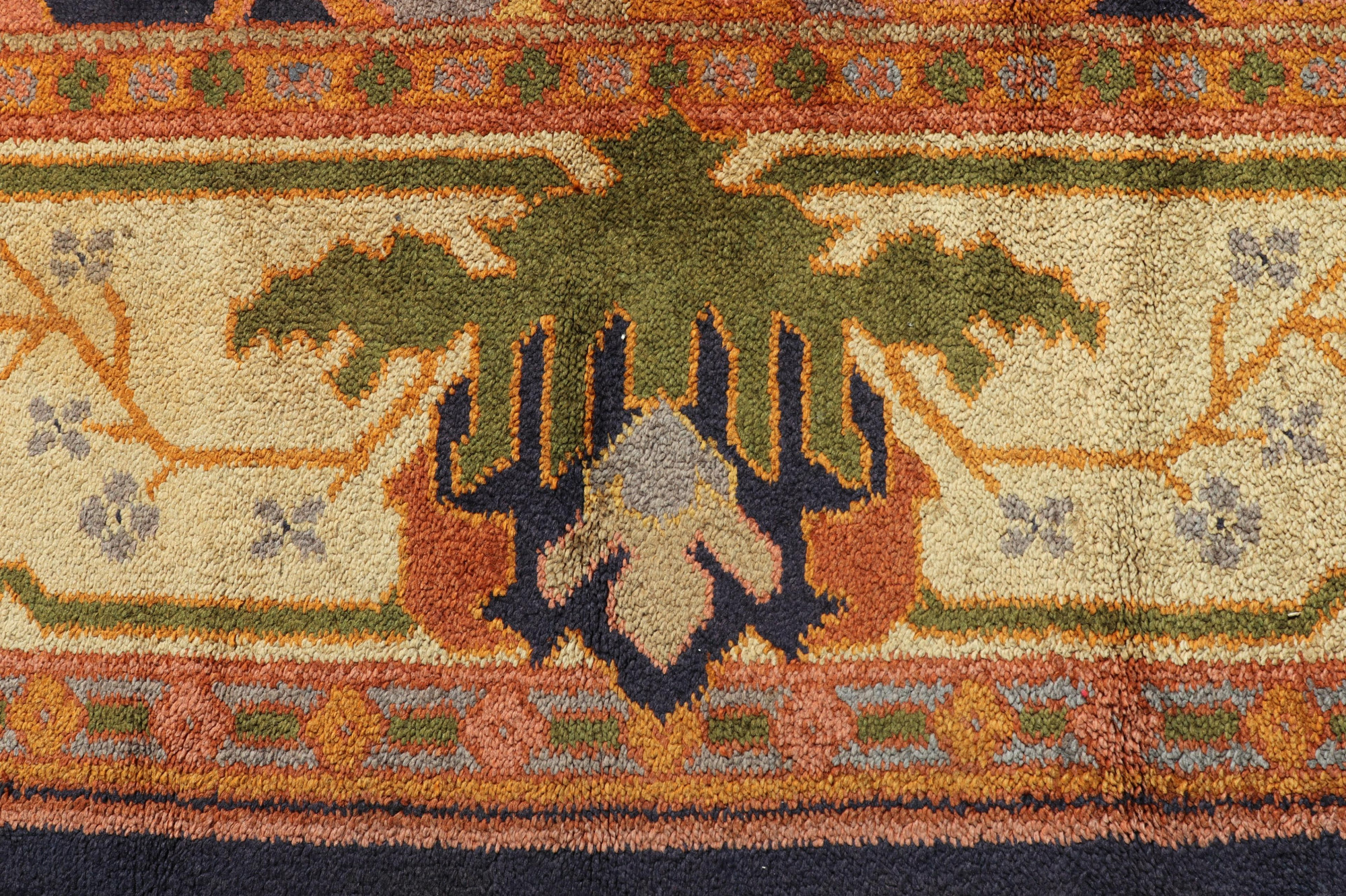 Design Attrib. Gavin Morton and G.K. Robertson, Arts and Crafts Rug, hand tufted, large center geometric floral medallion with mirrored repeat, dark blue ground with rose,yellow,orange green and pale blue Note: Christies carpet lot of same pattern,different size, https://www.christies.com/lotfinder/Lot/gavin-morton-1867-1954-and-gk-robertson-4631552-details.aspx