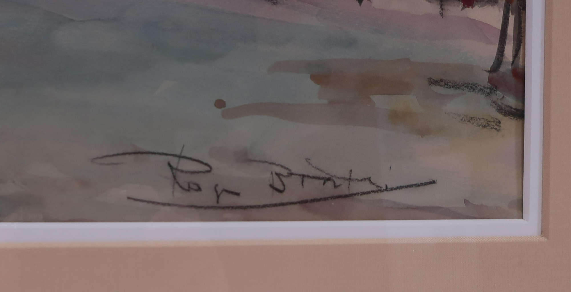 Charcoal and W/C on paper. Signed (illegibly) LR in charcoal. Mahogany stained veneer wood frame edge with gilt face. Double matted, linen outer. Dimensions: Sight 15.75"H x 20 framed 26.5 x 29.5 (QRSIDE6454)(JP)
