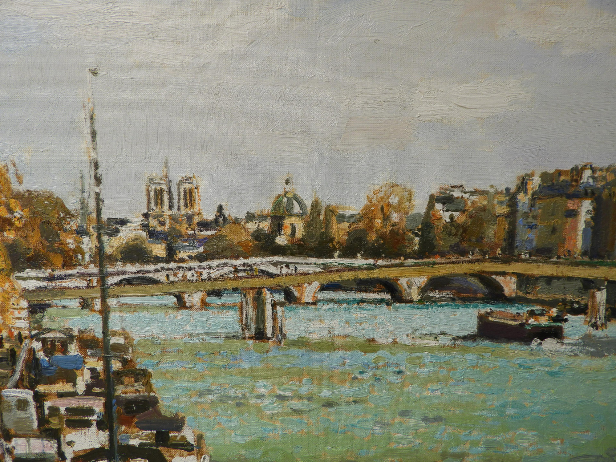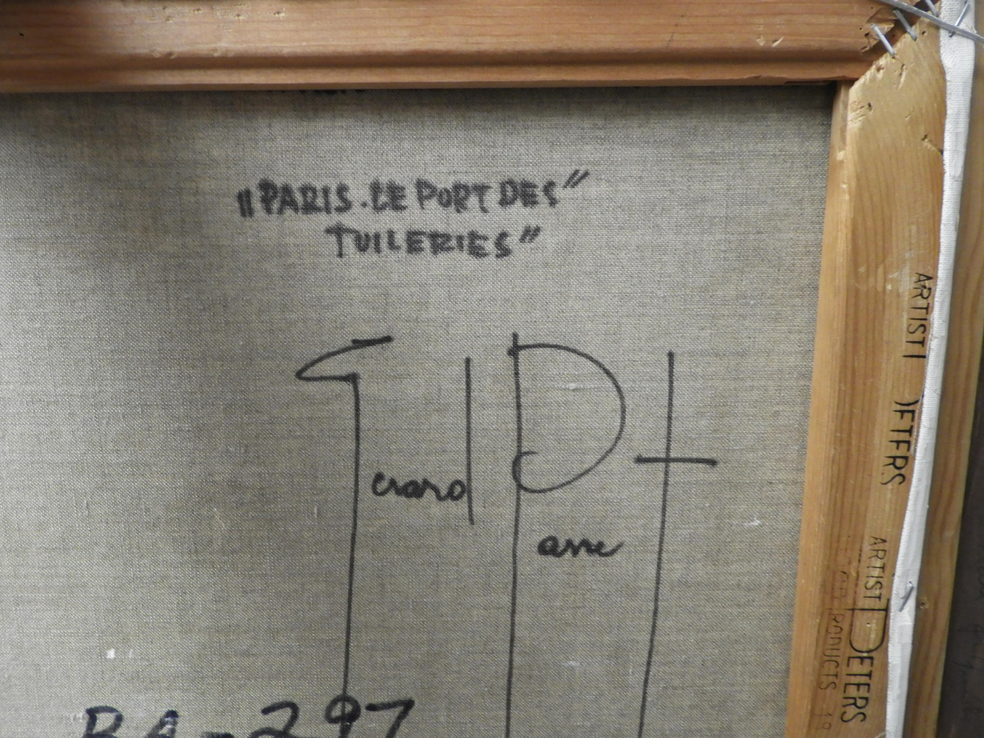 Gerard Passet (French, 1936 - 2013) Oil on canvas titled Paris Le Port Des Tuileries. Signed lower left. Signed and titled verso. Property from a fourth generation gallery, NYC Dimensions: 18 x 22" framed: 25 x 29" (HEAR105)(EL)