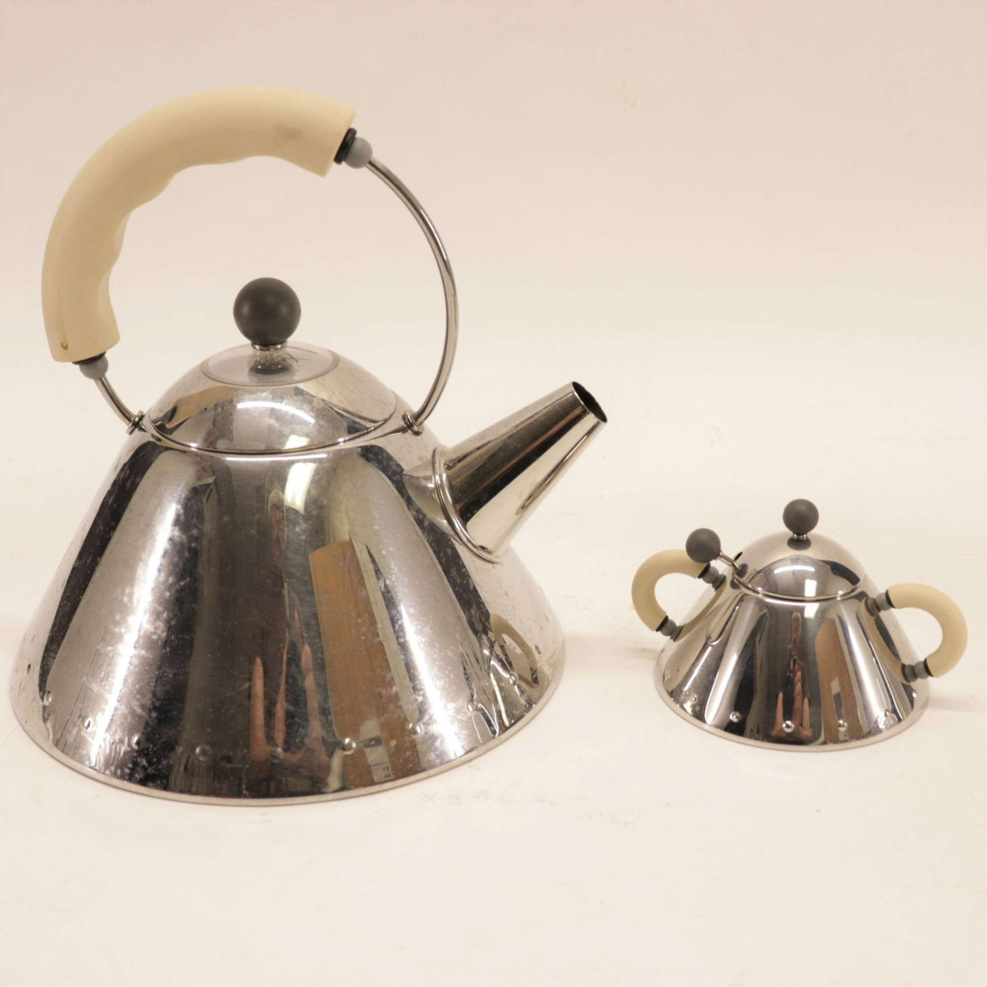 Group Alessi Wares for Tea, serving trays, demitasse, glass jars, etc. Dimensions: Fruitscape Centerpiece design by S. Giovannoni 13 3/4" sq., red tray 15 3/4" dia., hot water kettle 9" H (EBAZ5424/lot)(WT)