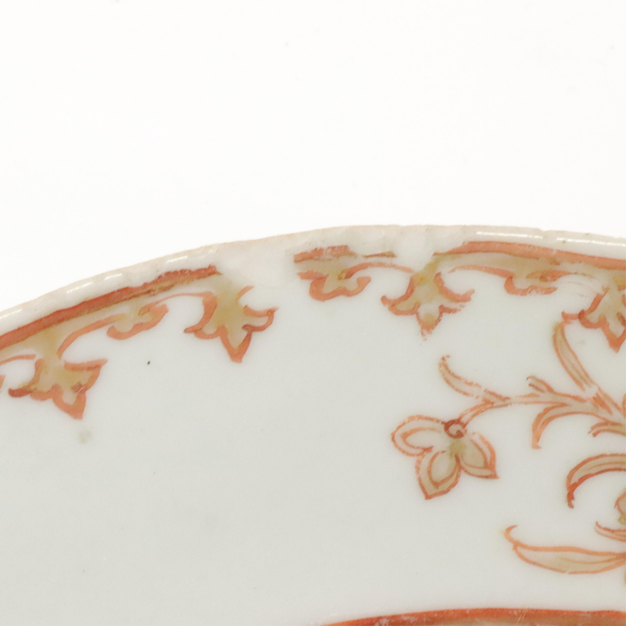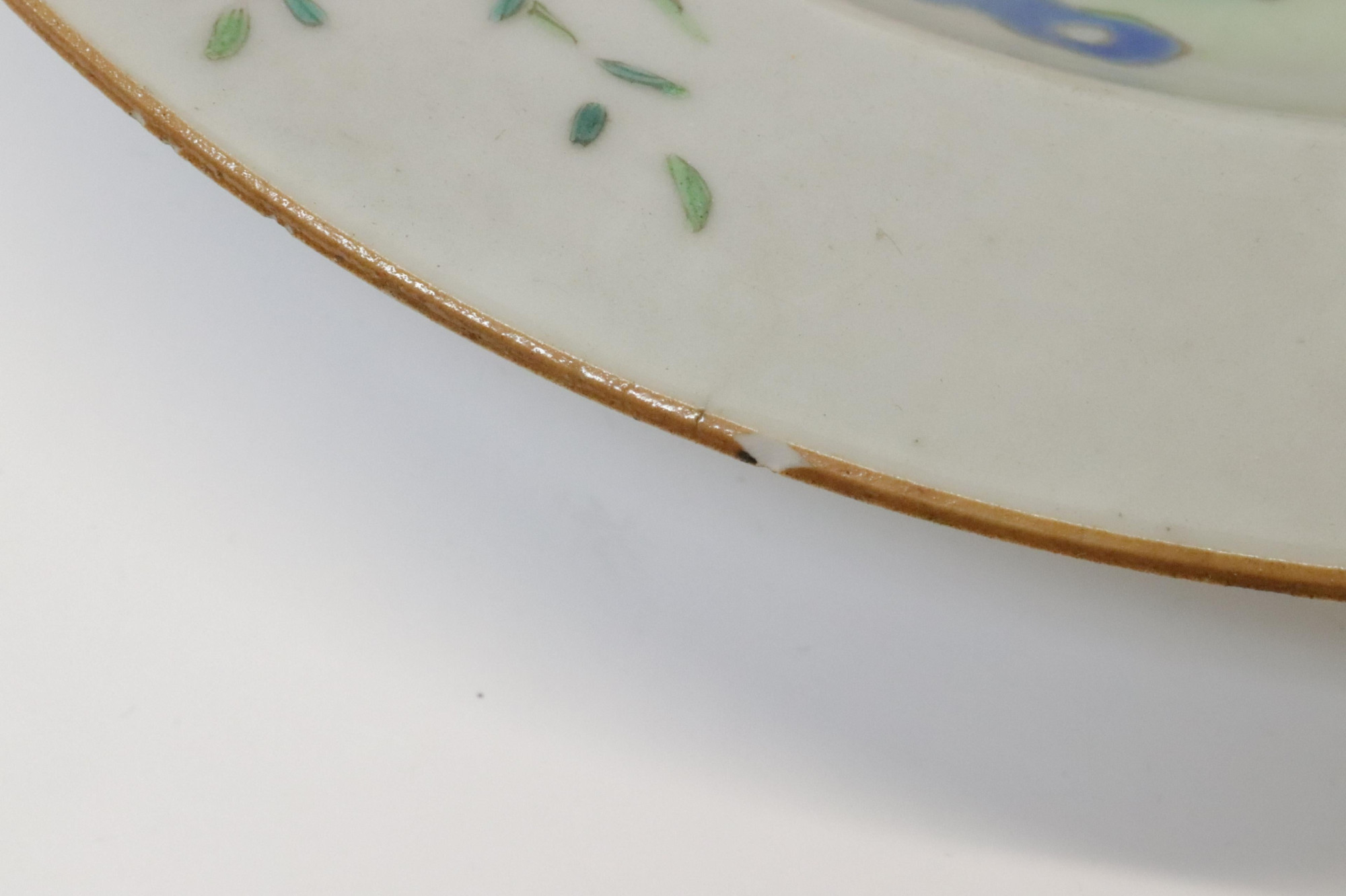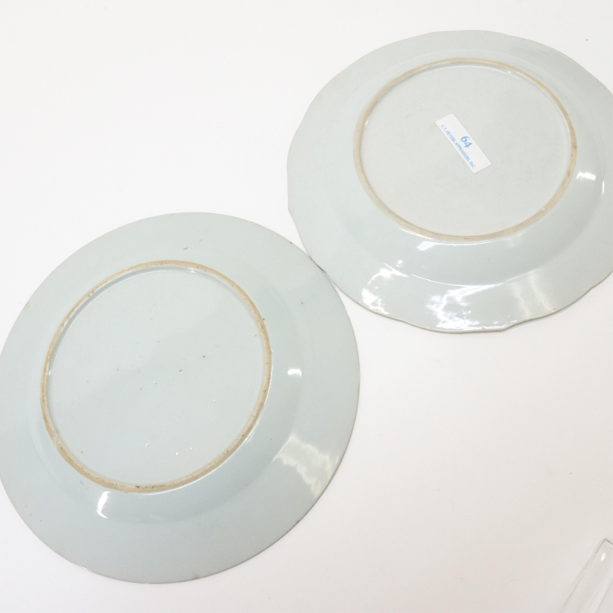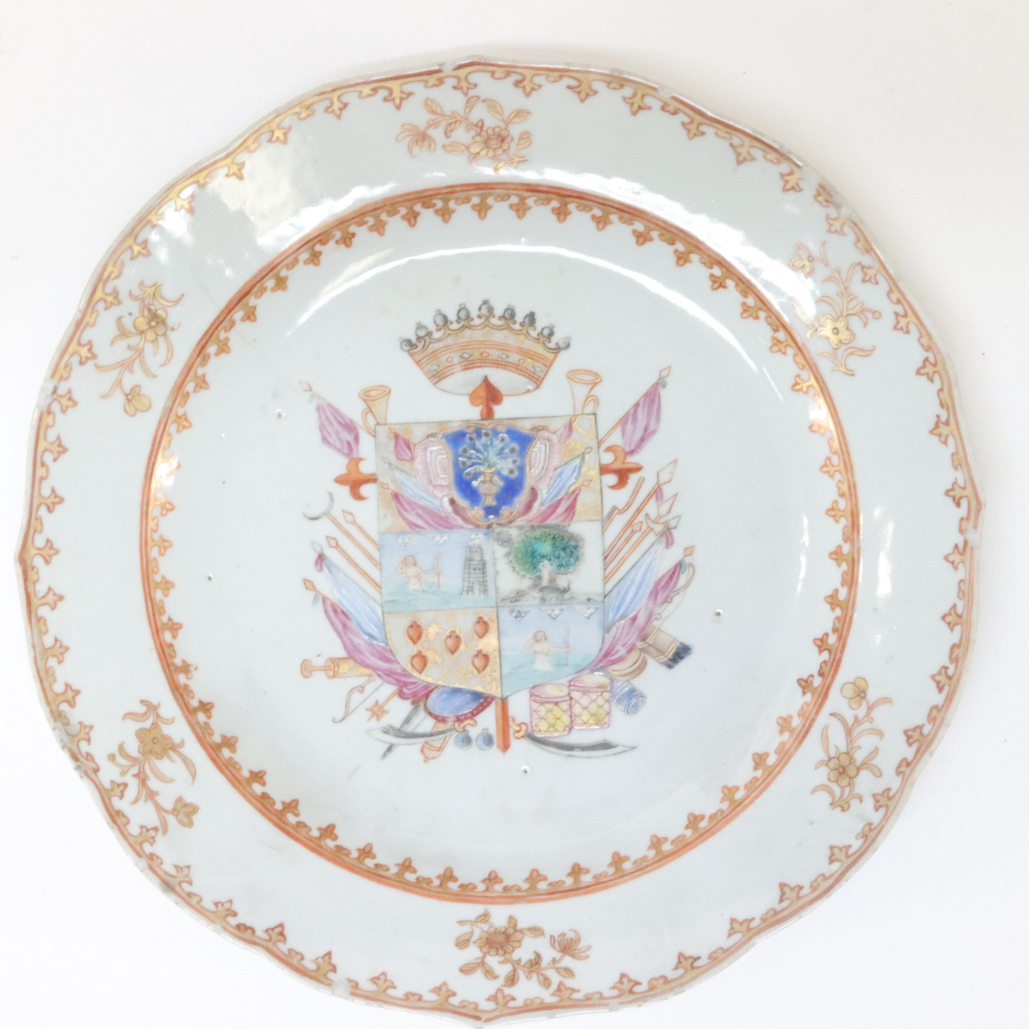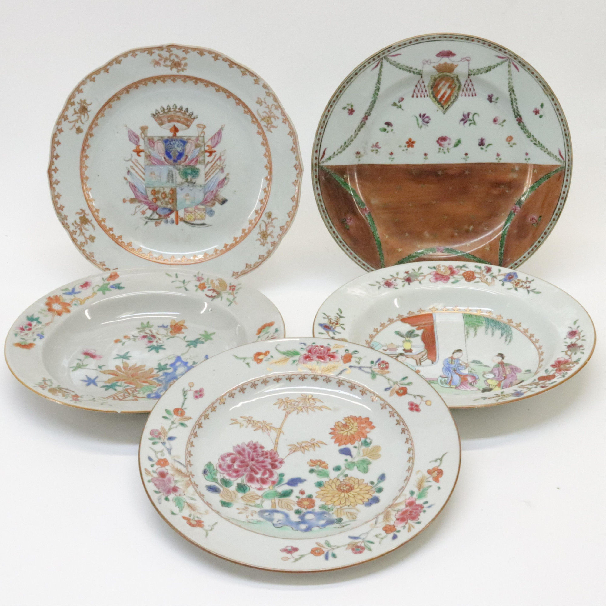 Group of Five Chinese Export Porcelain Dishes, 18th - 19th century Two 18th century armorial plates offered. Offered along with two famille rose shallow bowls of wide rim and one famille rose plate, likely 19th century.