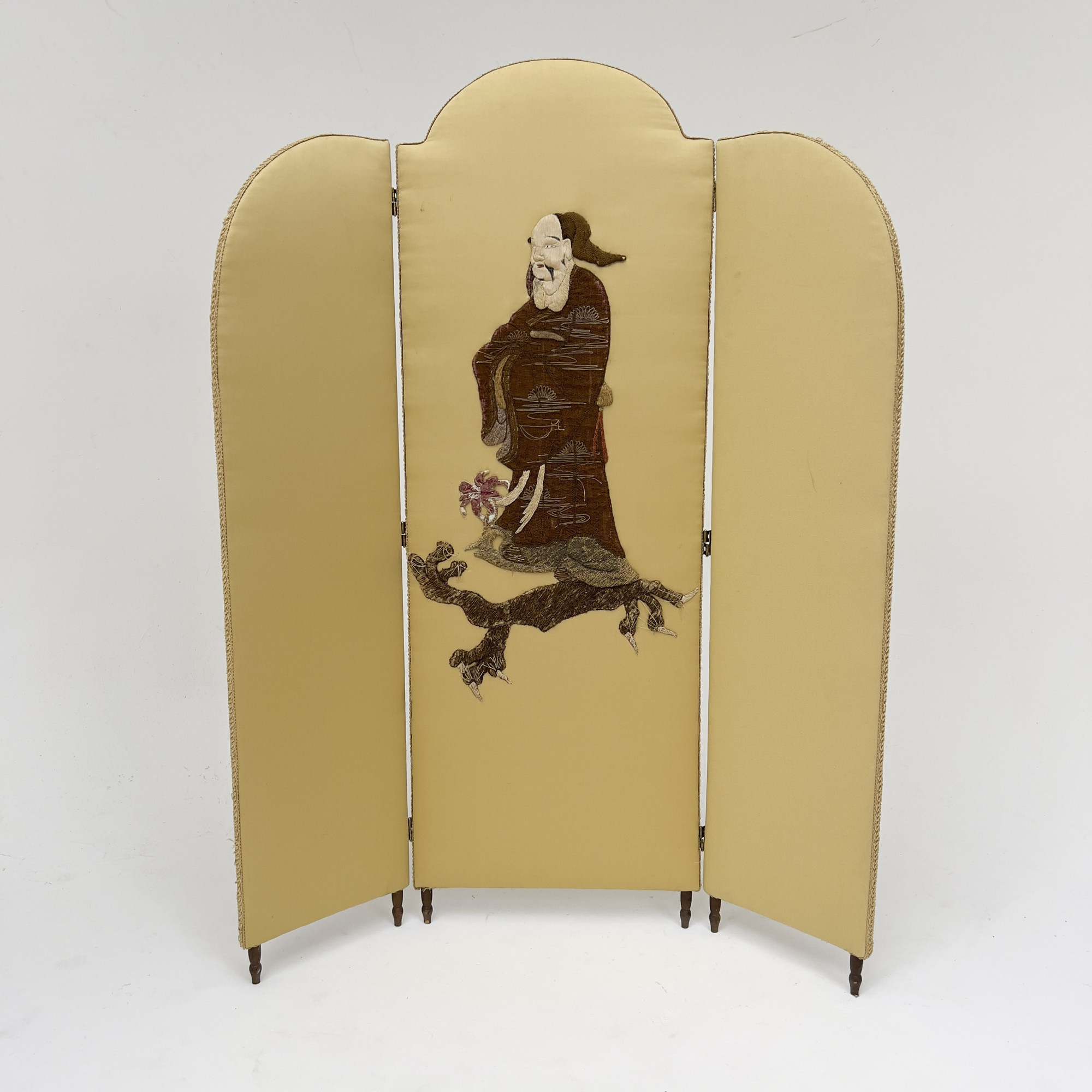 Three section screen, with embroidered Asian figure to center panel