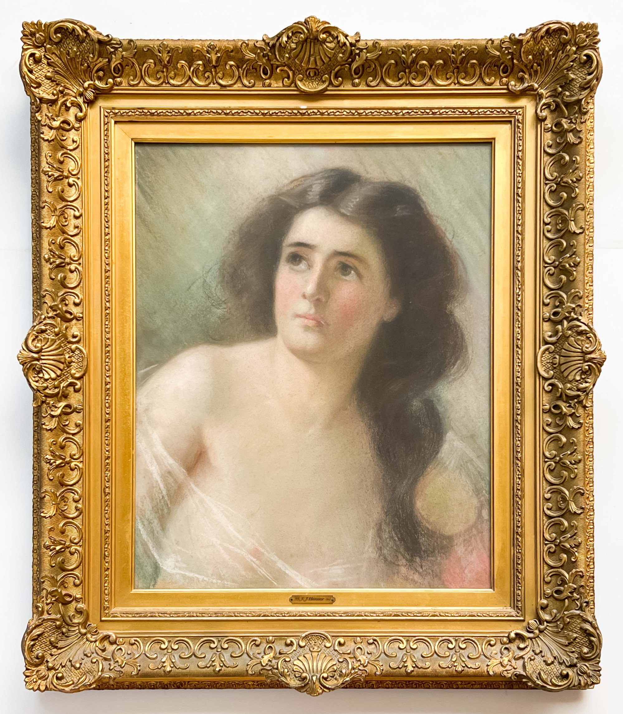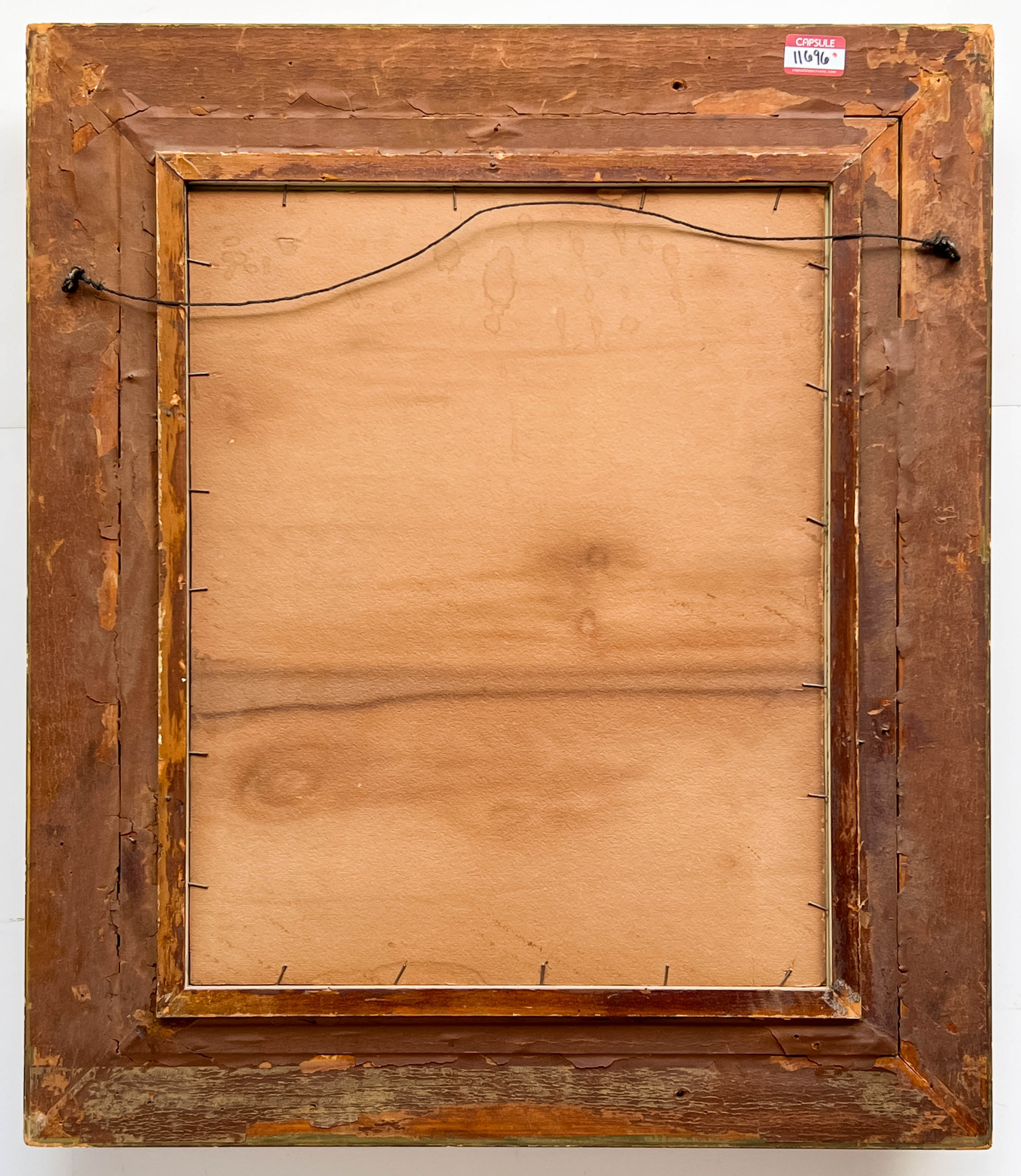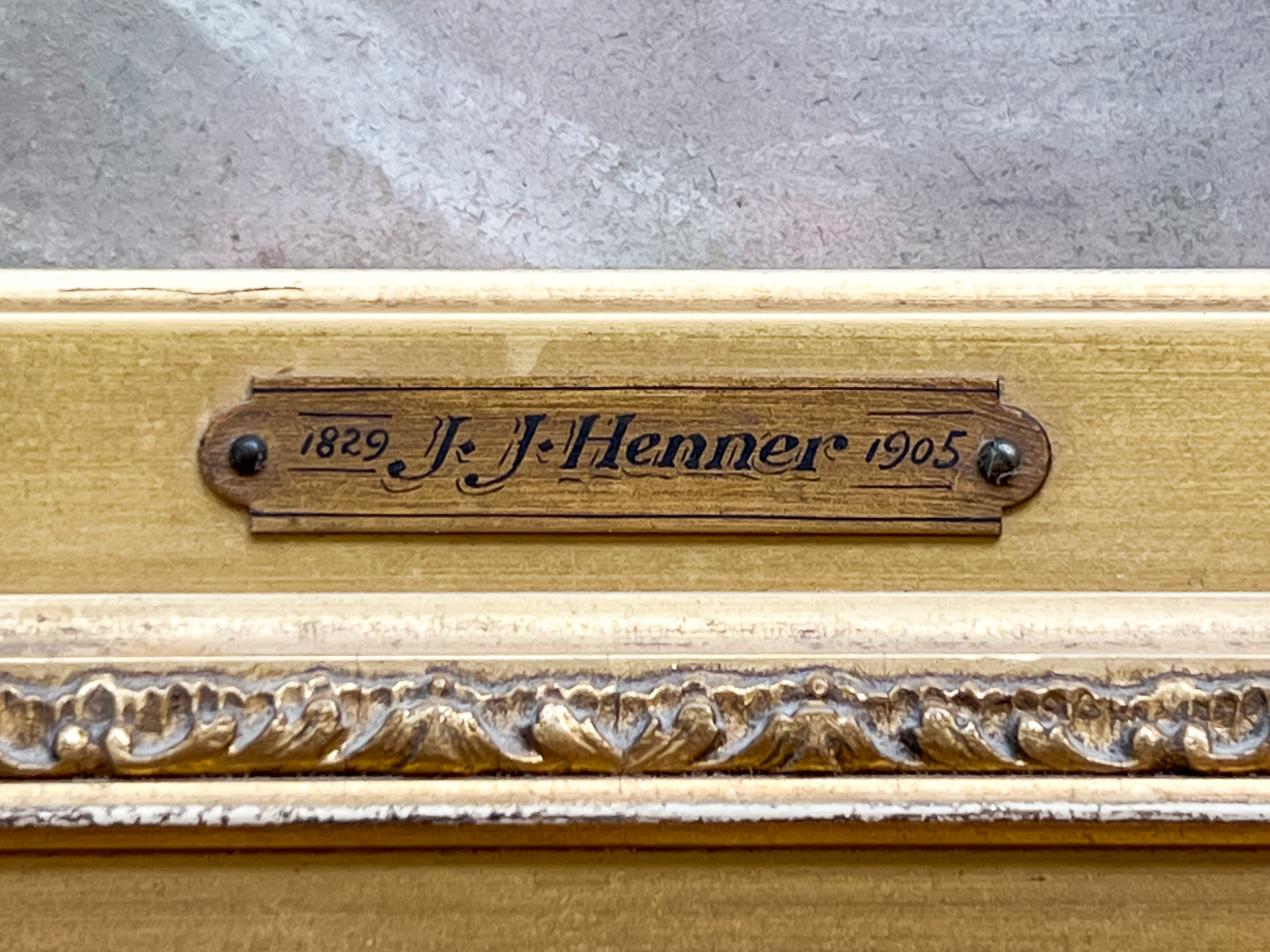 frame dimensions: 27 3/4 x 24 x 2 1/2 inches, wood frame with glazing, name plaque reads '1829 J.J. Henner 1905'