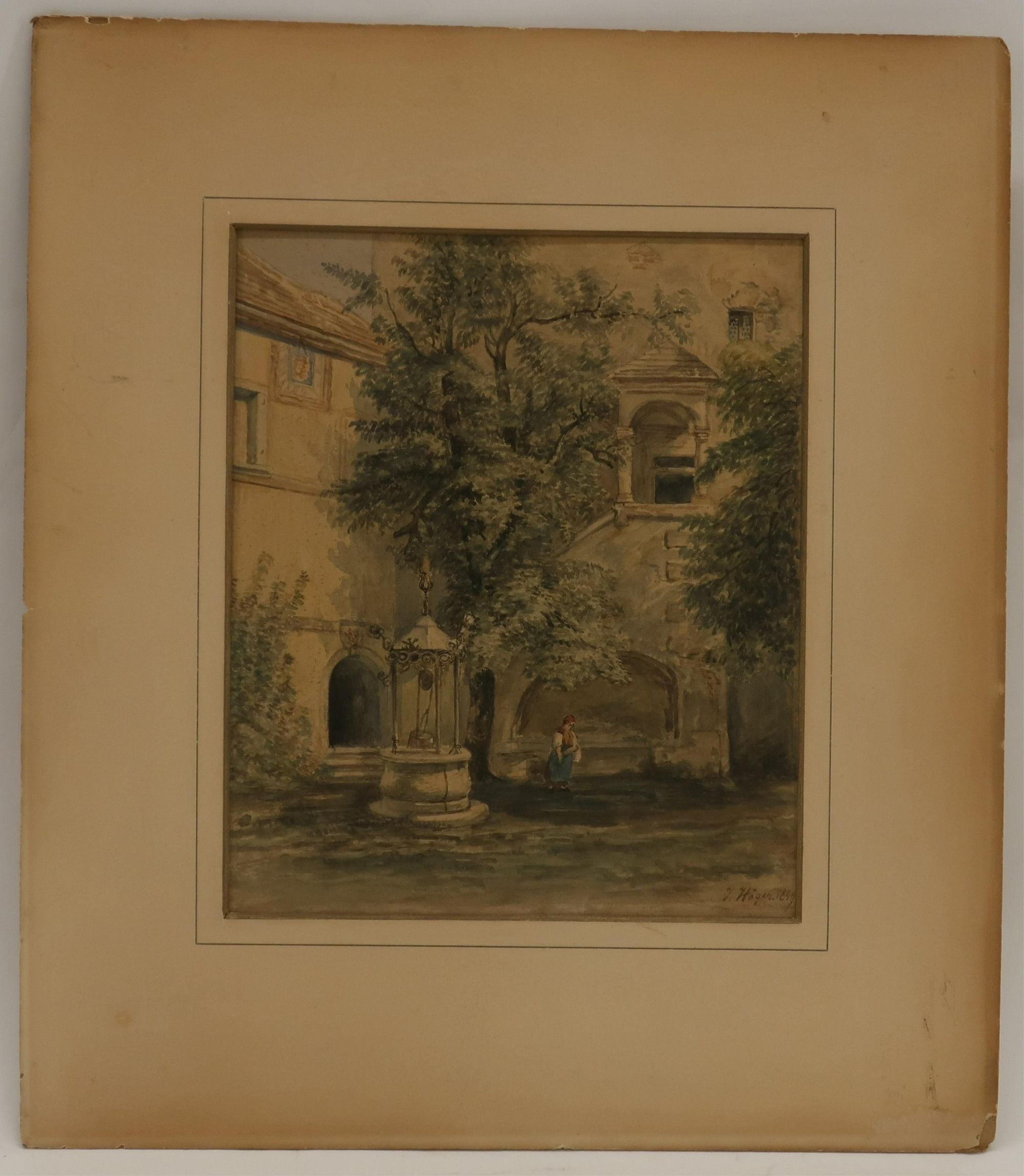 Josef Höger, 1801-1877, "Town Square", Watercolor, signed and dated lower left J Hoger 1849 Dimensions: 10 1/2" x 8 1/2", Mat 17" x 14 1/2" (XWEA5320)(WT)