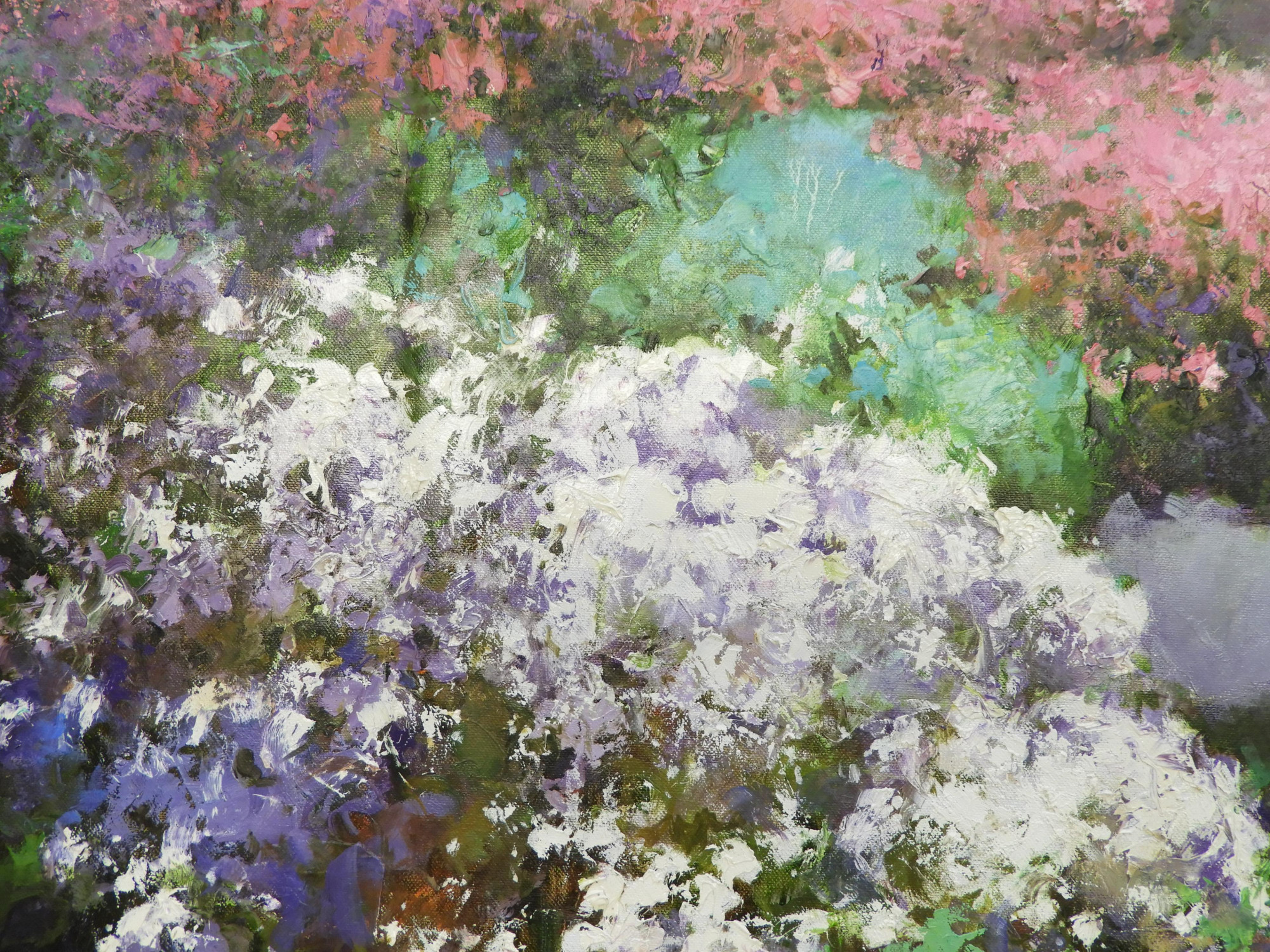 Kedi He (Chinese) father of An He. Garden Stroll, oil on canvas. Signed lower right. Property from a fourth generation gallery, NYC Dimensions: 30 x 40" unstretched (HEAR31)(EL)