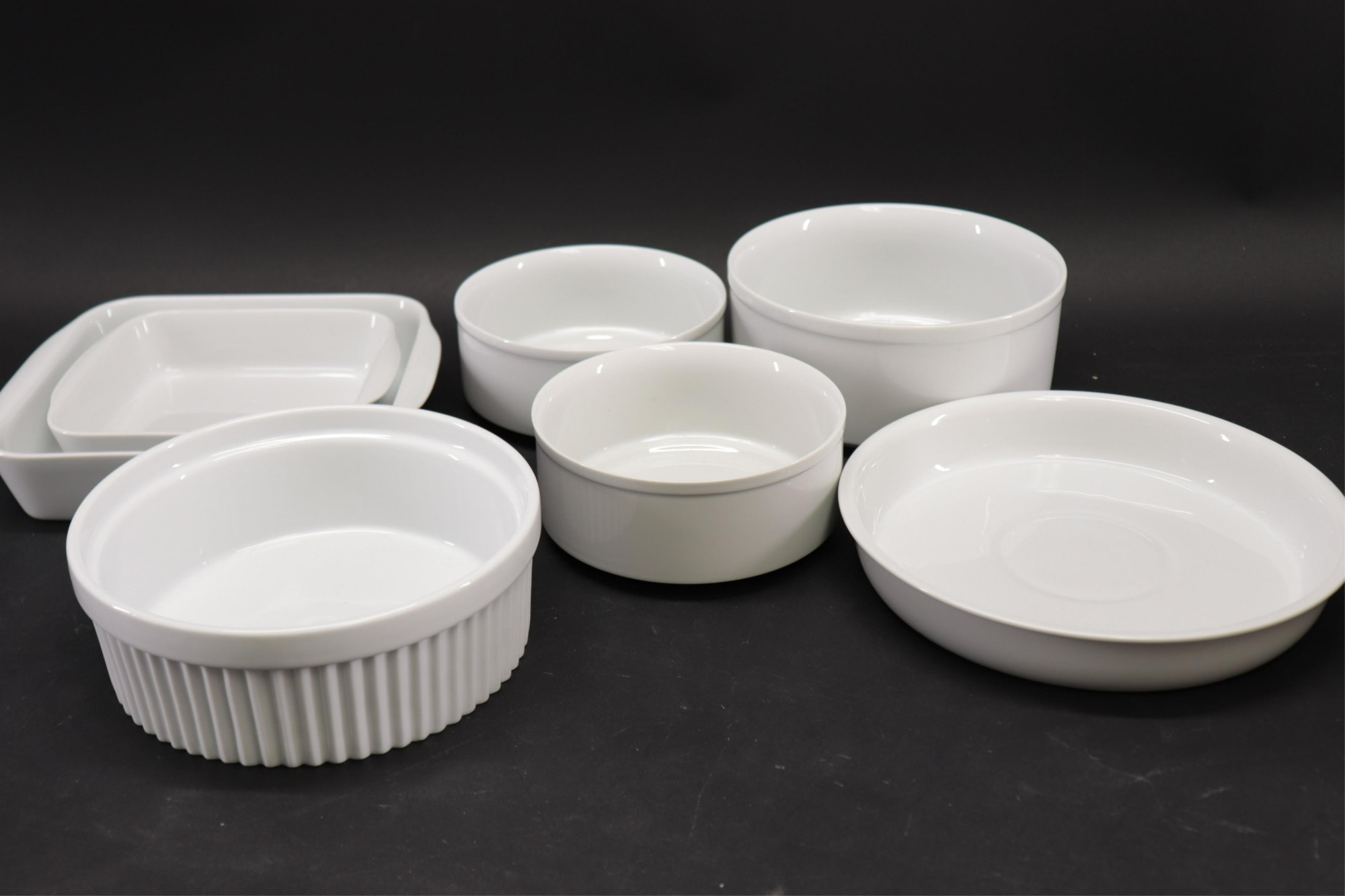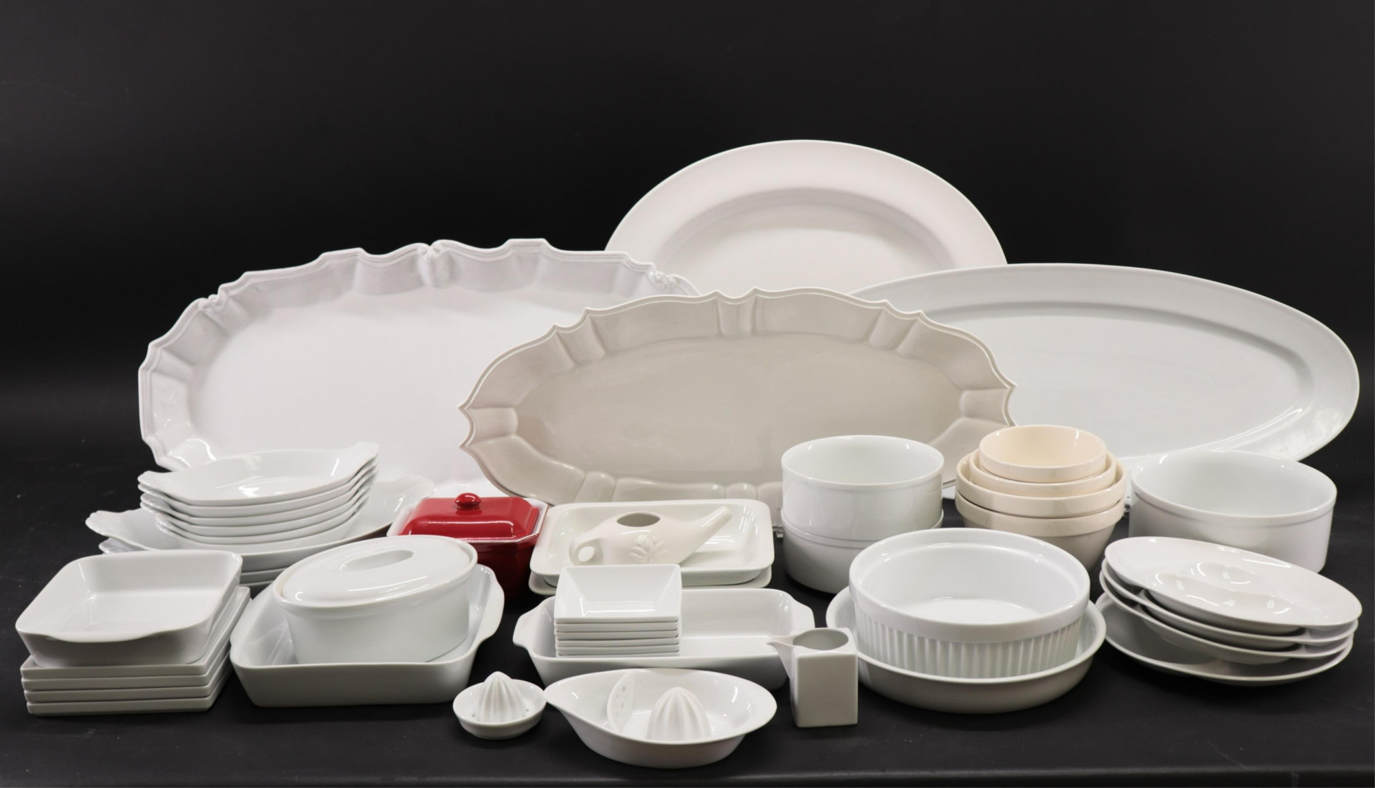 - Large Lot White Ceramic Kitchen/Cookware, includes platters, baking dishes, mixing bowls, etc.