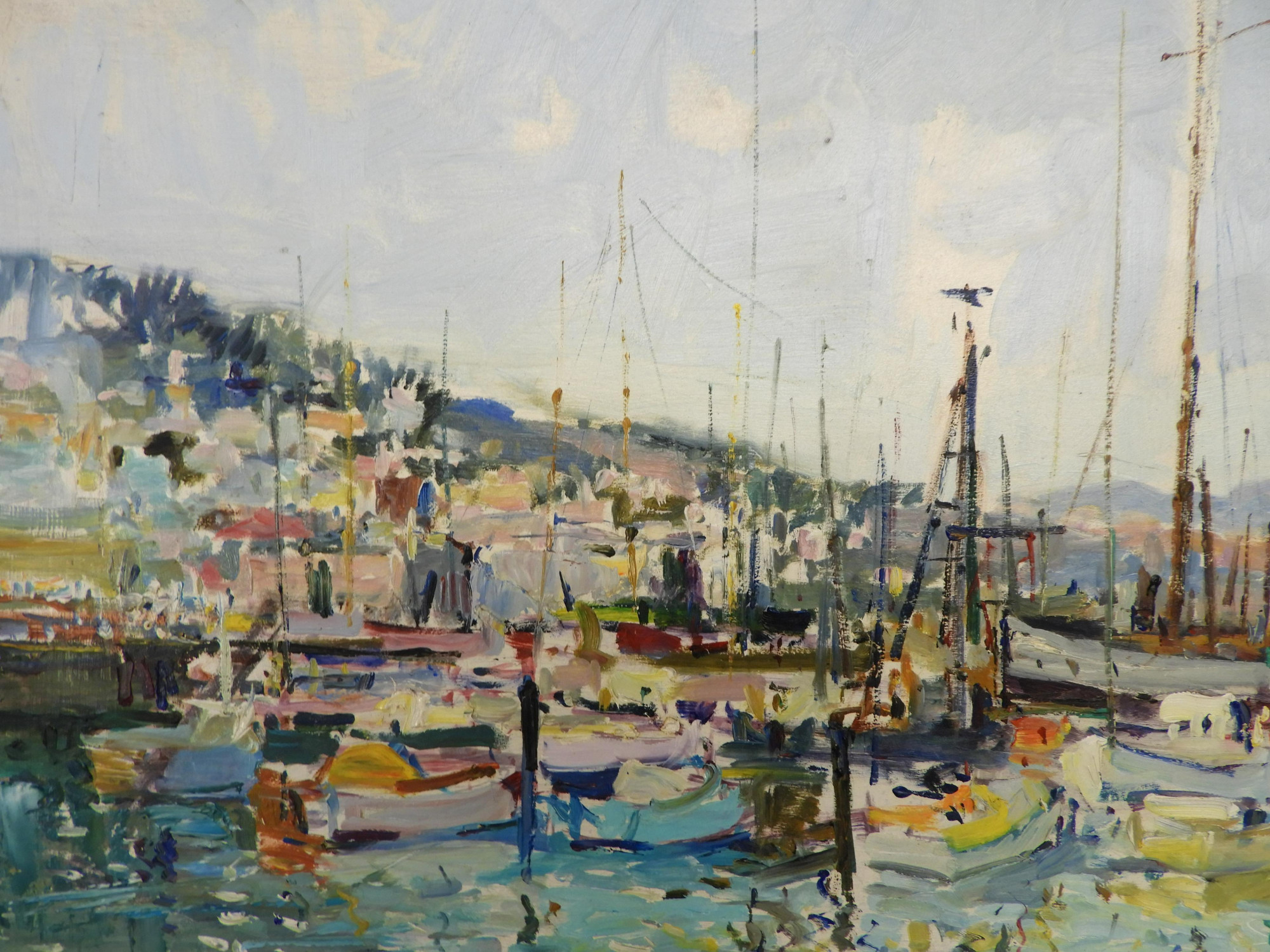 Manner of Mario Agostinelli (American 1915-2000). Oil on board depicting harbor. Unsigned. Property from a fourth generation gallery, NYC Dimensions: 15 x 18" unframed (HEAR20)(EL)