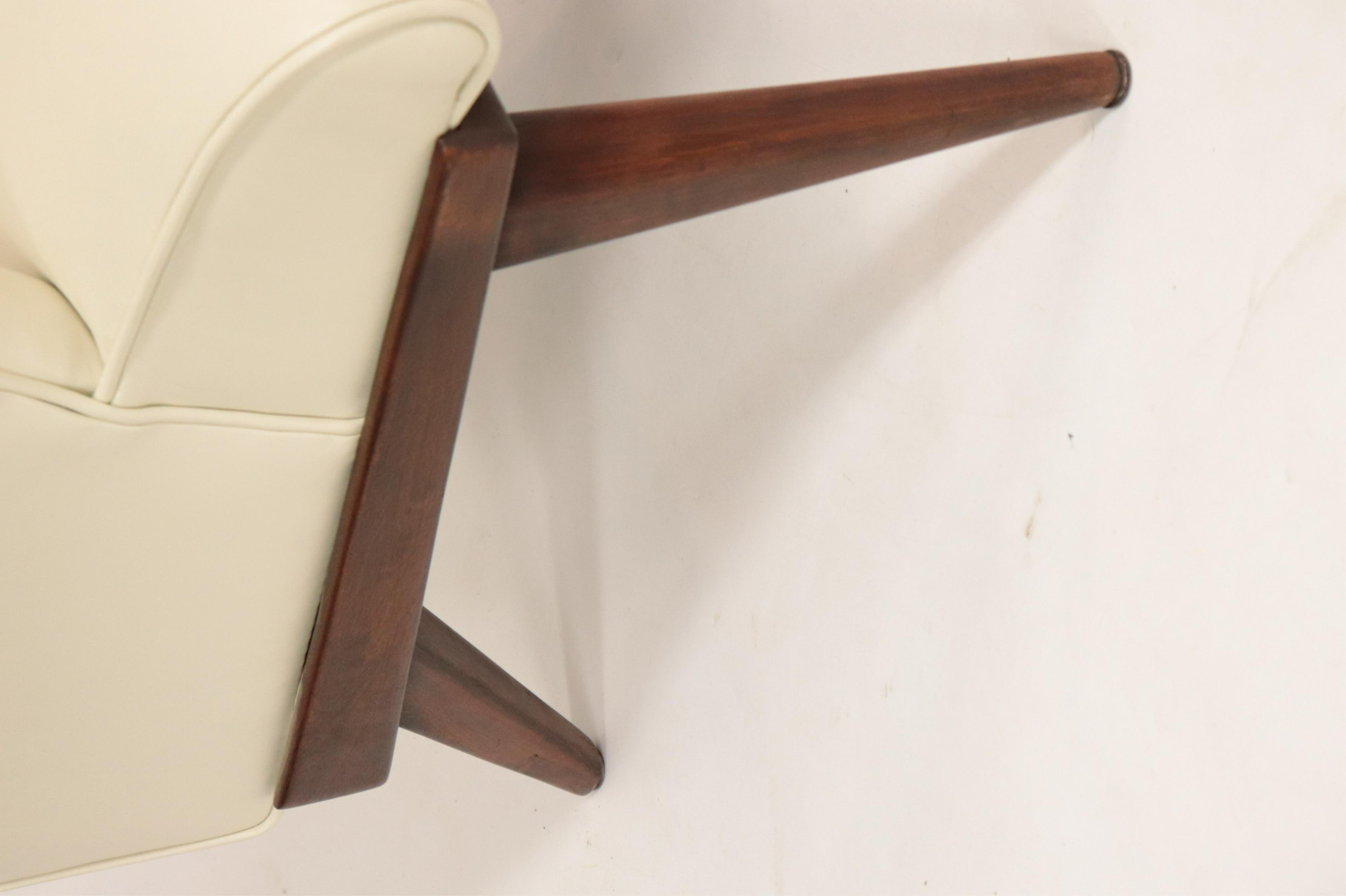 Mid Century Modern Mahogany White Leather Upholstered Armchair, circa 1950, in the manner of Hans Wegner Dimensions: 32" H x 24 1/2" W x 31" D (BIRD331)(MS)
