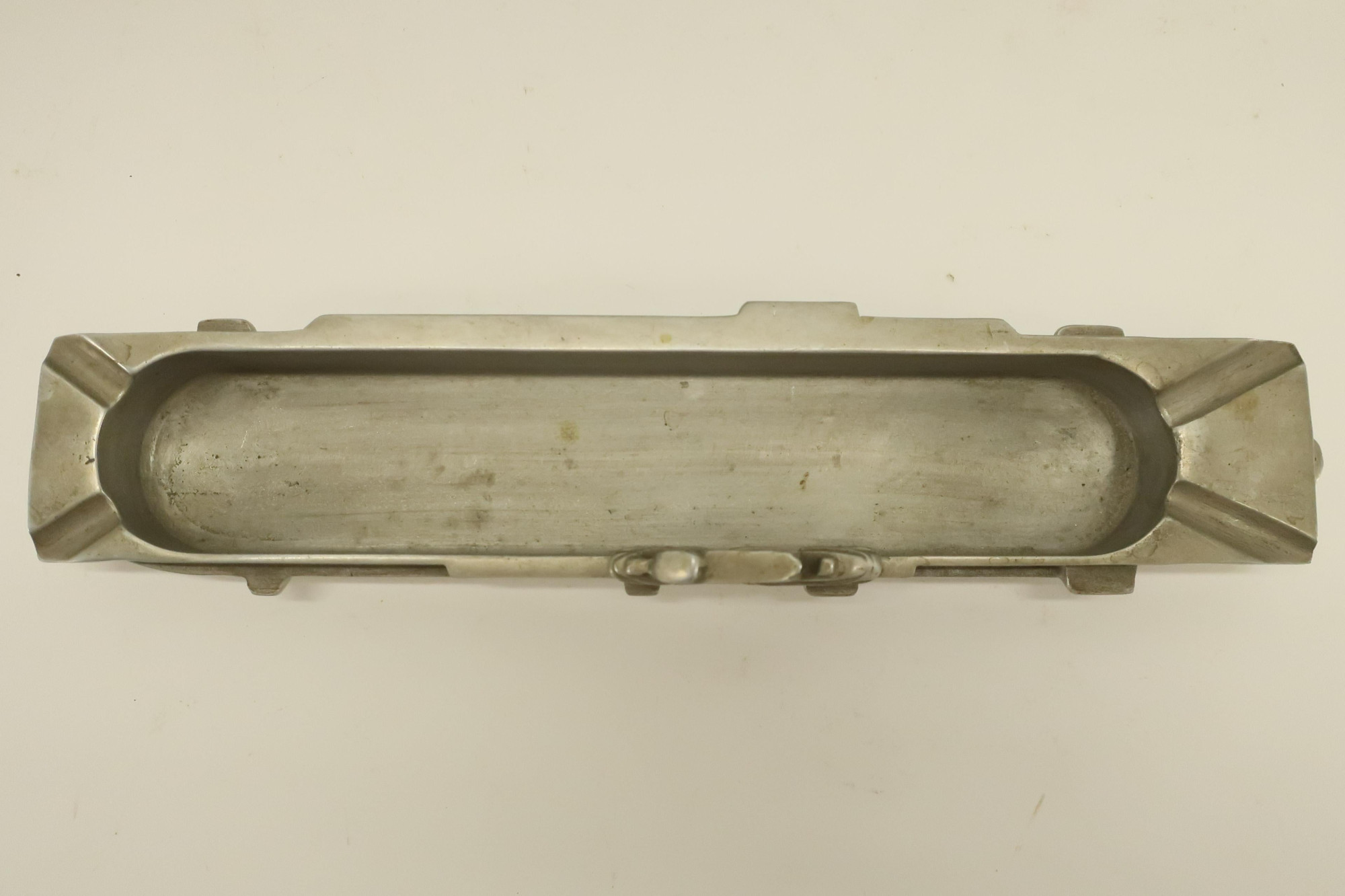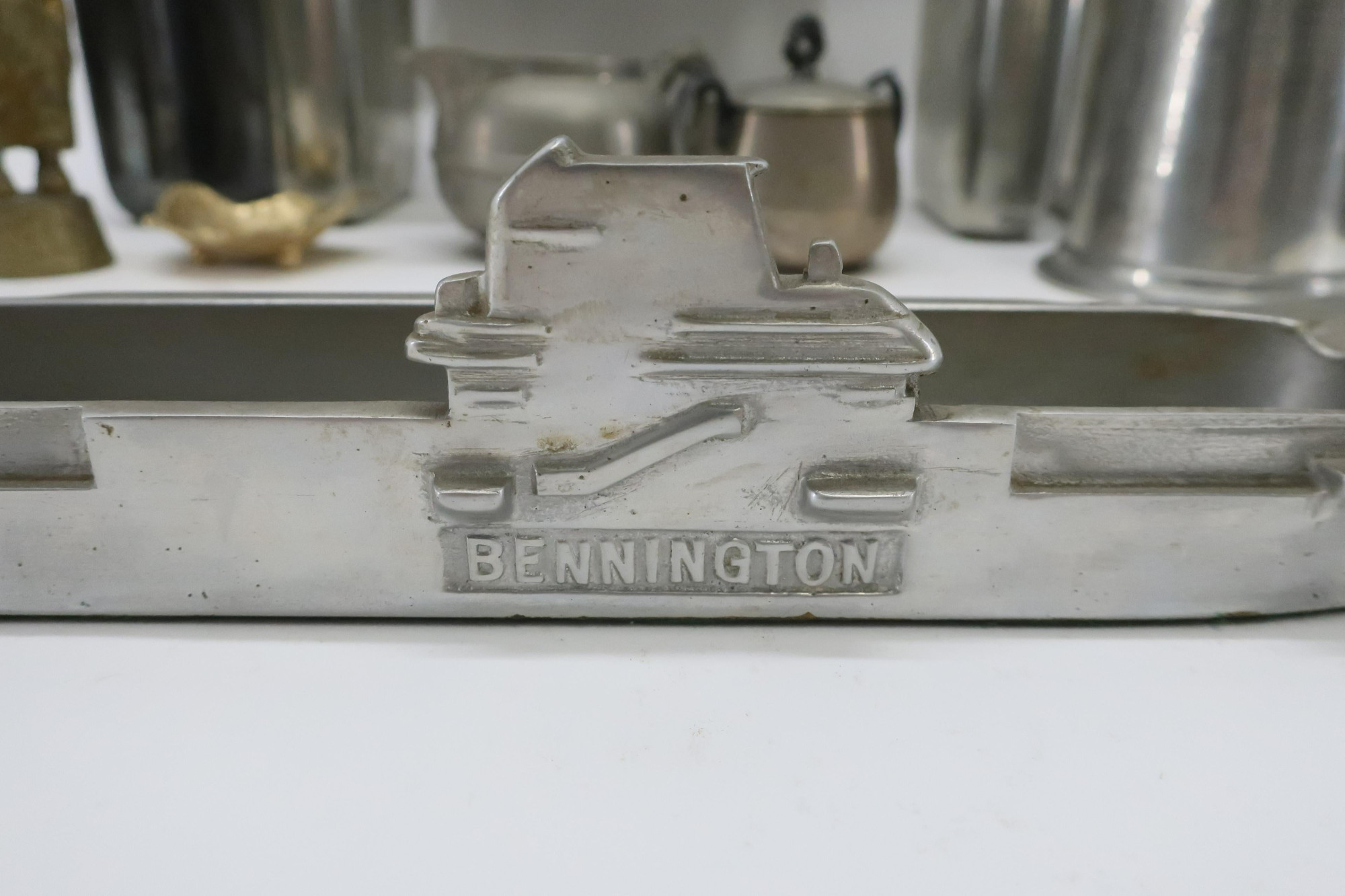 Metal Lot, includes aircraft carrier form aluminum ash tray, Arts & Crafts tray, gilt figure of a Dutch boy, flasks and more Dimensions: Carrier 13 1/2" L, Tray 21" L, Flasks 8 1/2" L (EDEL6196/lot)(WT)