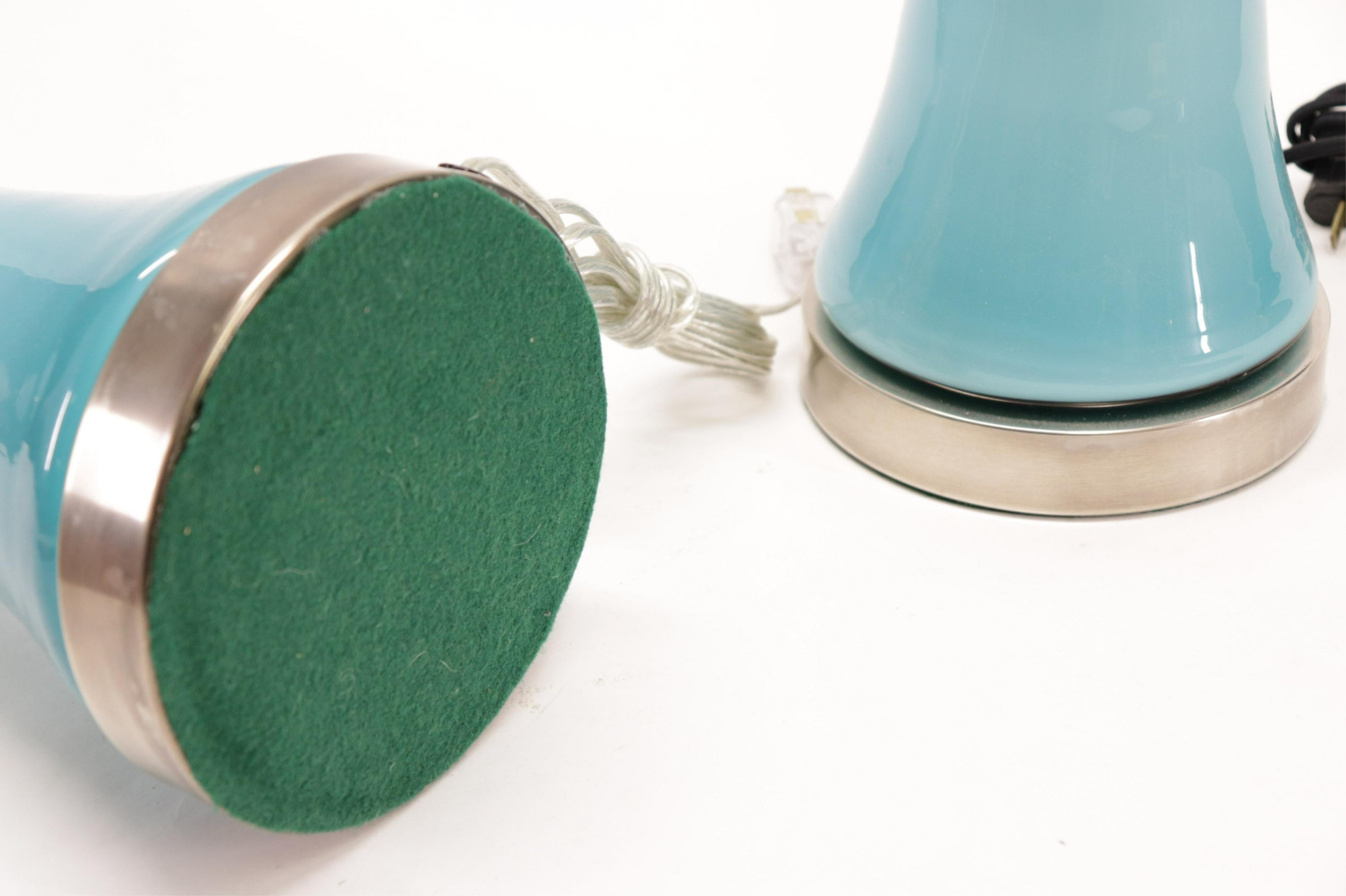 Pair Contemporary Teal Blue Glass Lamps, socket marked 'Sun Lite' Dimensions: Glass 24" H, overall 38" H (AHAN5342/2)(WT)