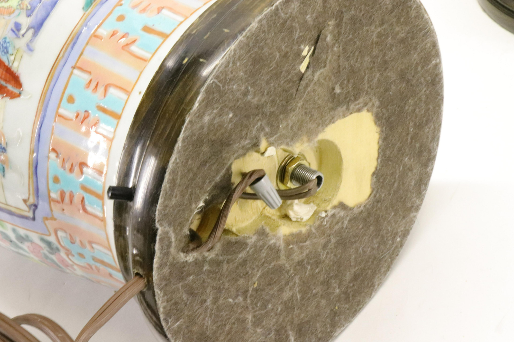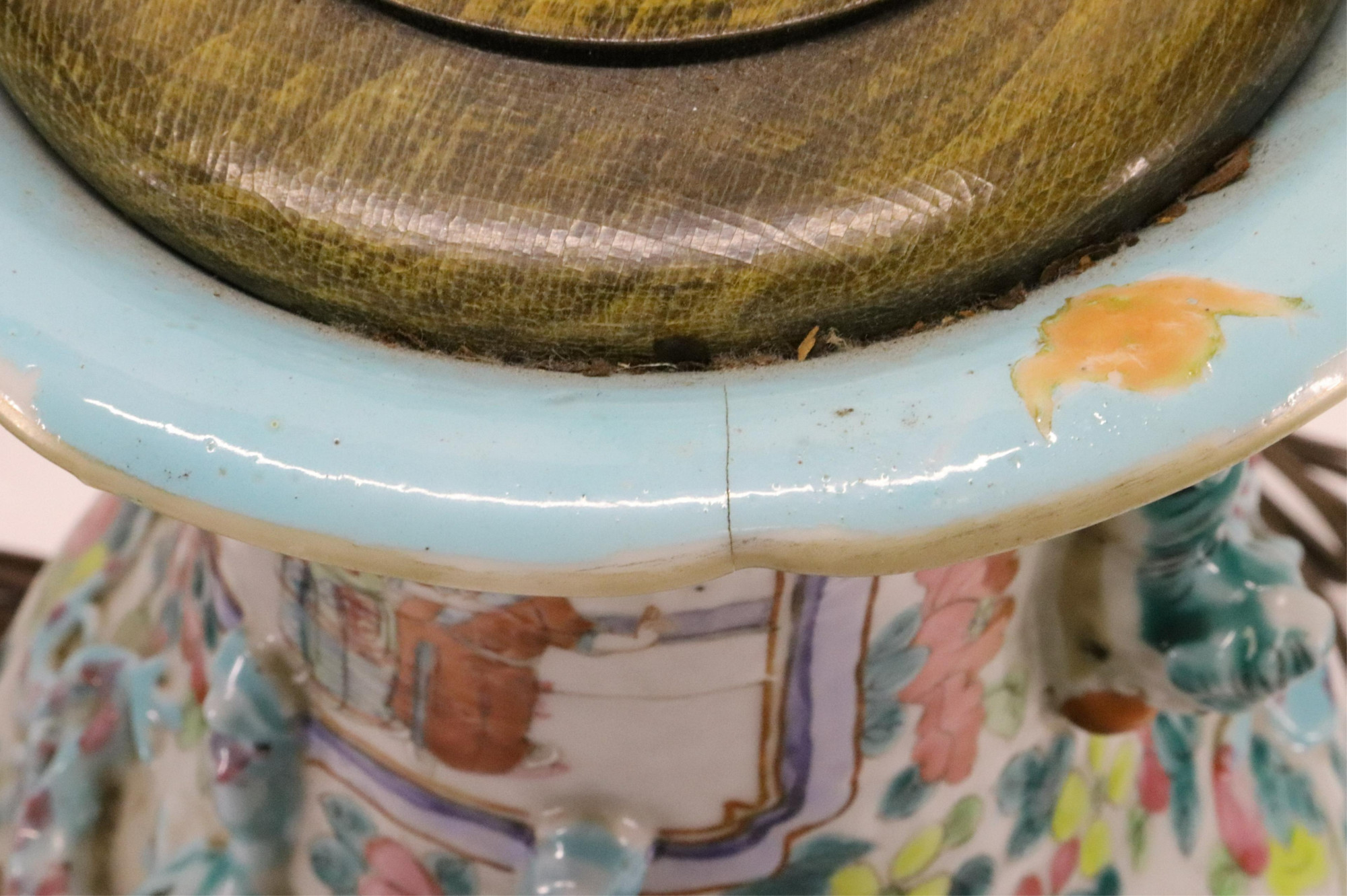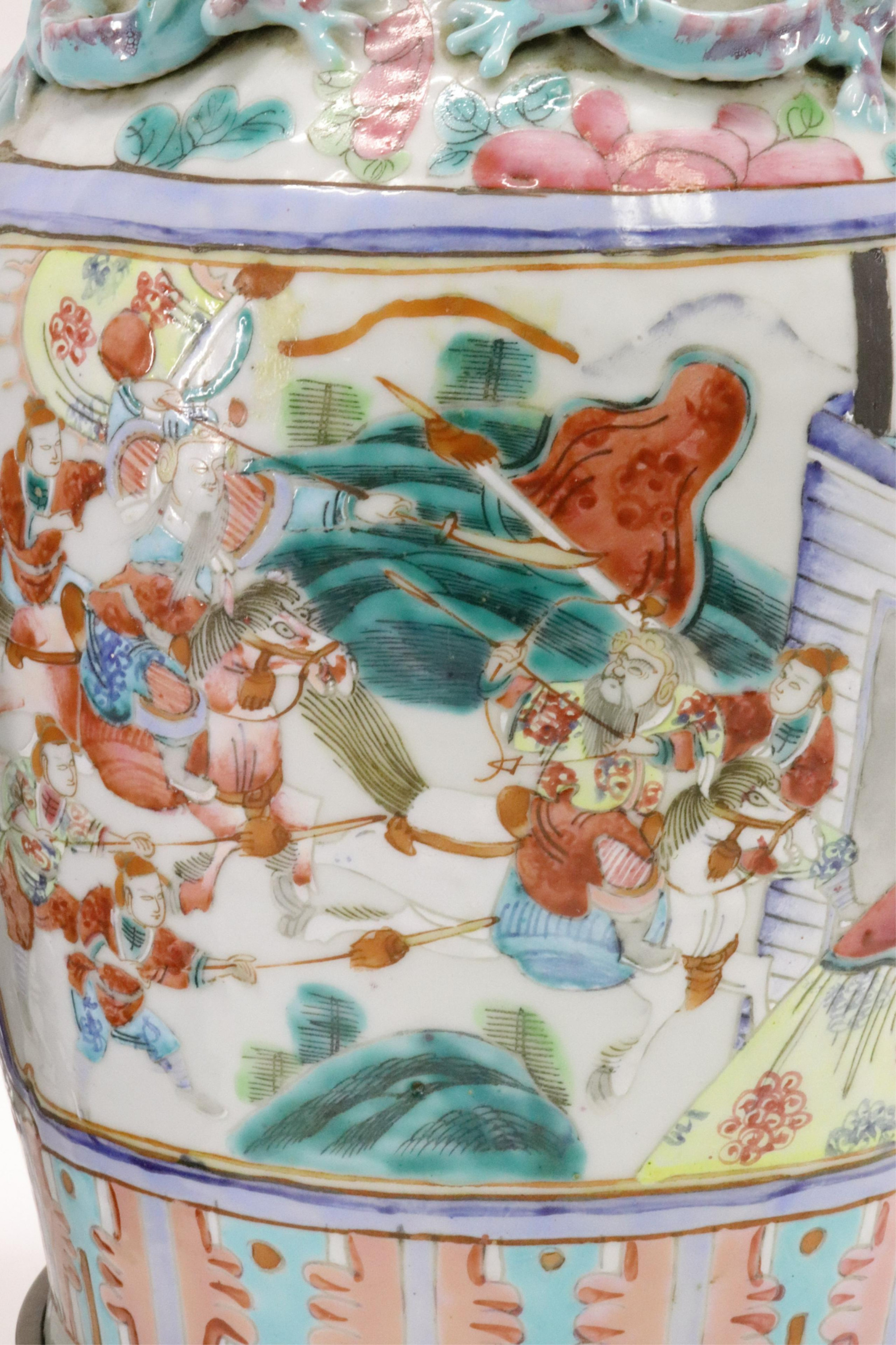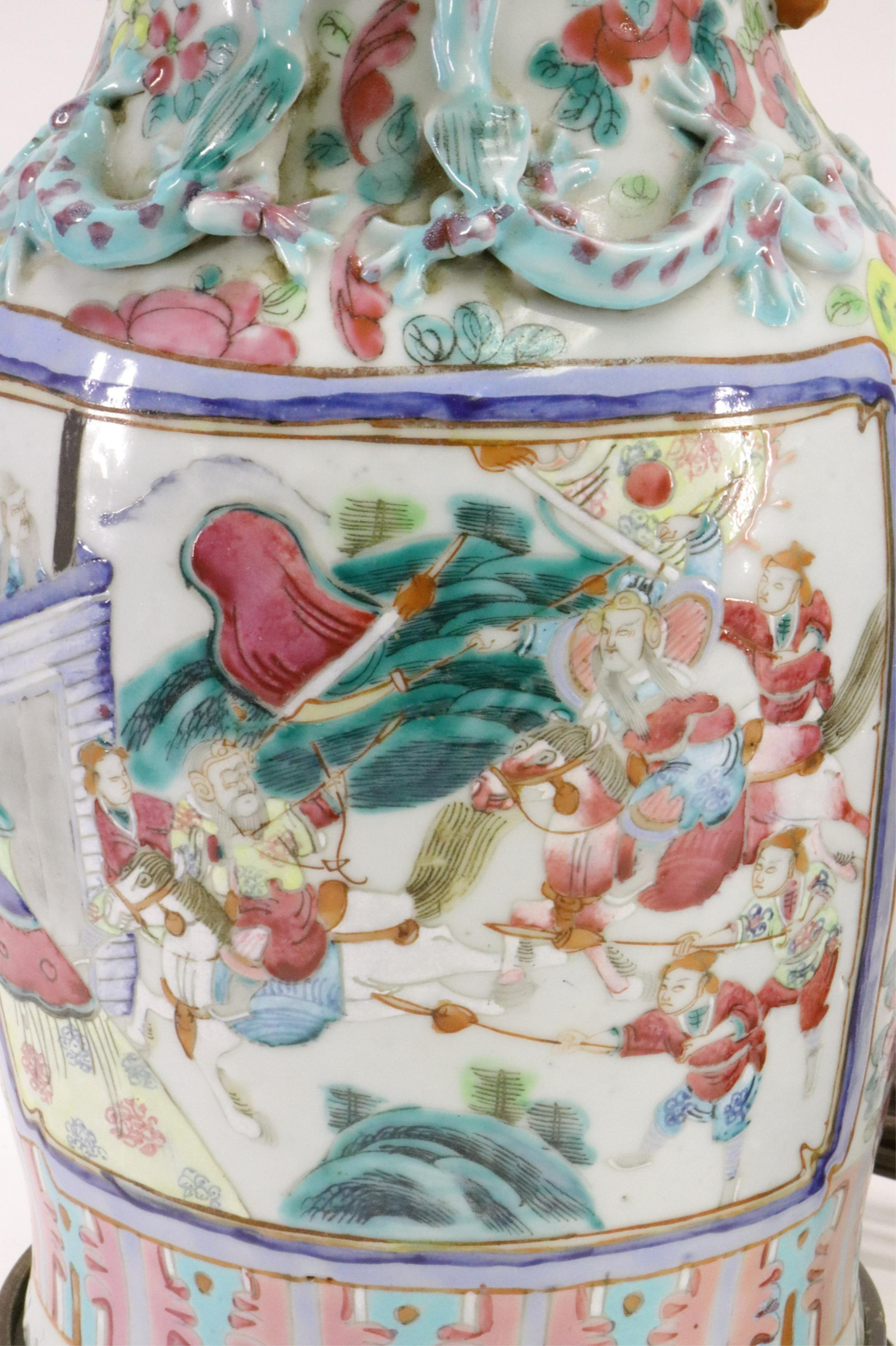 Chinese famille rose vases moderately well painted with fine detail and color with court and military scenes. Both have molded dragons and foo dogs and loved flaring rims. Dimensions: vases 14 1/2" high each (CAPS759)(PR)See More