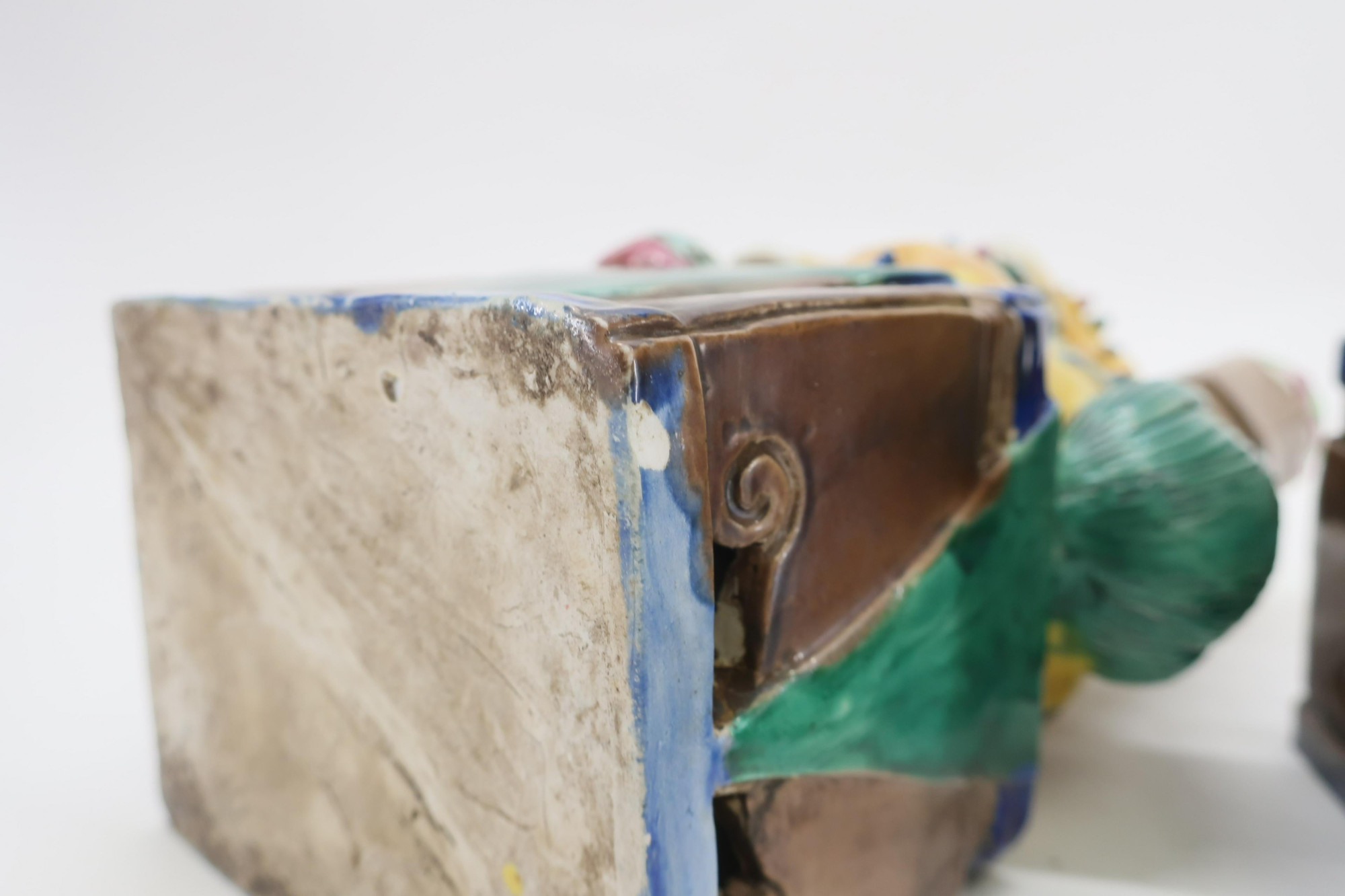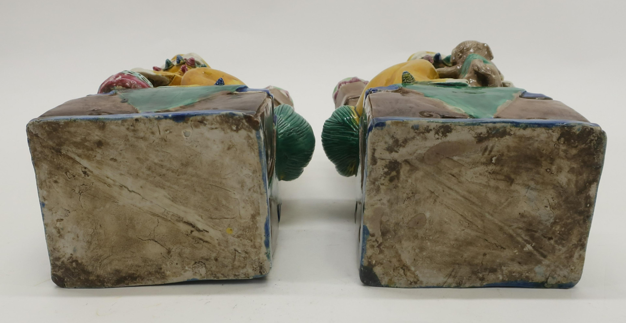 Well formed pair of Buddhist guardian lions in multiple color glazes on typical incorporated rectangular pedestals. One lion with cub and the other with loose ball. Both in the form of candle holders. Kangxi Style, late 19th-20th century.