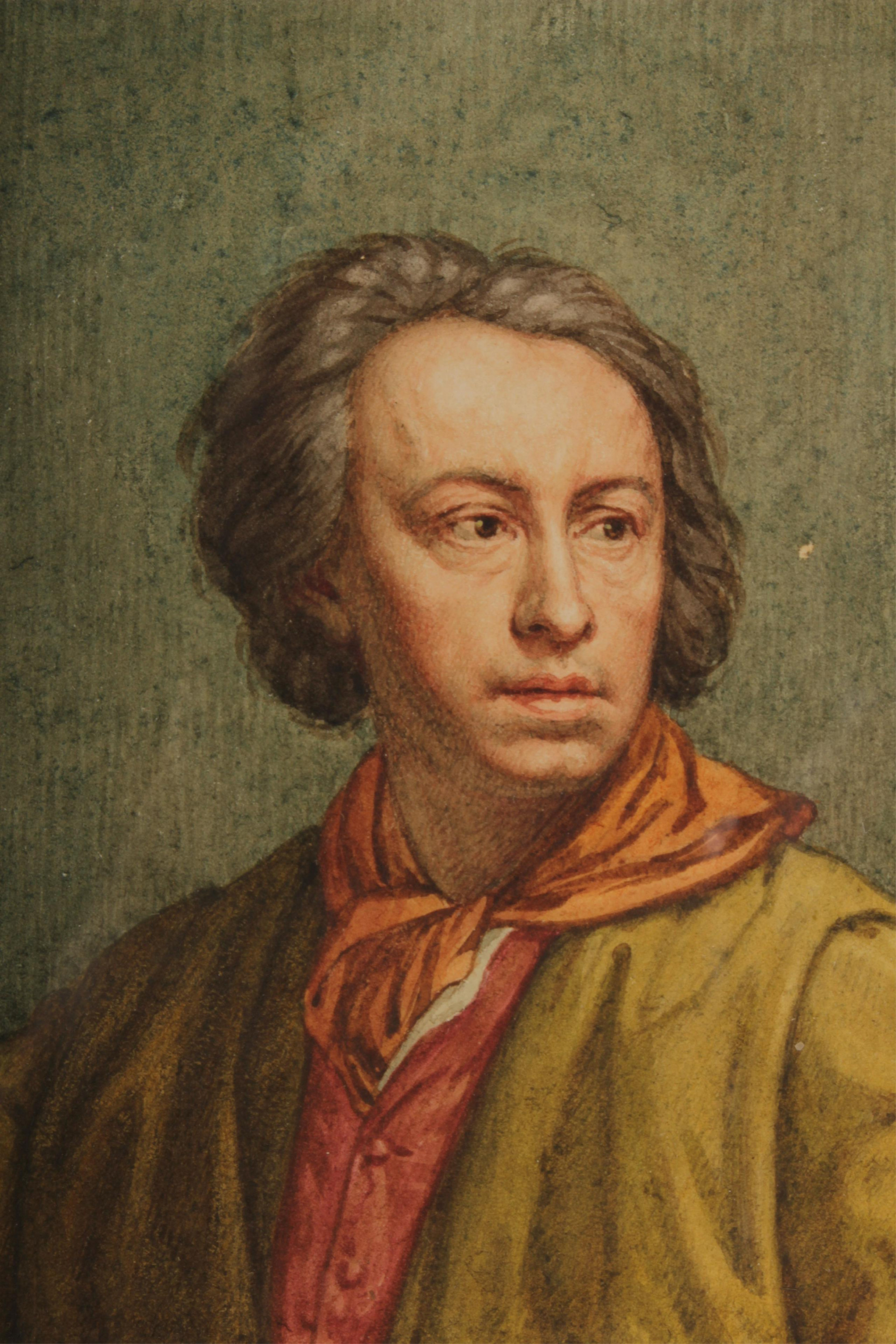 one of Anton Raphael Mengs after his self-portrait, the second after Cristofano Allori's self portrait, both originals in the Uffizi Galleries, these well done 19th c. Grand Tour watercolors, unsigned. One of a pair of Old Master self-portraits in this auction, each pair a partial set from group of six at Christies NY, January 28, 2010, lot 232, bought in. Dimensions: 4.5 x 3.1, framed 16x14 (PTIL549/2)(TC)See More