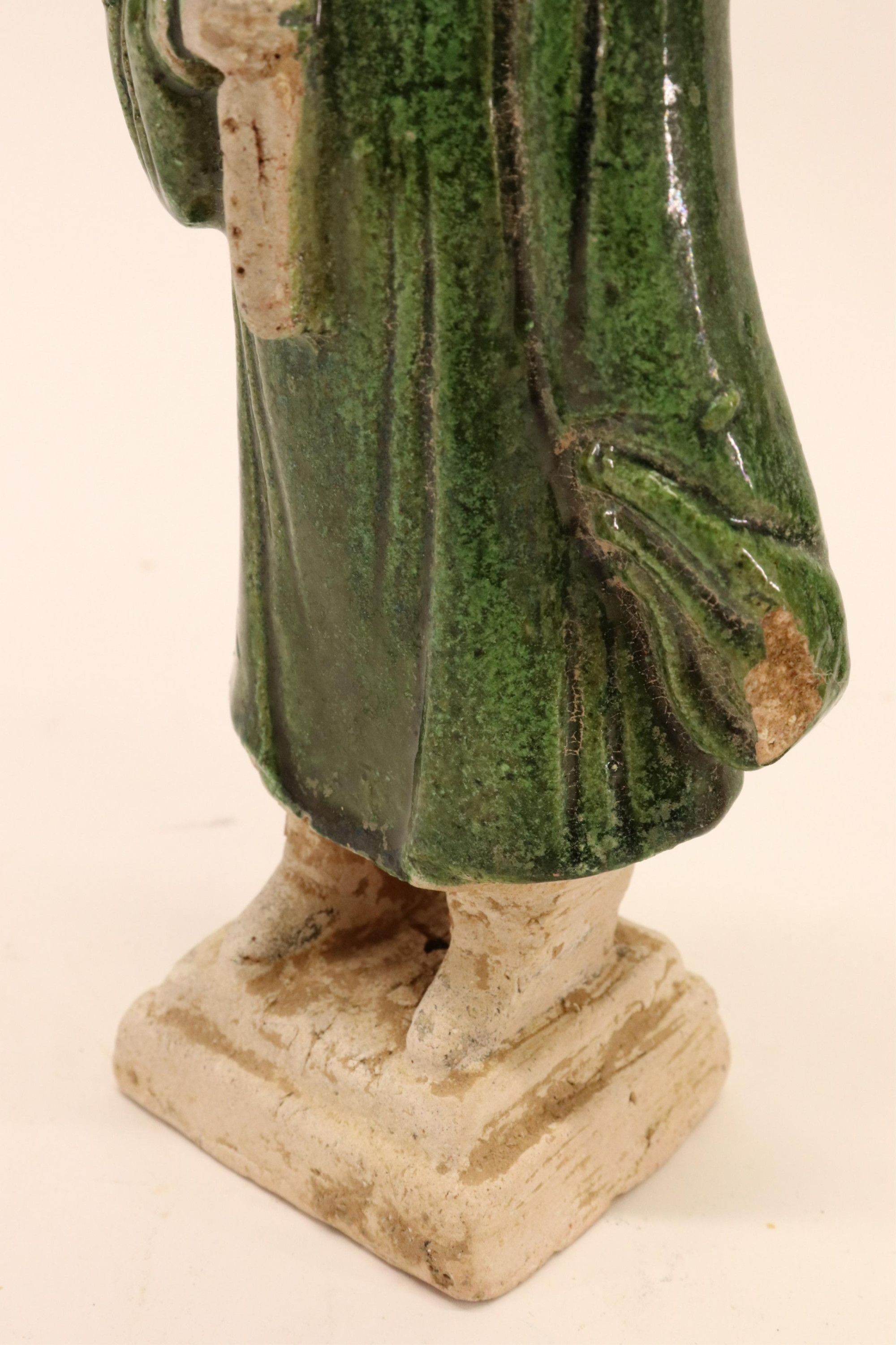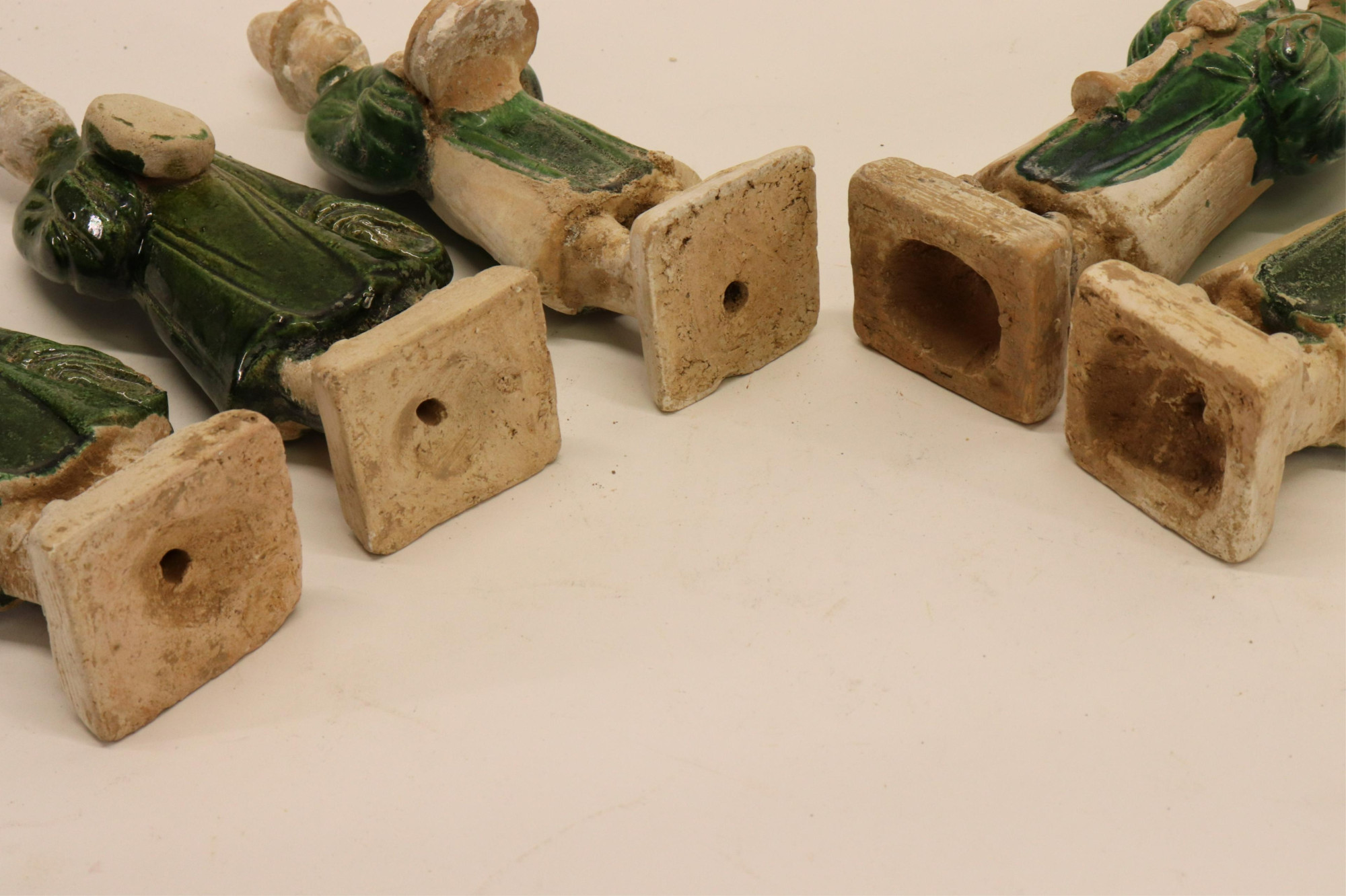 This group of green glazed figures each are holding different instruments and show remnants of pigments. Some areas of very nice patina and glaze iridescence. Likely not all originally of the same set. Ming Dynasty (1368-1644 CE). Purchased at Anthony J. Allen's Antiques, NZ, 2003. Dimensions: 7 7/8" to 8 1/4" high (BSTA738)(PR)See More