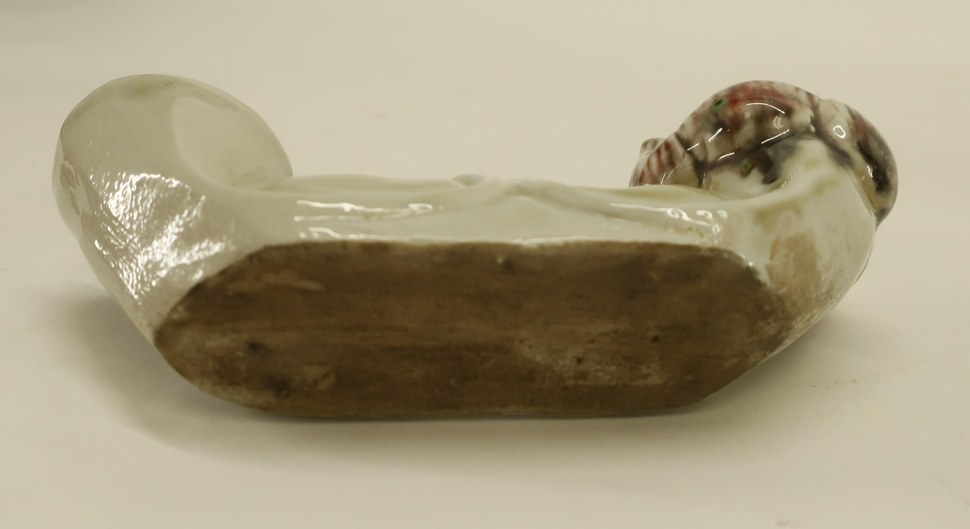 Lot includes three 19th century Kutani oyster shaped cups painted in flower and butterfly motif with gilt accents. One has small firing crack to rim. Offered along with small porcelain lion water dropper and lotus brush rest and washer. Possibly Japanese as well, 20th century. Dimensions: 5" long each (BSTA568)(PR)See More