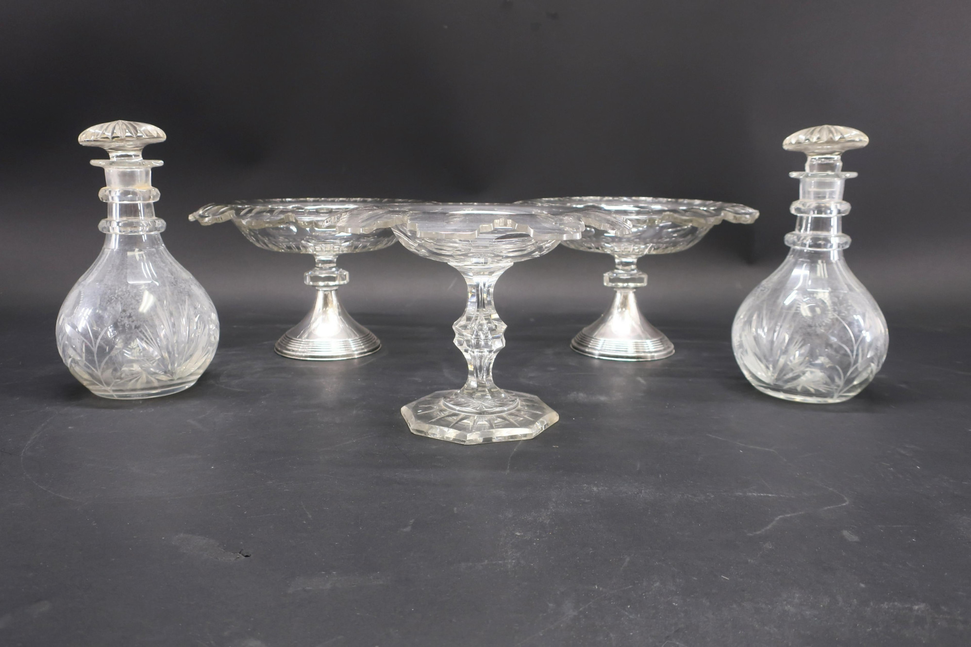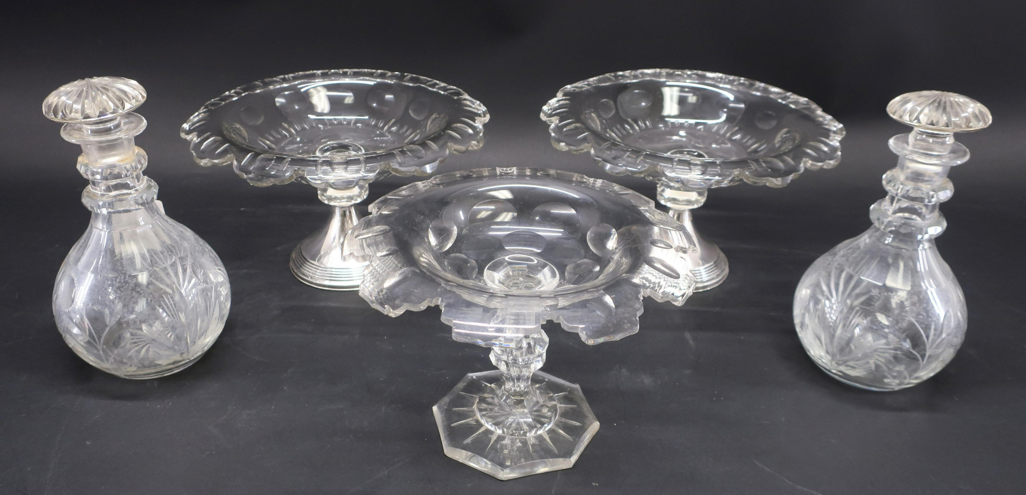 Two as a pair with silver bases, one all glass with octagonal base. Silver marks on bases. Two cut glass decanters with stoppers. Dimensions: (2) 6.5"H x 11.25 dia. (1) 6 5/8 x 9.5 dia. decanters 9.25H (BSTA6132/3)(JP)