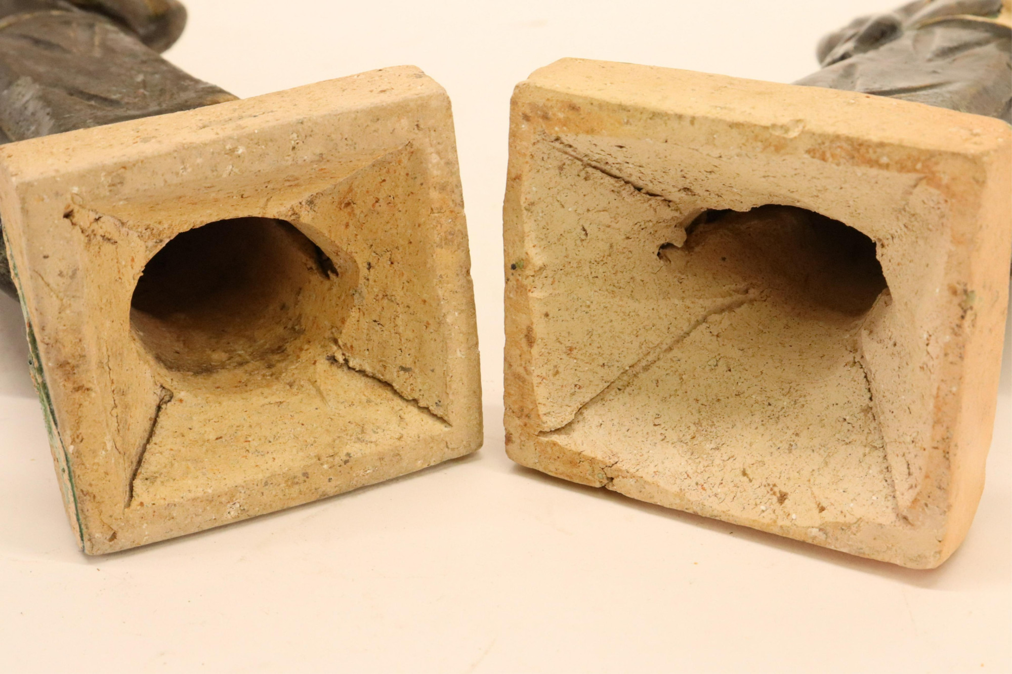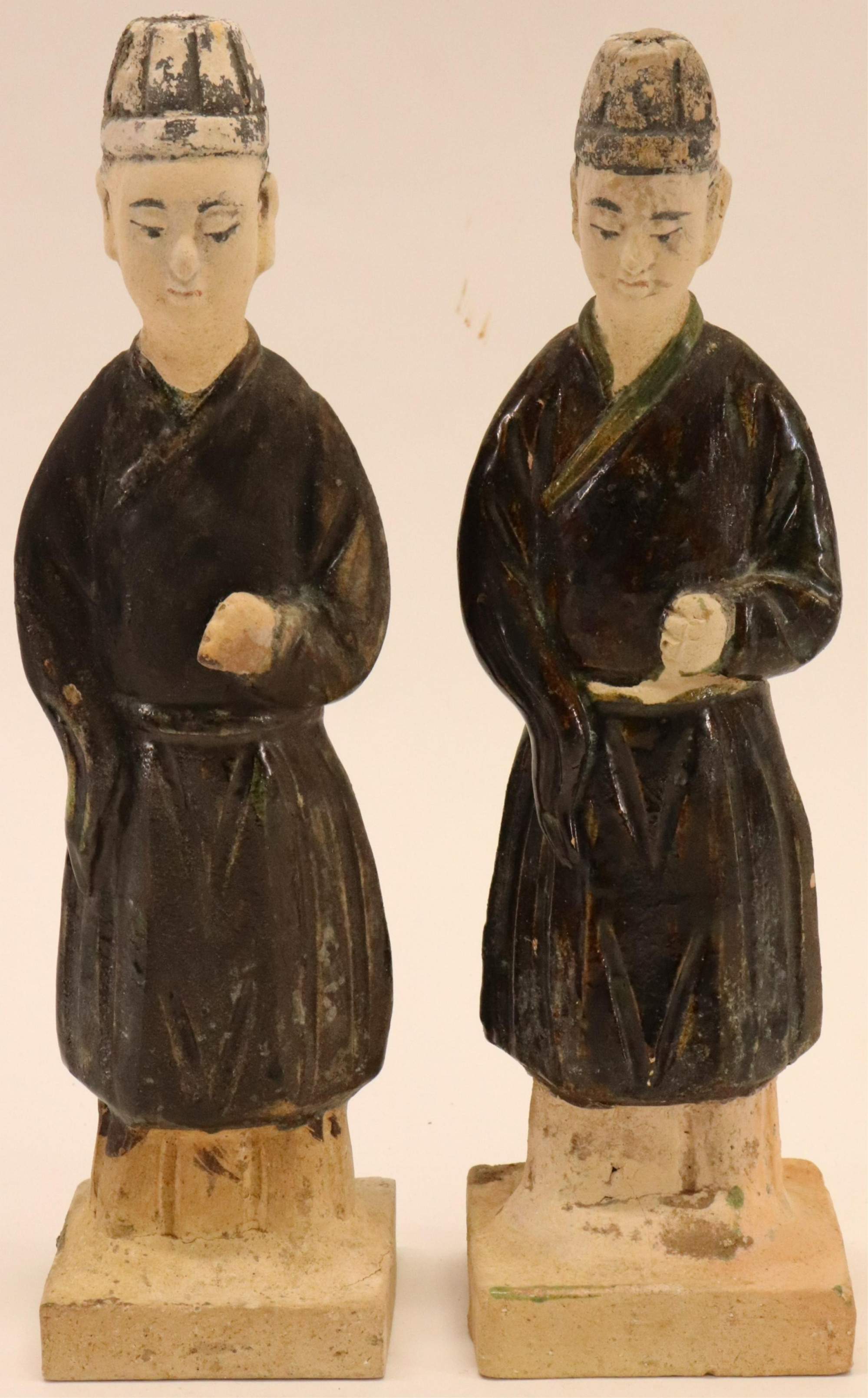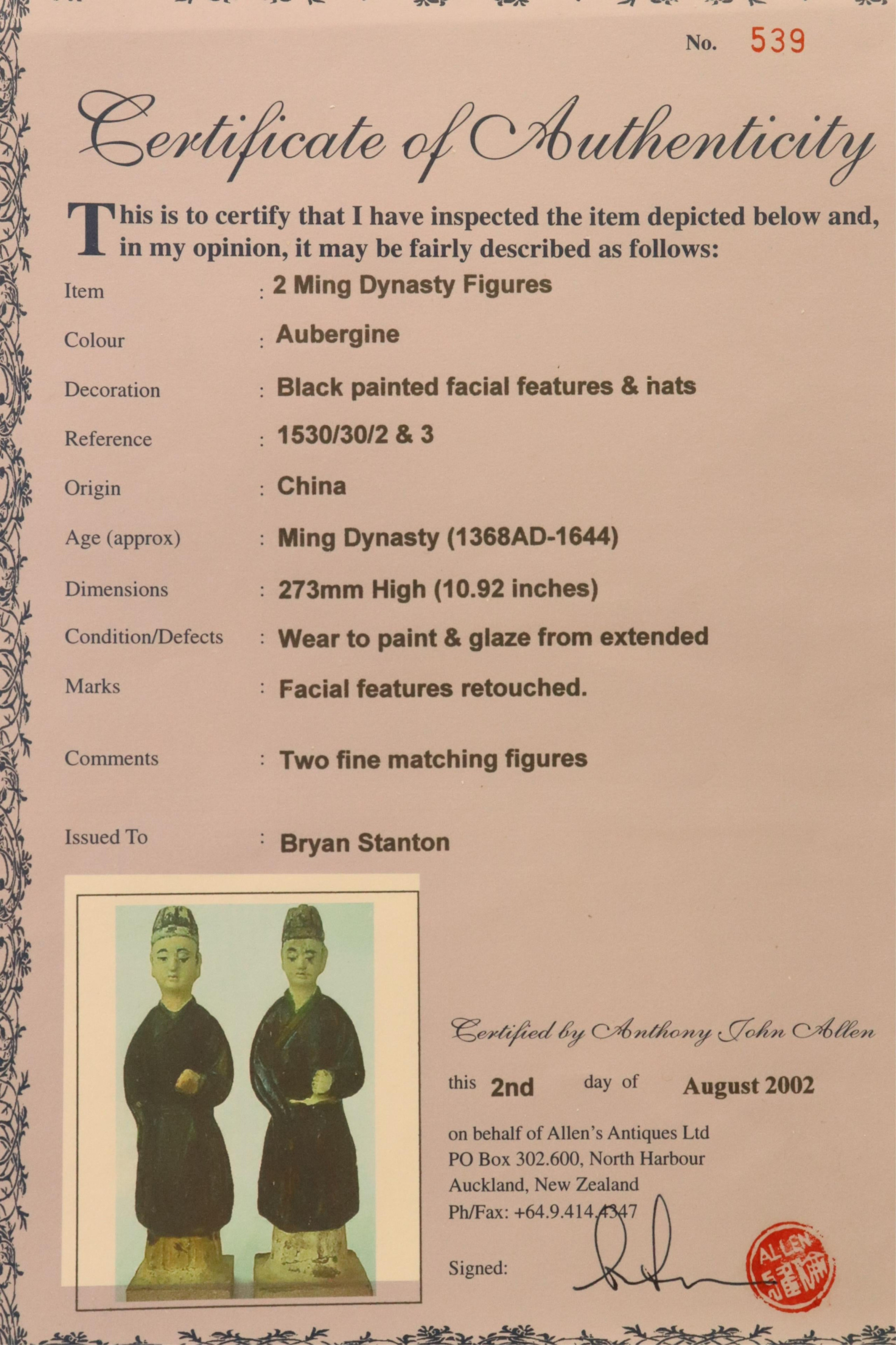 Well molded figures in dark green/black glazed robes and black painted faces and headgear. Ming Dynasty (1368-1644 CE). Purchased at Anthony J. Allen's Antiques, NZ, 2002. Dimensions: 11" high each (BSTA737)(PR)See More