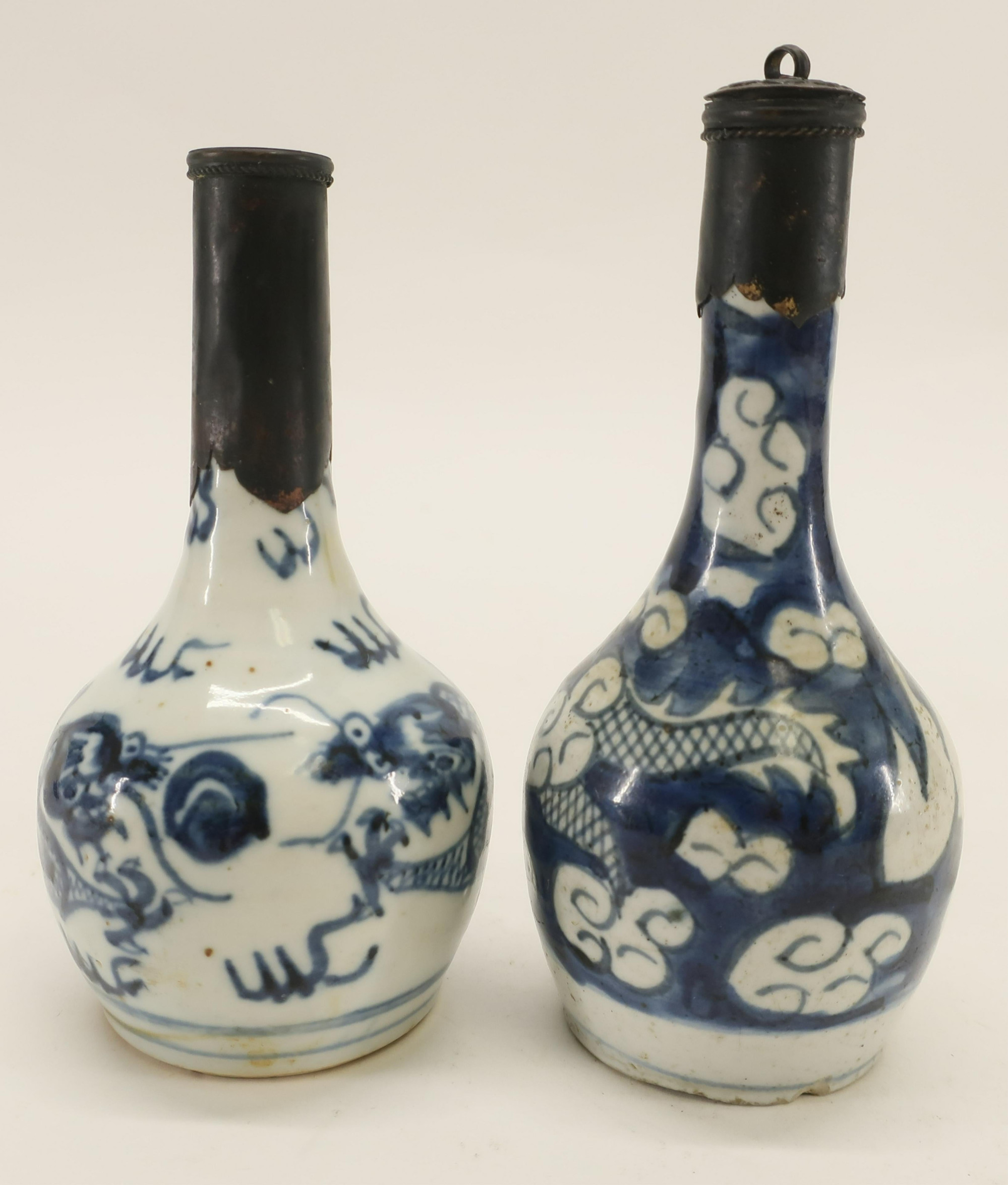 Two porcelain bottle in folk-style dragon motifs both with a later added pewter cap. One with an intact lid on chain and the other (cap added after break to original lip) with lid missing). Dimensions: 6" and 5.5" high (BSTA565)(PR)See More