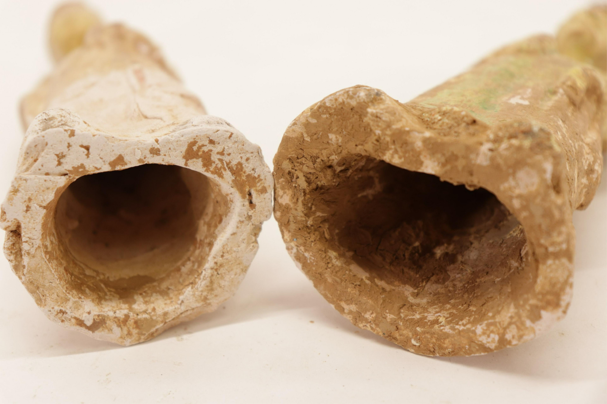 Two molded figures with remnants of light straw/celadon glaze. Likely Tang Dynasty (618-906 CE). Dimensions: 9" and 8.5" high (BSTA556)(PR)