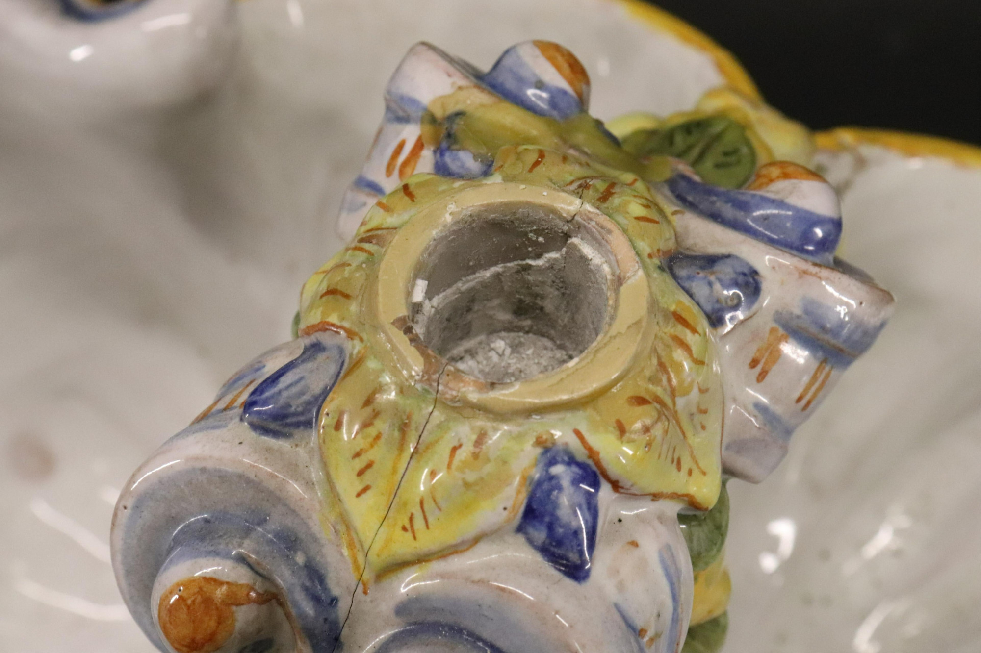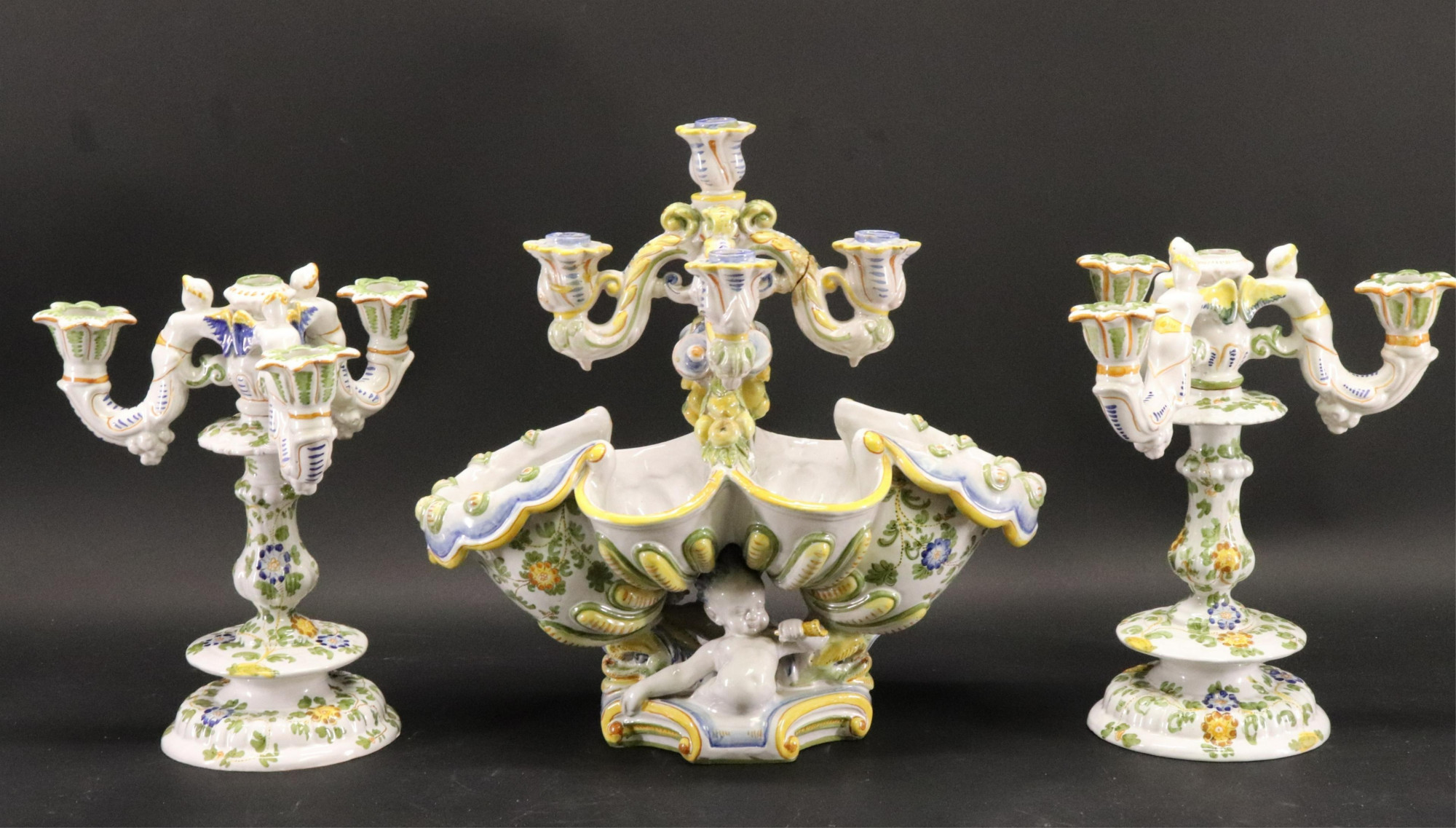 Ulisse Cantagalli Large Faince Majolica Putti Table Centerpiece with flanking candelabra, along with a contemporary glazed ceramic 4 part vase and a reticulated ceramic basket made in Portugal, all pieces marked From a Pawling New York Home Dimensions: centerpiece 17 1/2 x 19 x 10, flanking candelabra 14 x 10 (USPR6400/5)(MM)See More