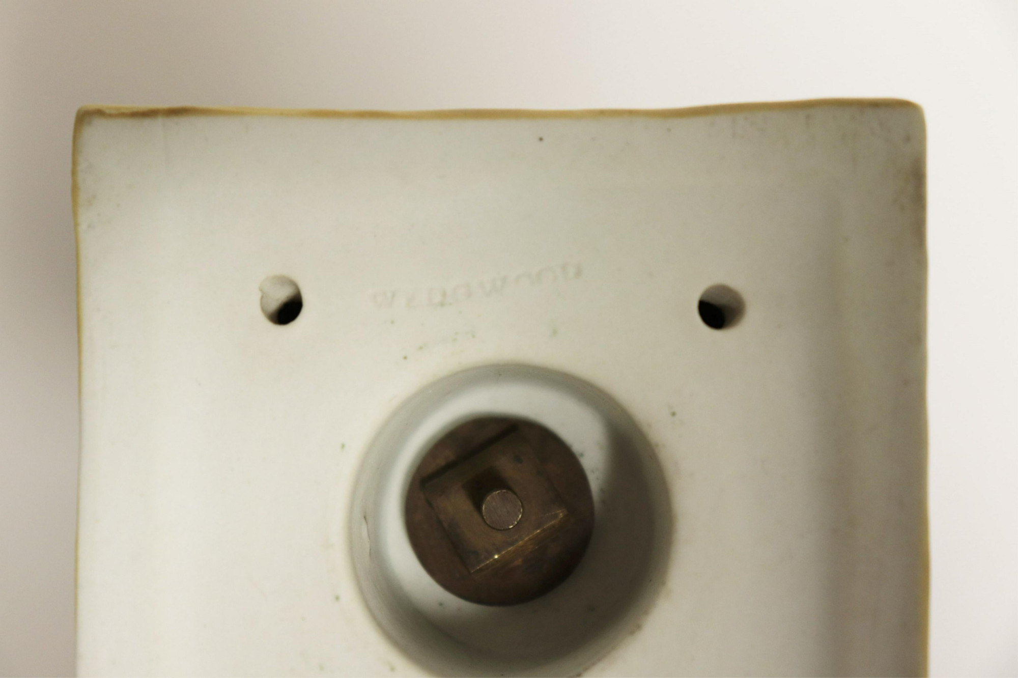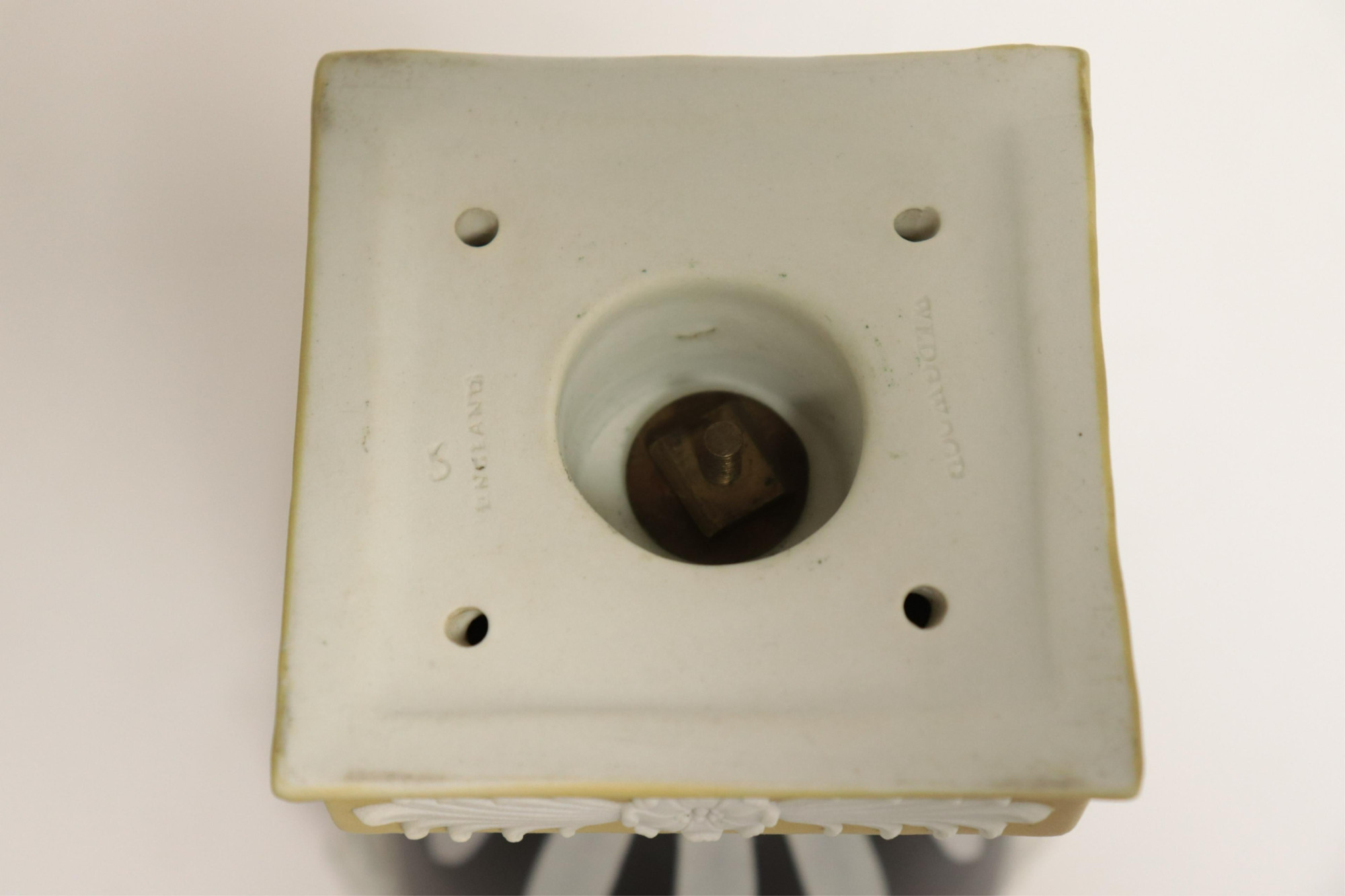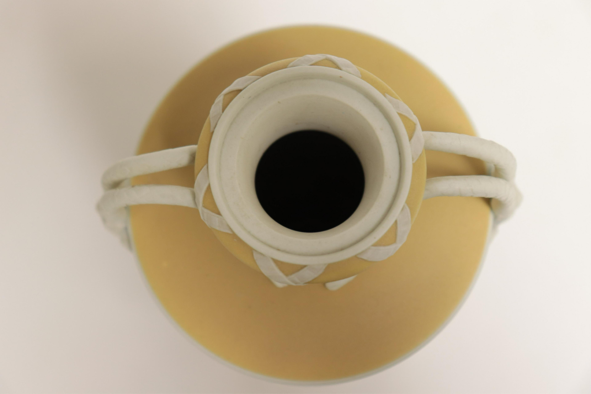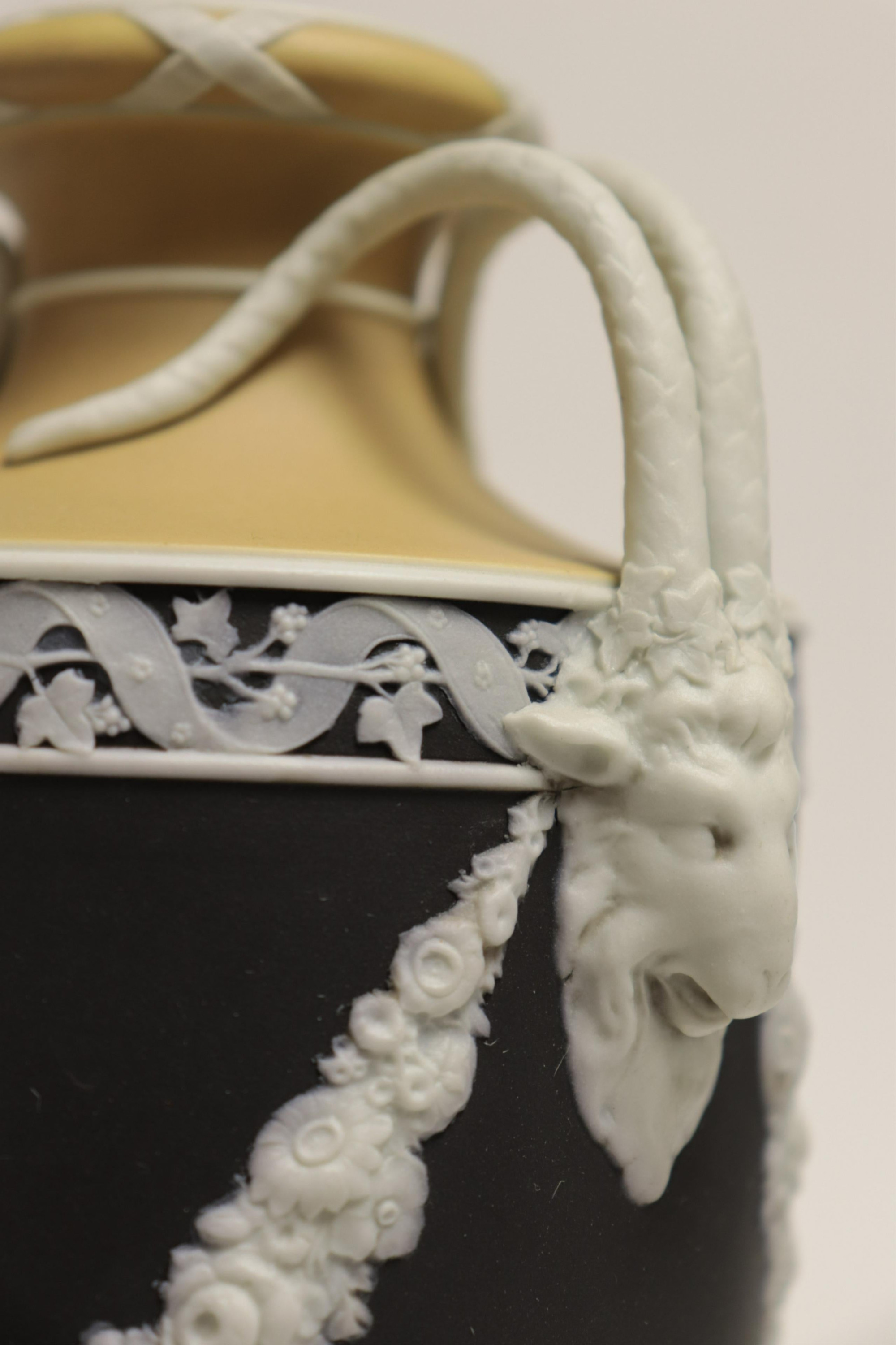 Wedgwood 3-Color Jasper Dip Covered Urn, impressed mark & England, black ground with two applied yellow & white cameos, floral swags, ribbon, meander & leaves, goat's head/horn handles
