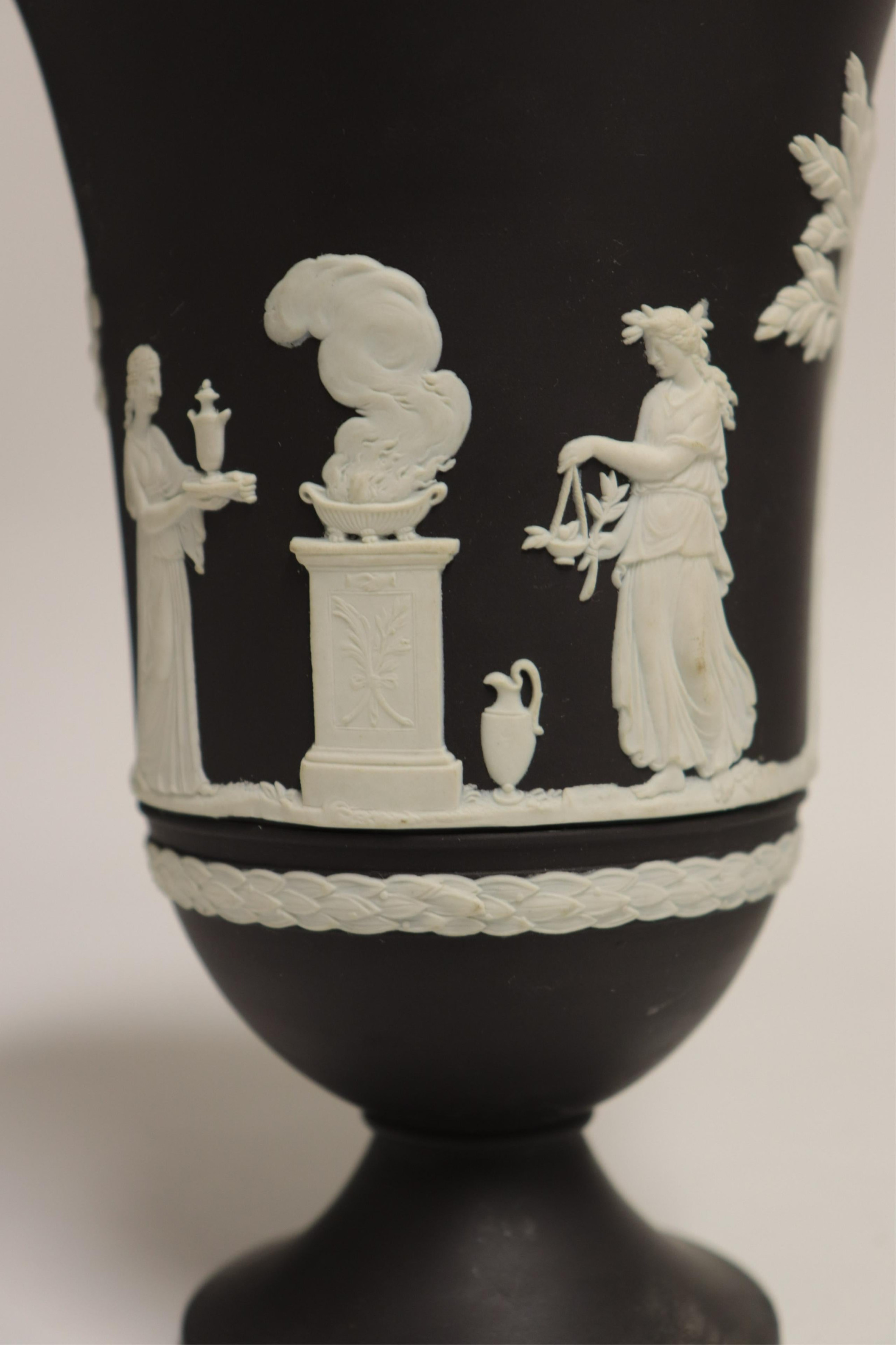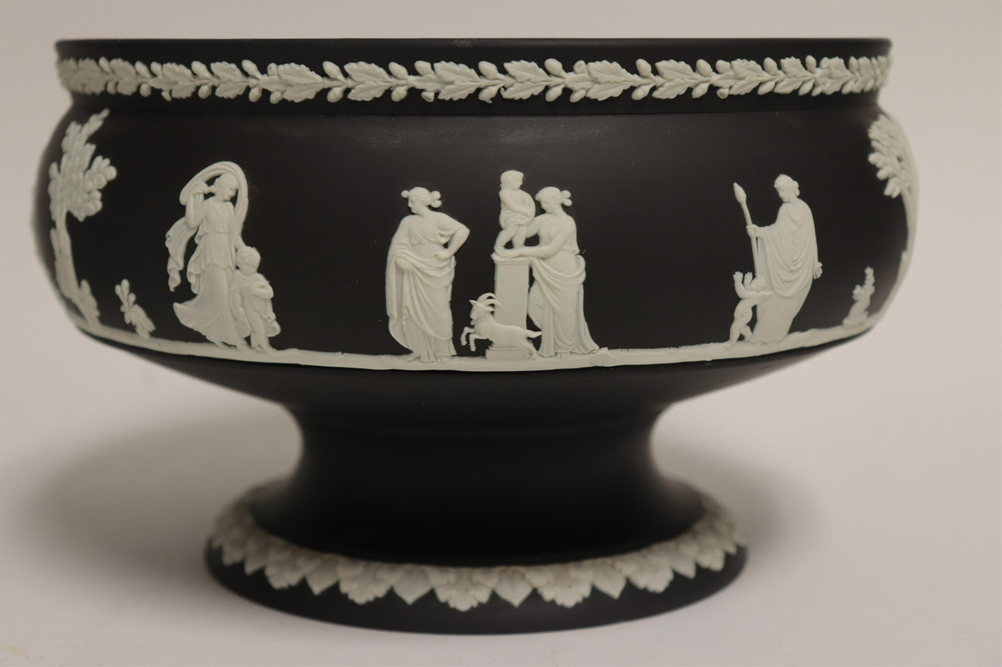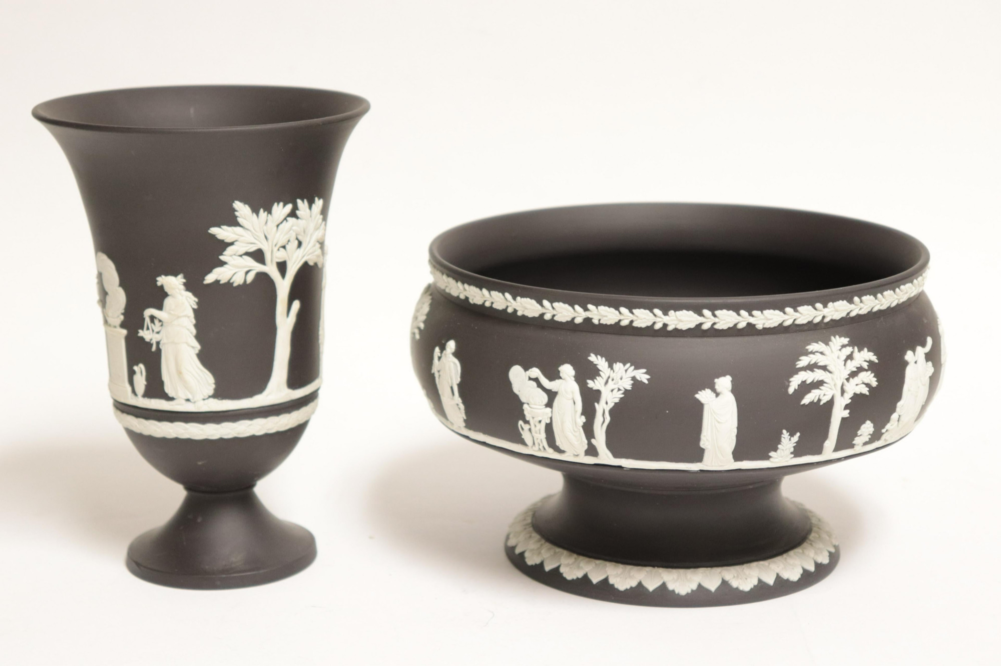 Wedgwood Black Basalt Pedestal Bowl & Pedestal Vase, both impressed mark & Made in England, applied white decoration (2 pc.)