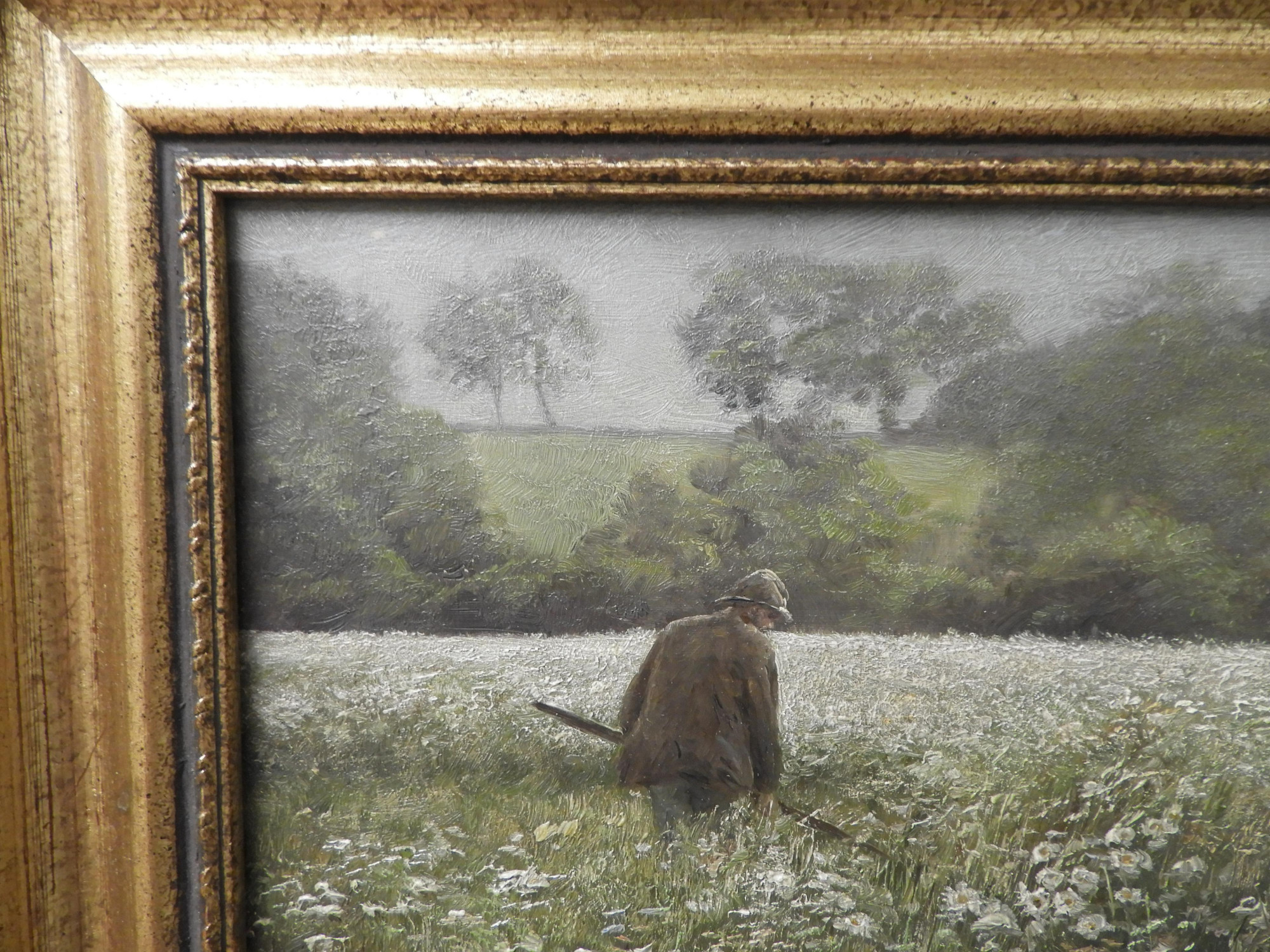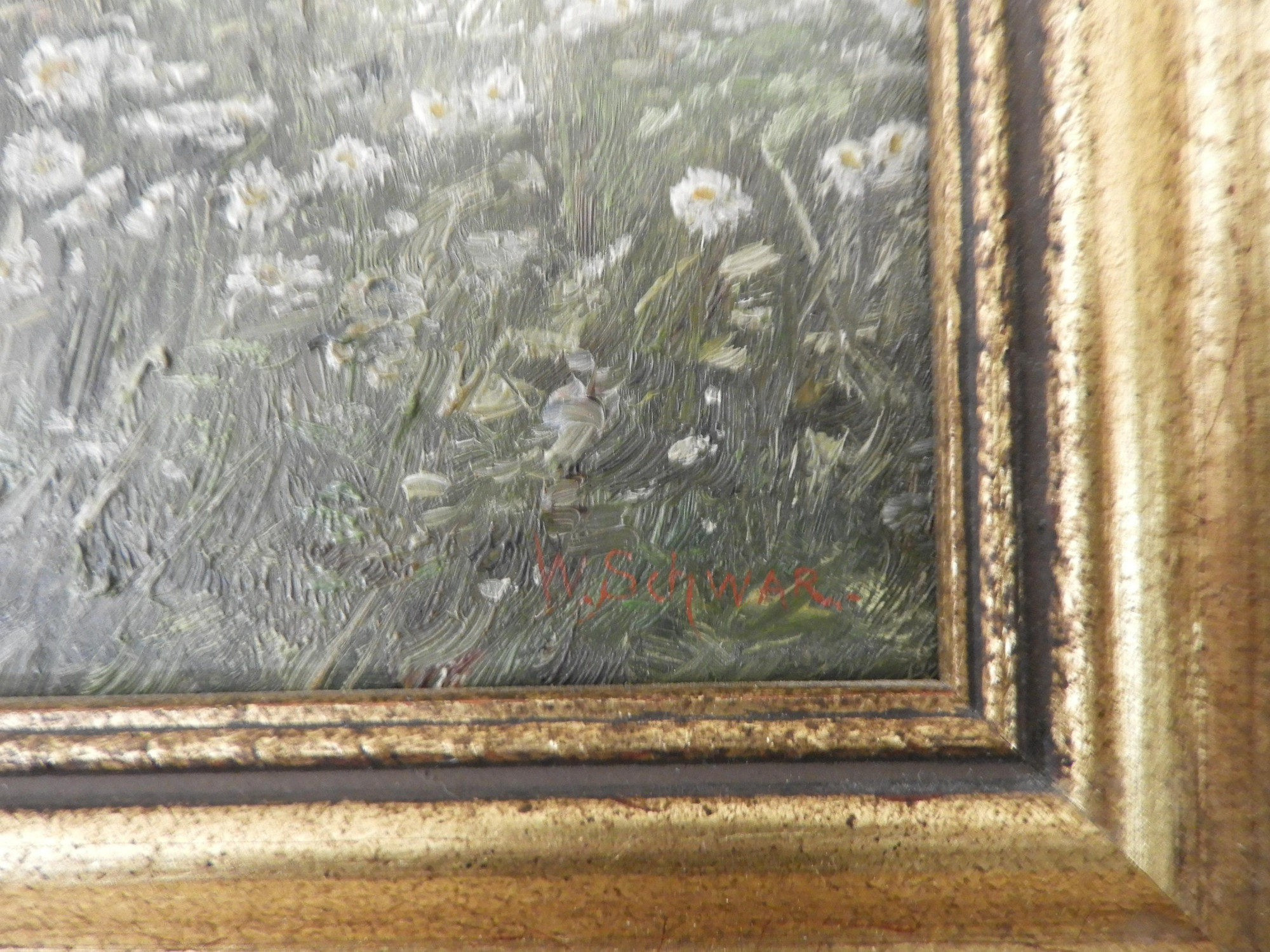 Wilhelm Schwar (German, 1860 - 1943). Oil on board depicting a peasant working in a field. Signed W. Schwar lower right. Dimensions: 6.5 x 9 Framed: 10.25 x 12.5" (KROB292)(EL)